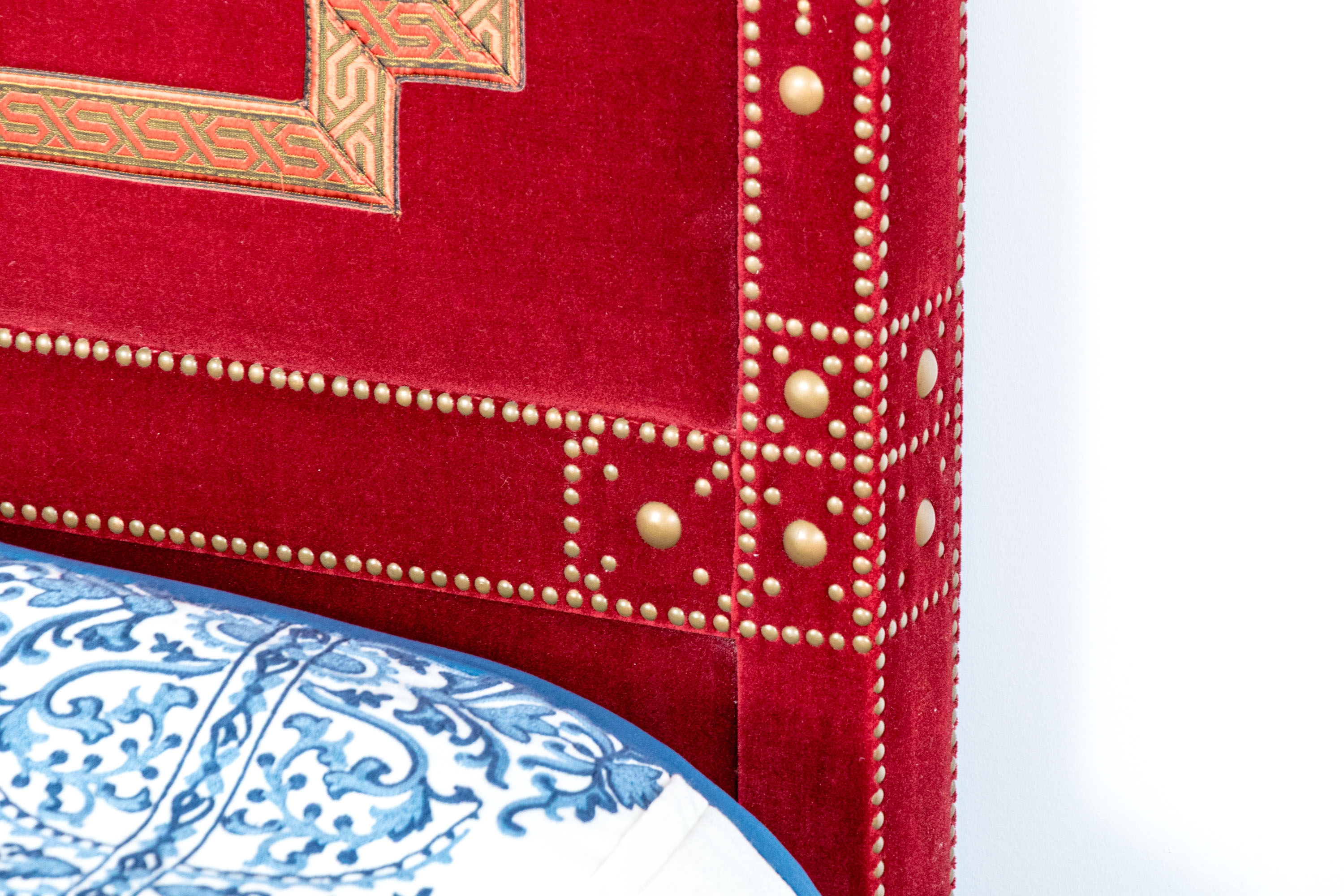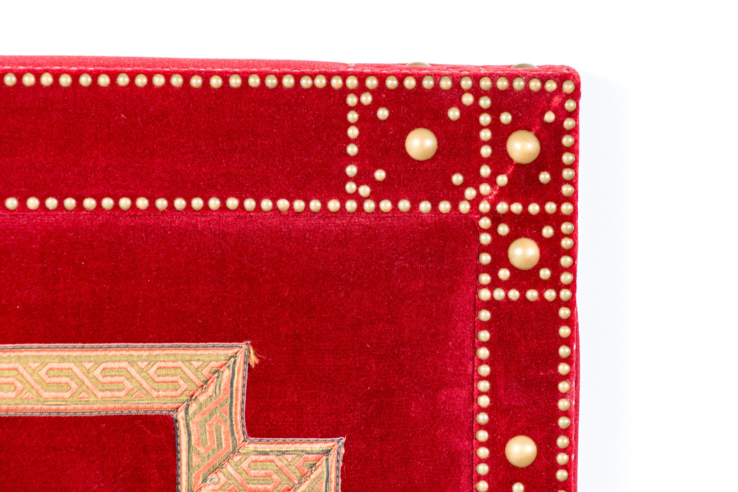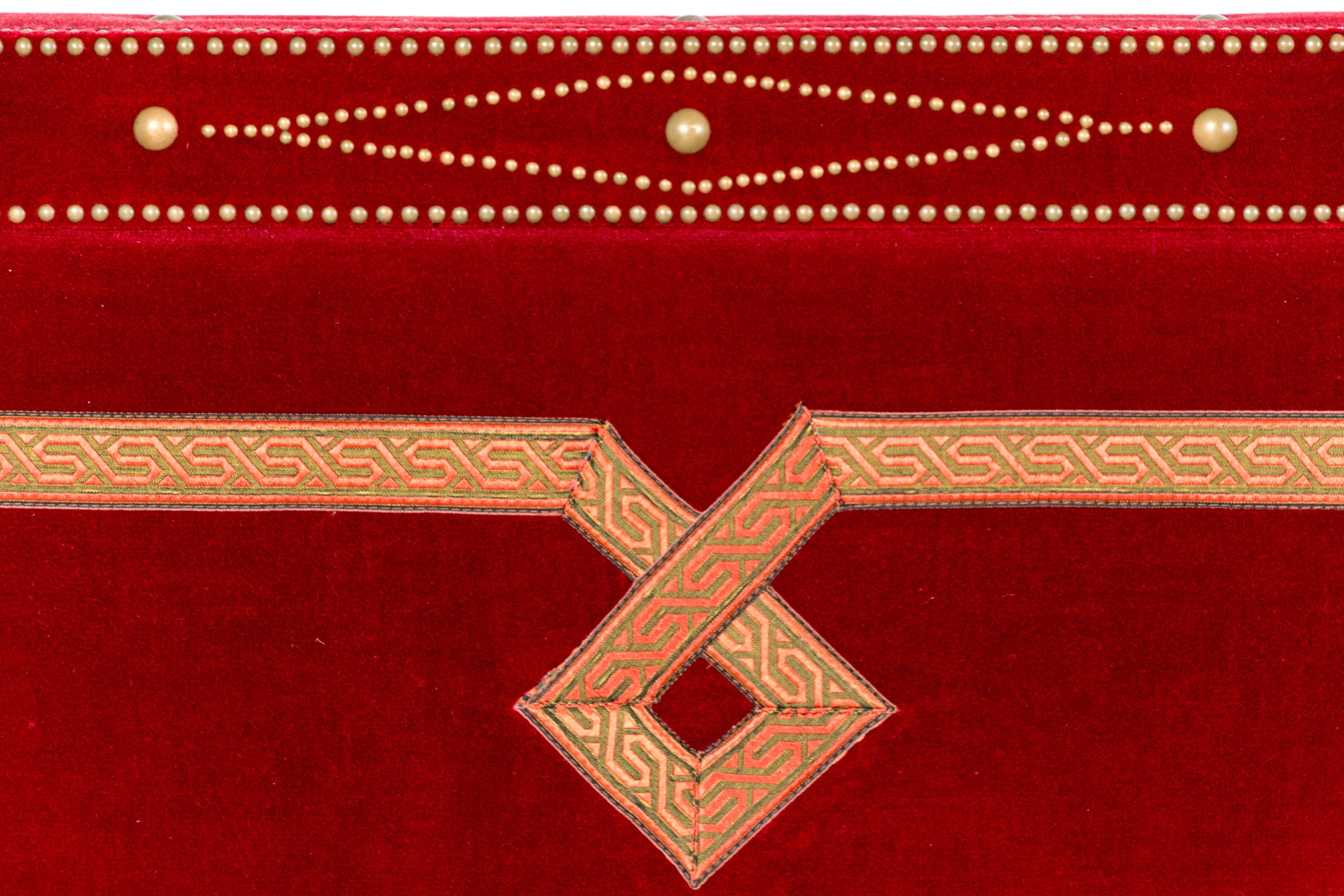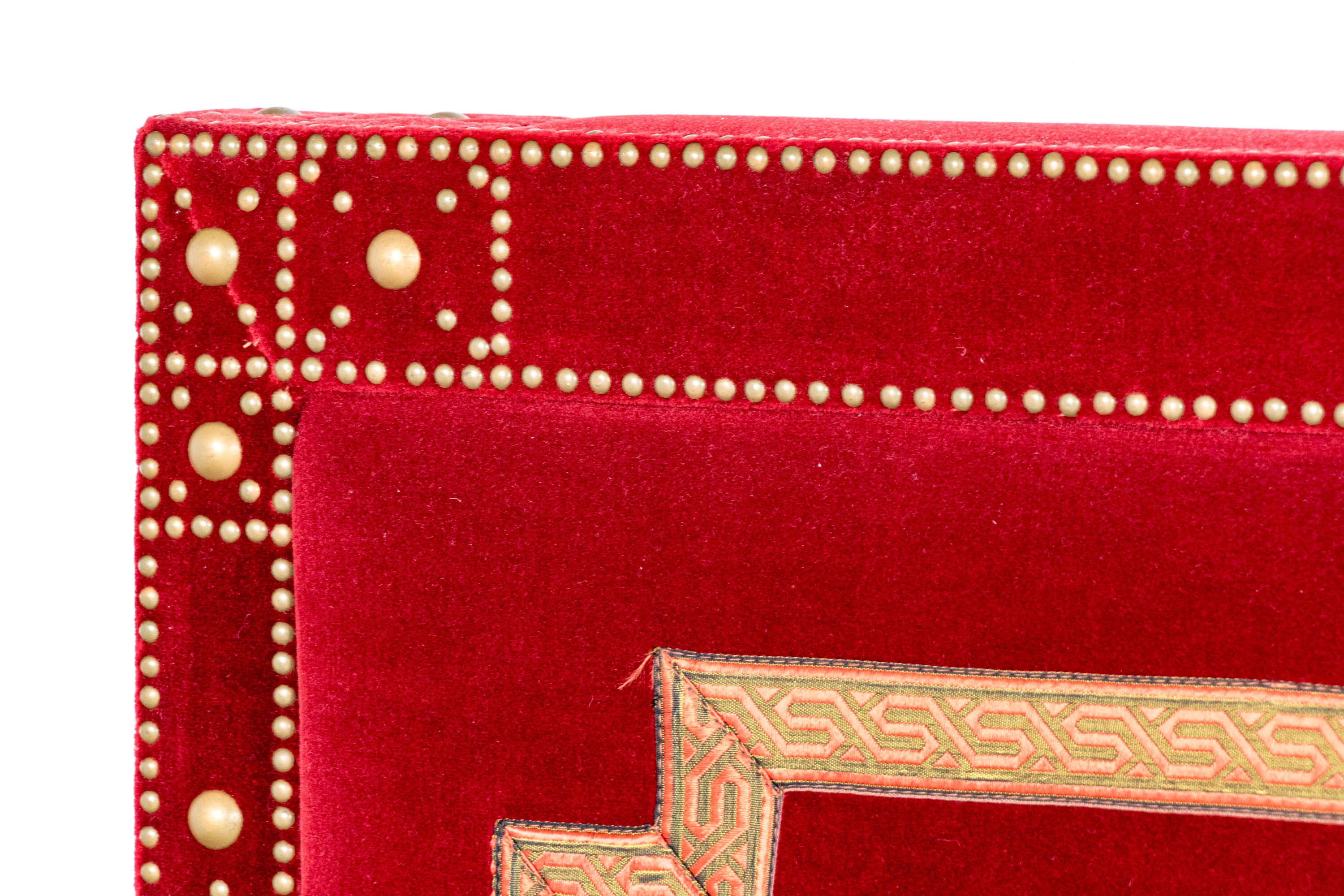 Red upholstery with decorative banding with stylized diamond motifs with tack nailhead trim around. Each on carved and stained feet that add approx 1 1/2" to the length on each foot. Provenance: Purchased at the auction for Gramercy Hotel.