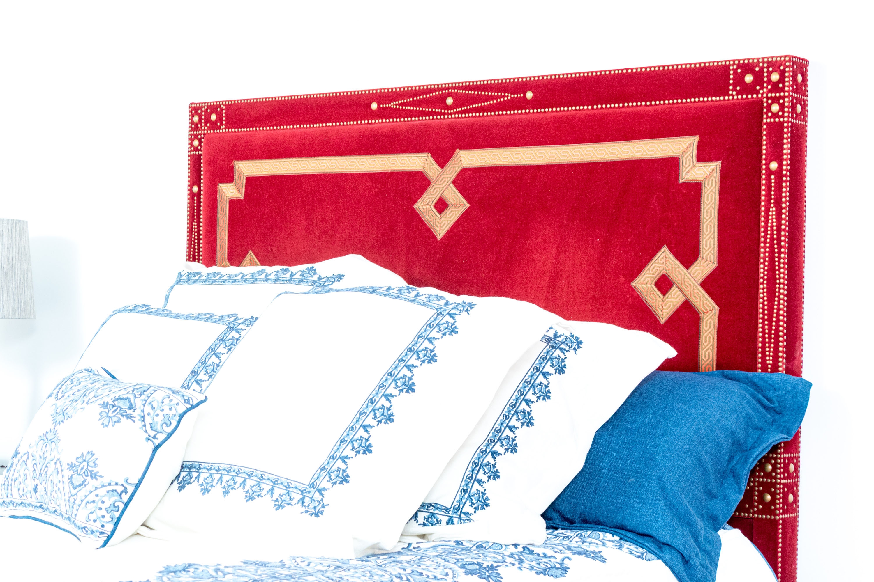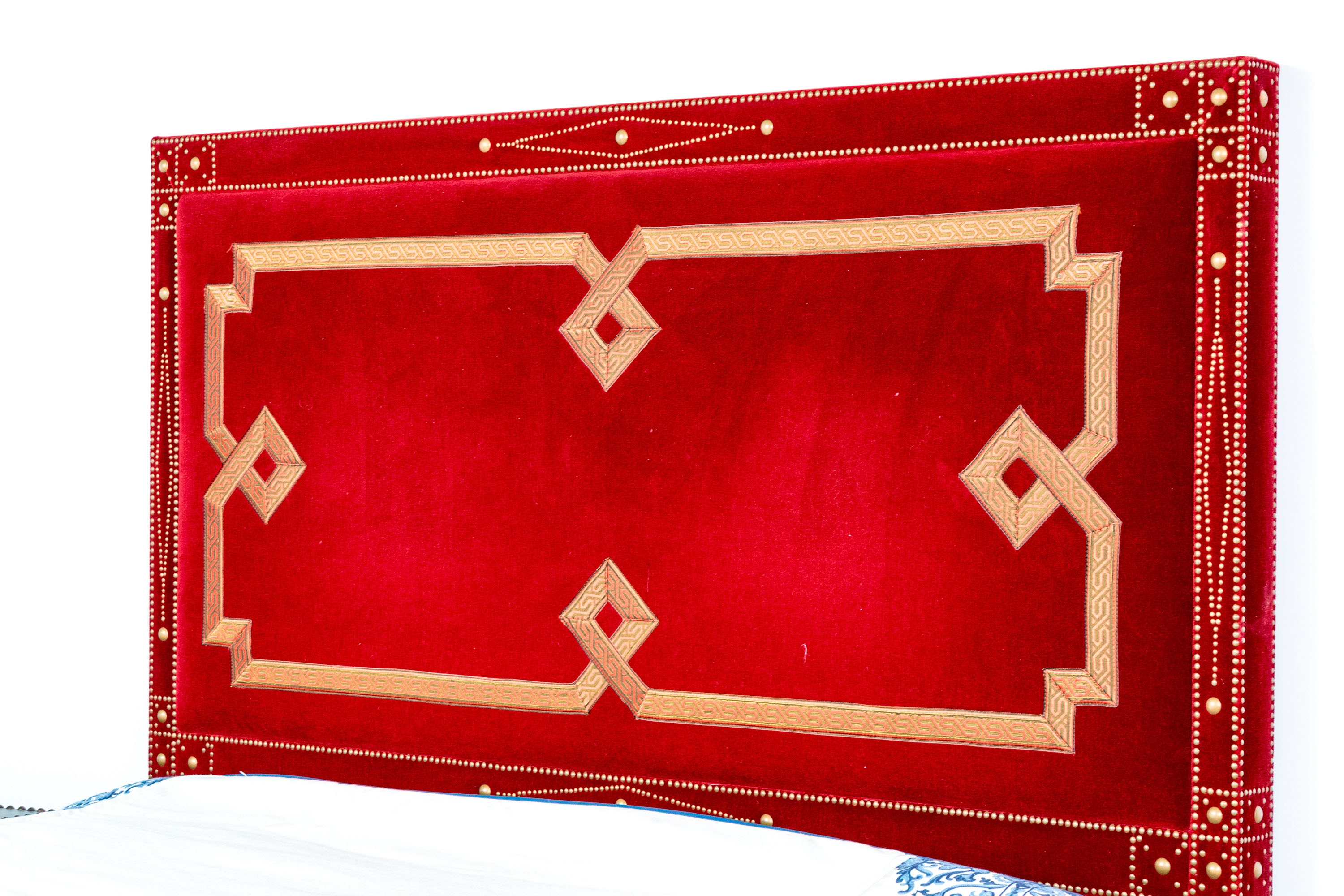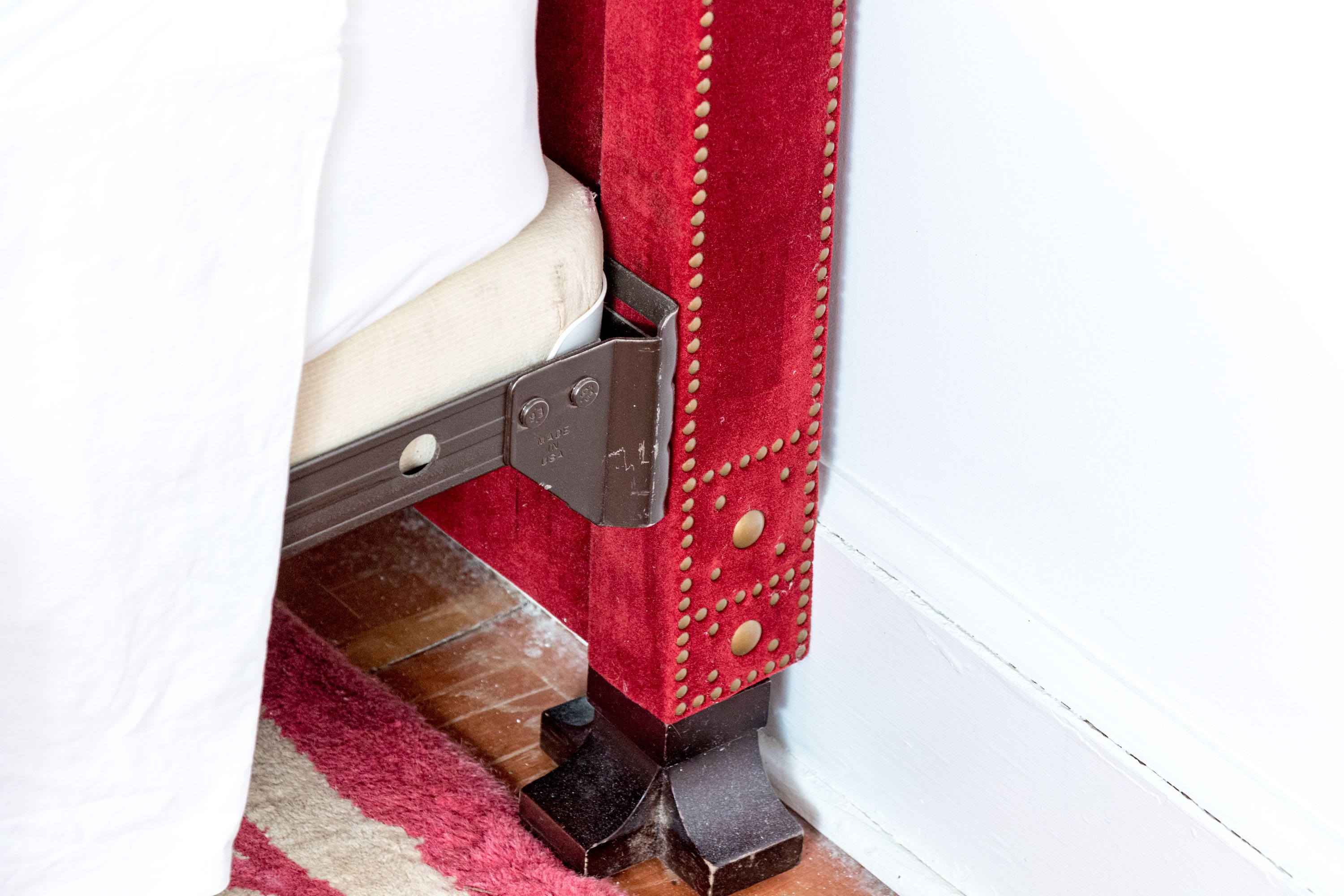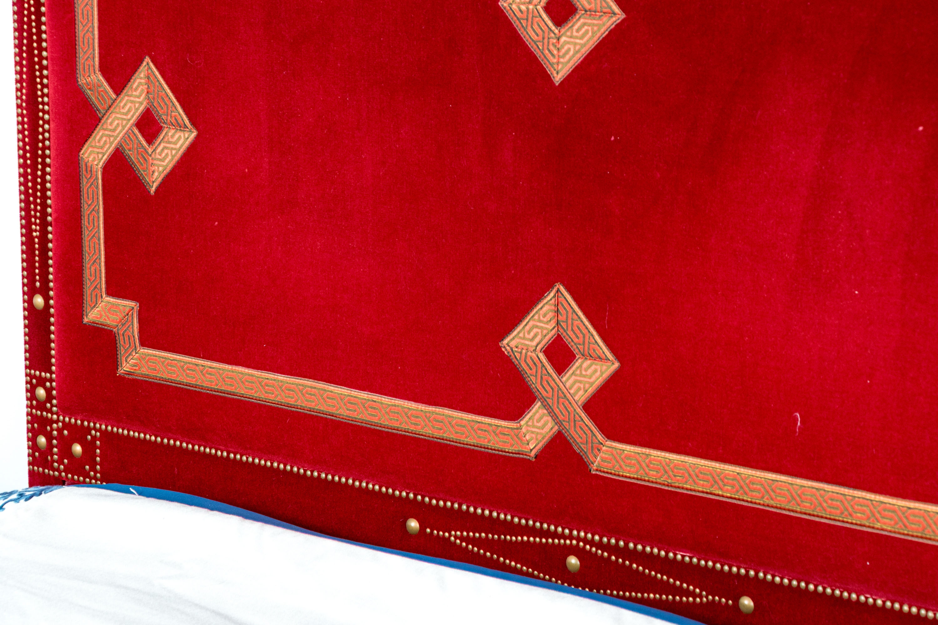 Red upholstery with decorative banding with stylized diamond motifs with tack nailhead trim around. Each on carved and stained feet that add approx 1 1/2" to the length on each foot. Provenance: Purchased at the auction for Gramercy Hotel.