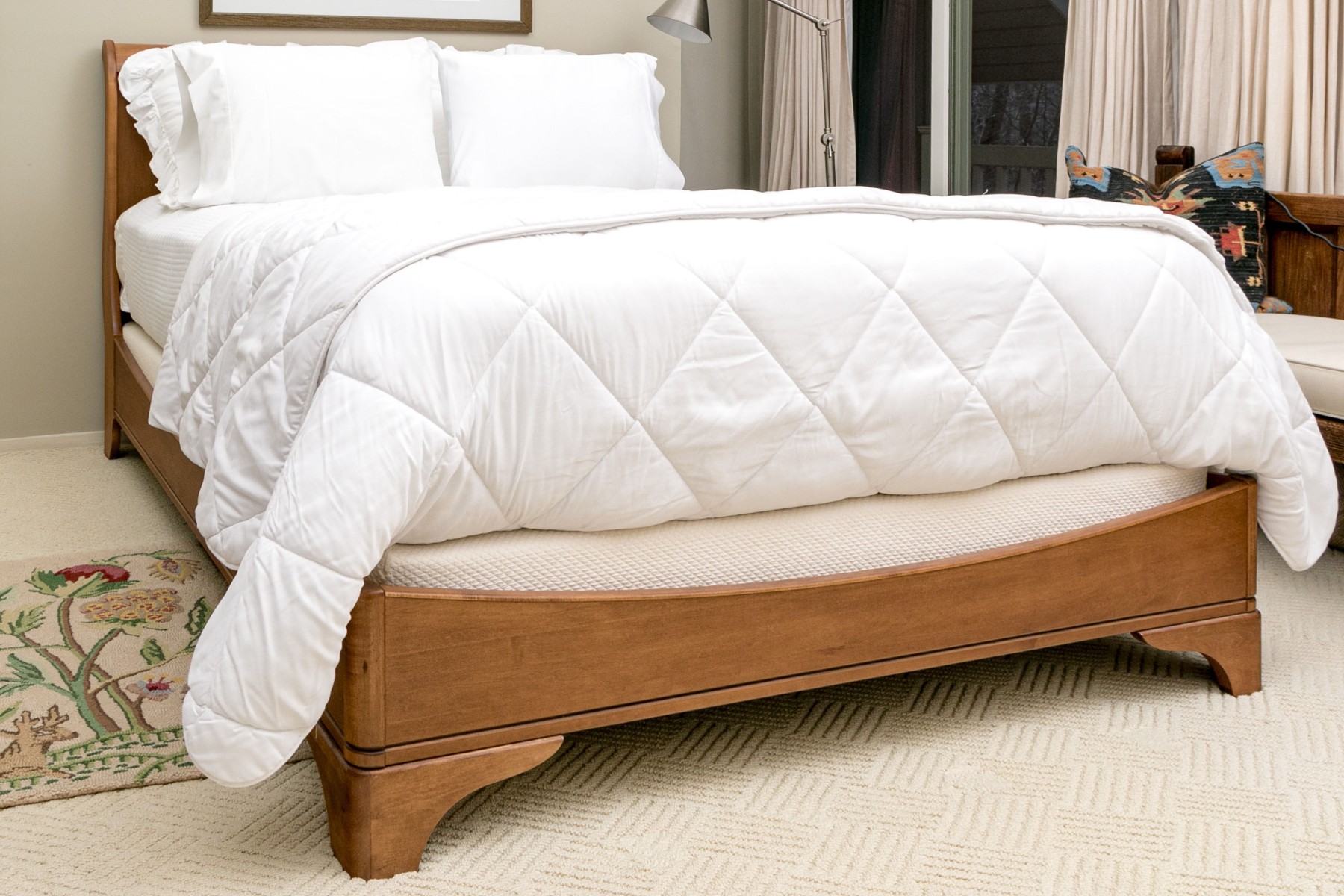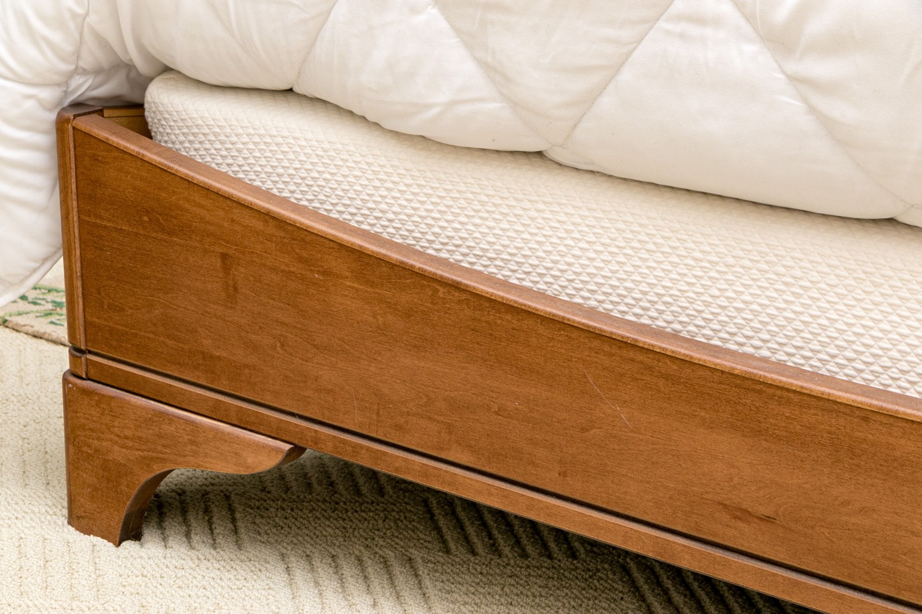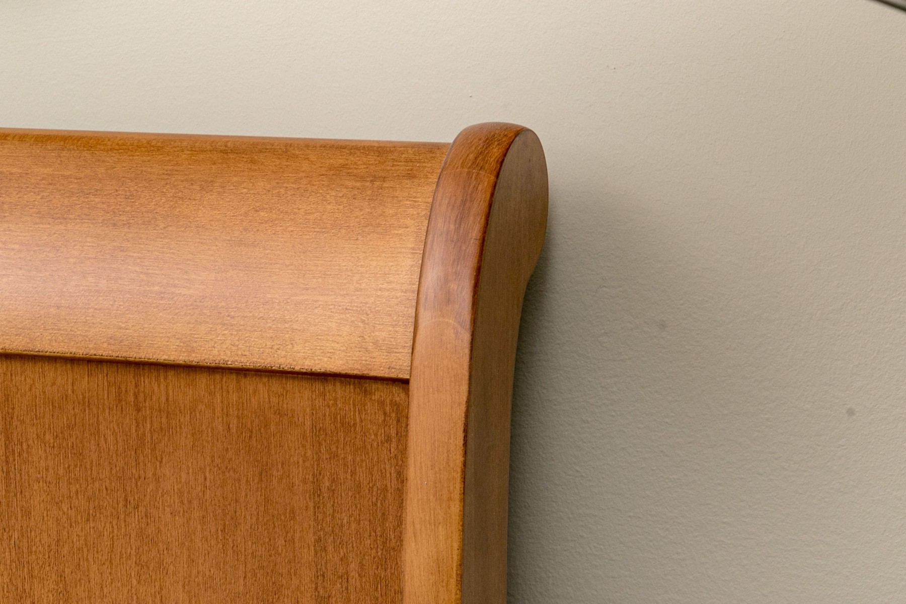 This sleigh bed is perfect for any bedroom and has a handsome rolled headboard with two tones of wood, has curved sideboards, and a curved footboard. The whole is raised on bracket feet. Note* The mattress is not included.