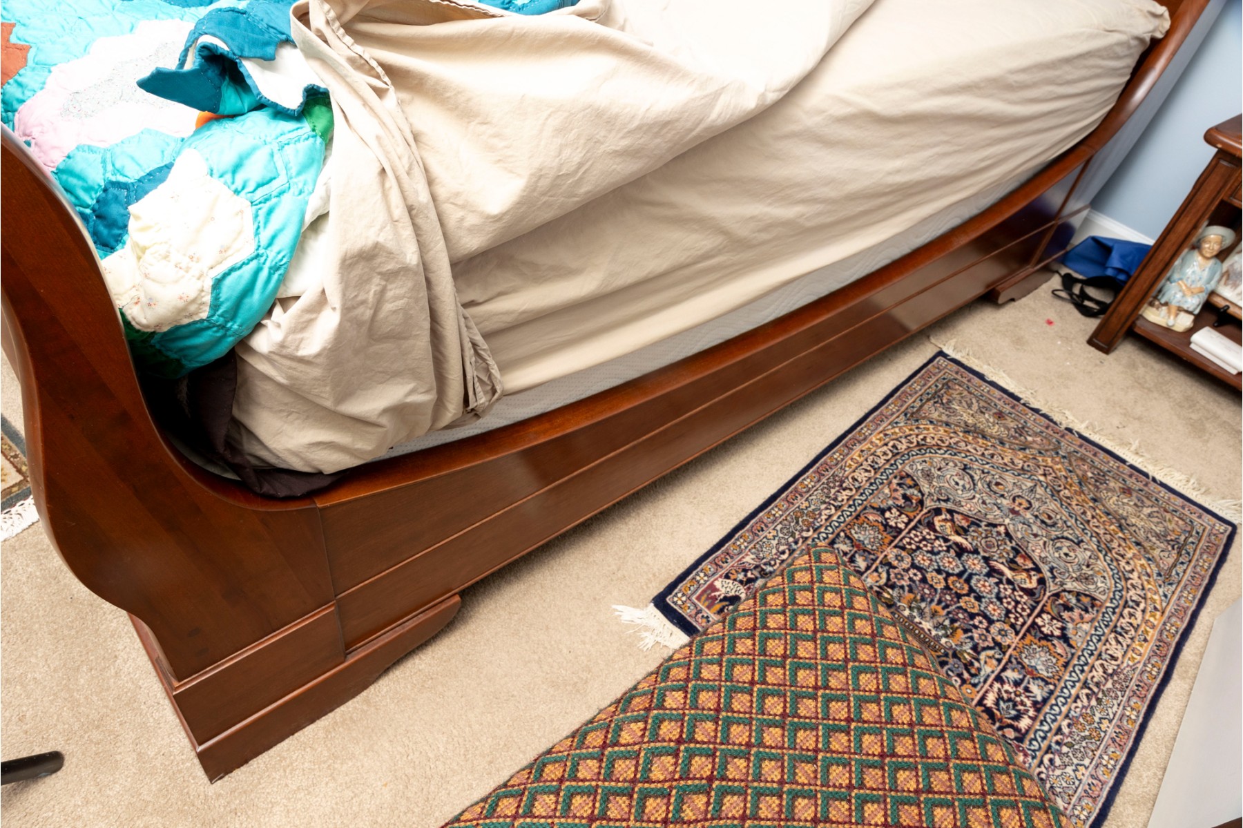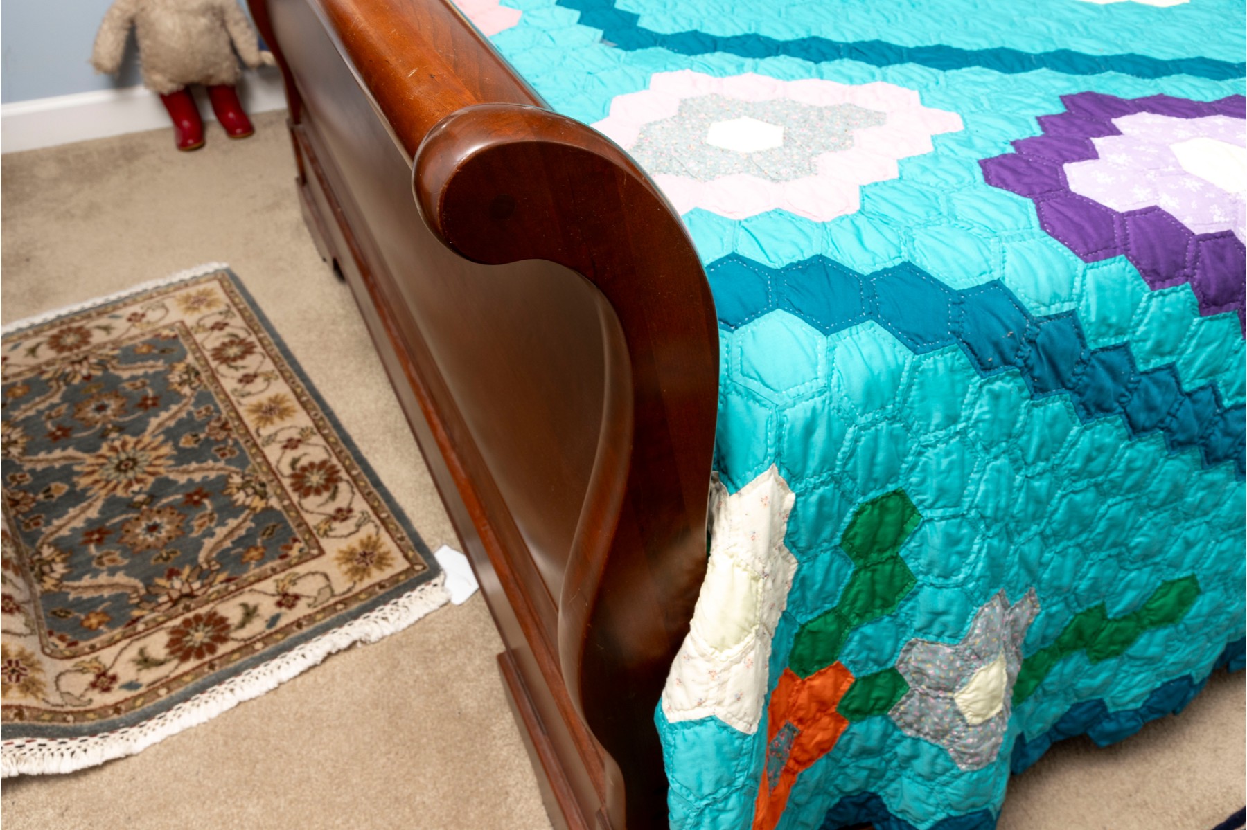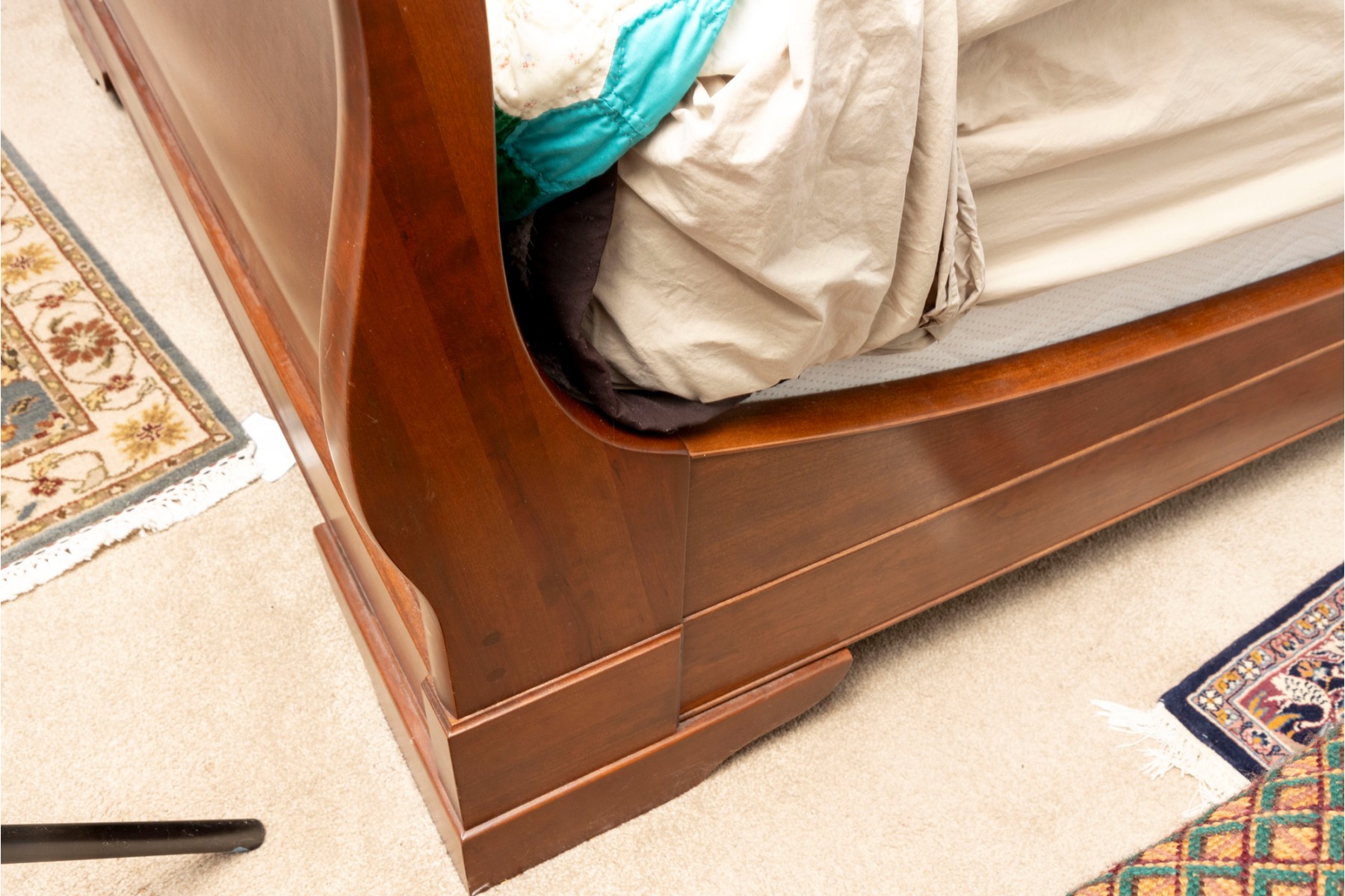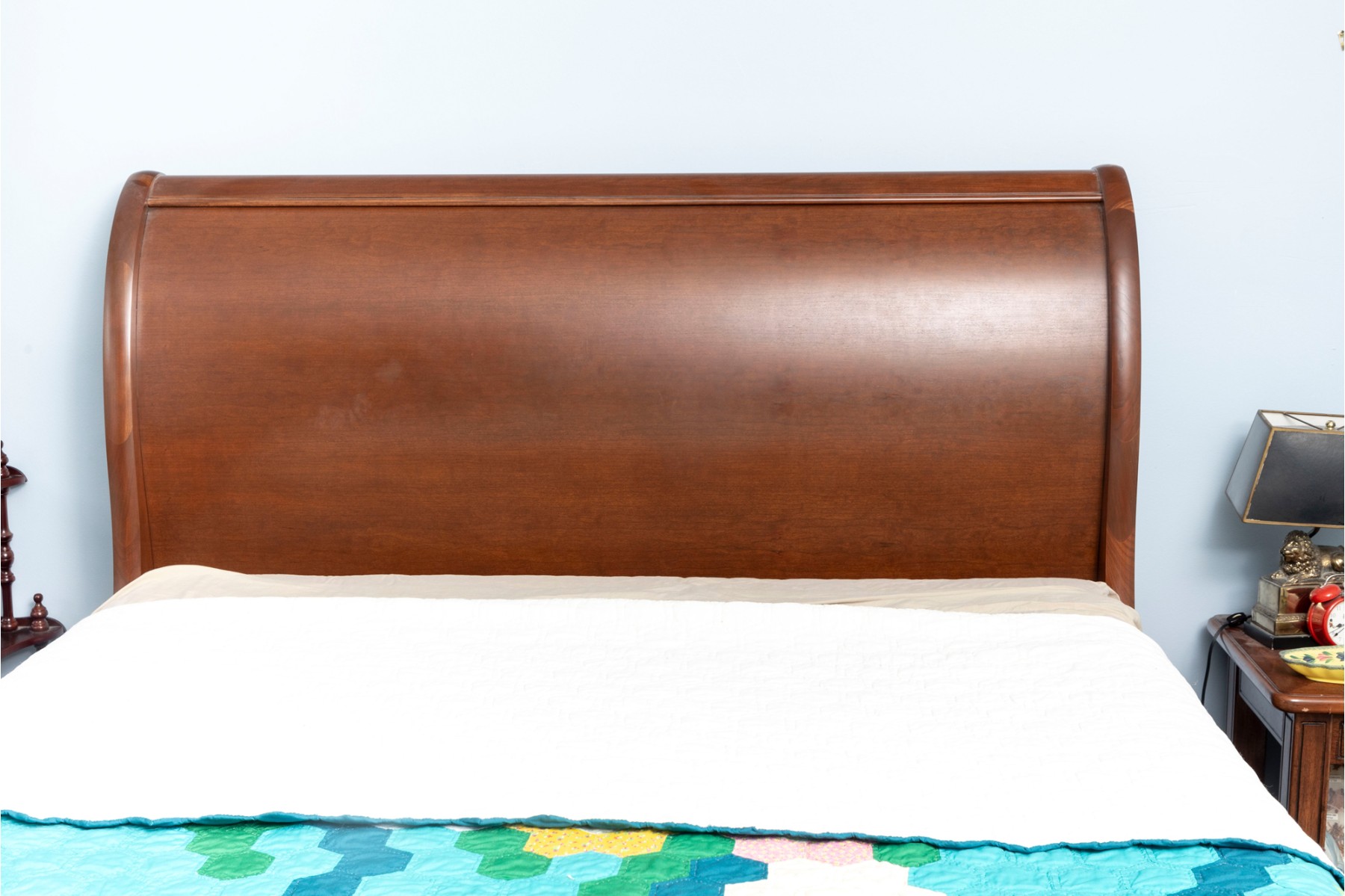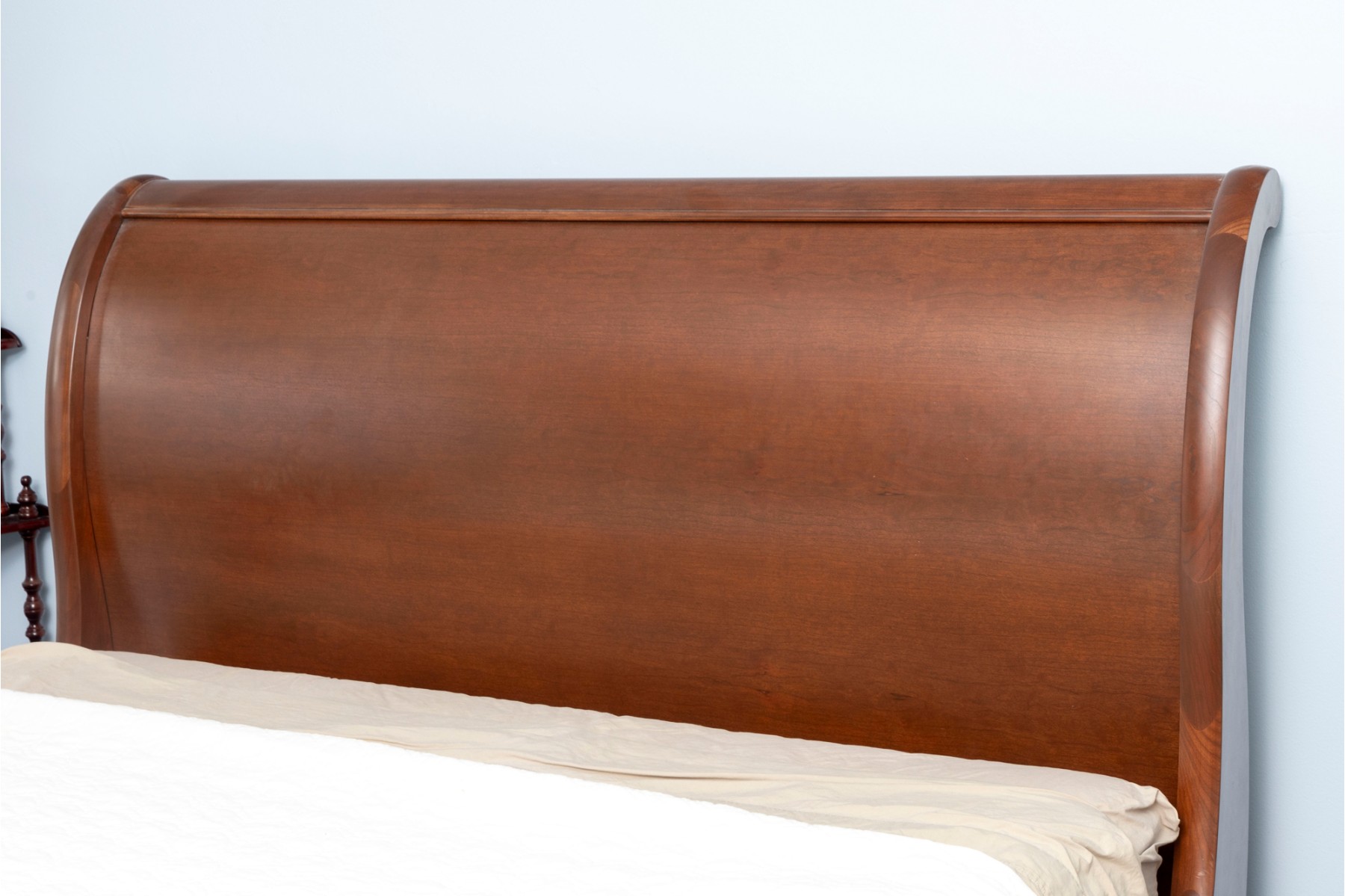 A queen sized sleigh bedframe in a gorgeous warm-toned medium brown finish, simply and elegantly detailed.