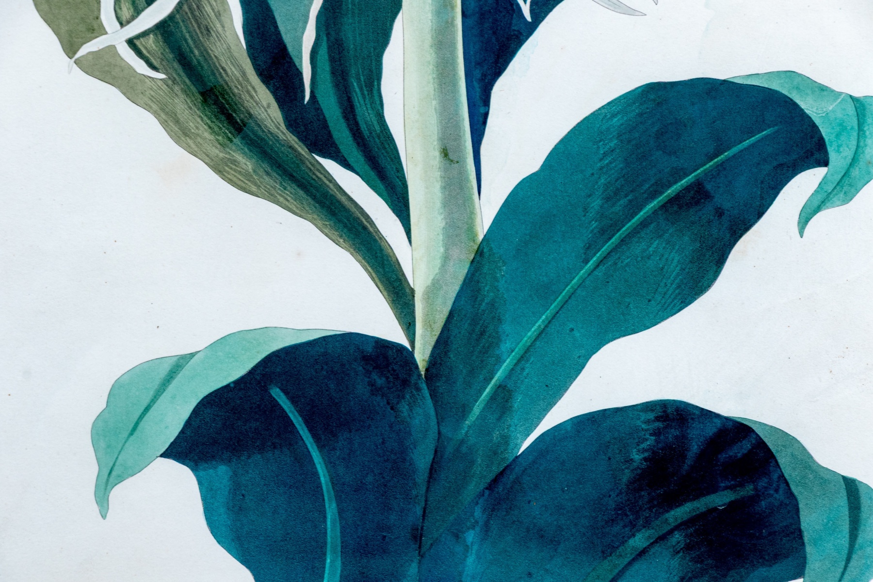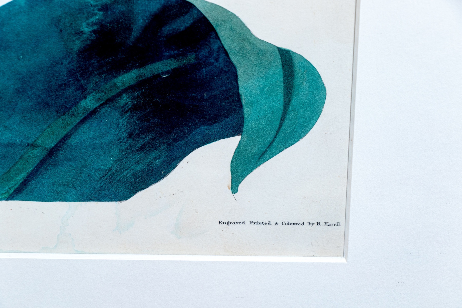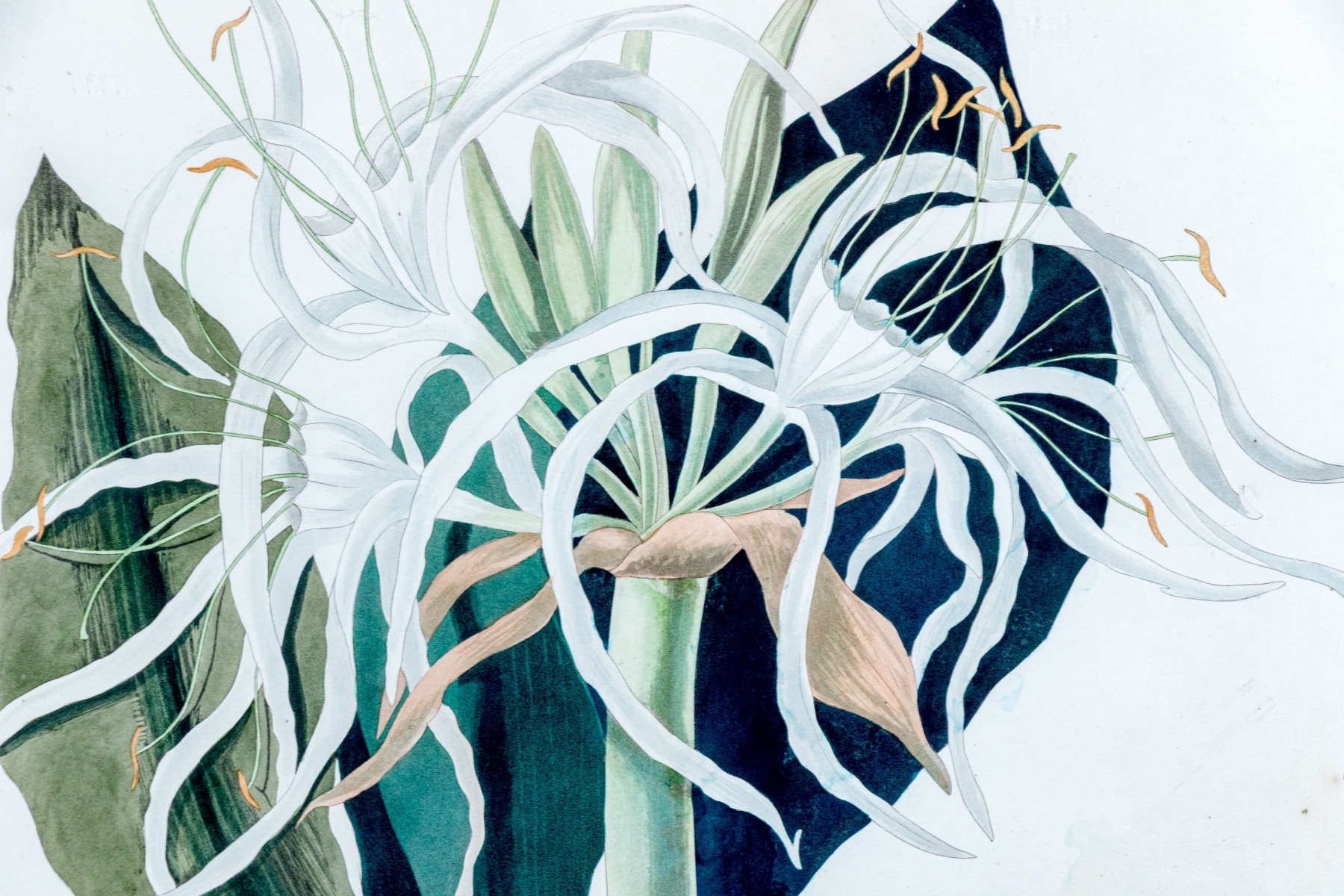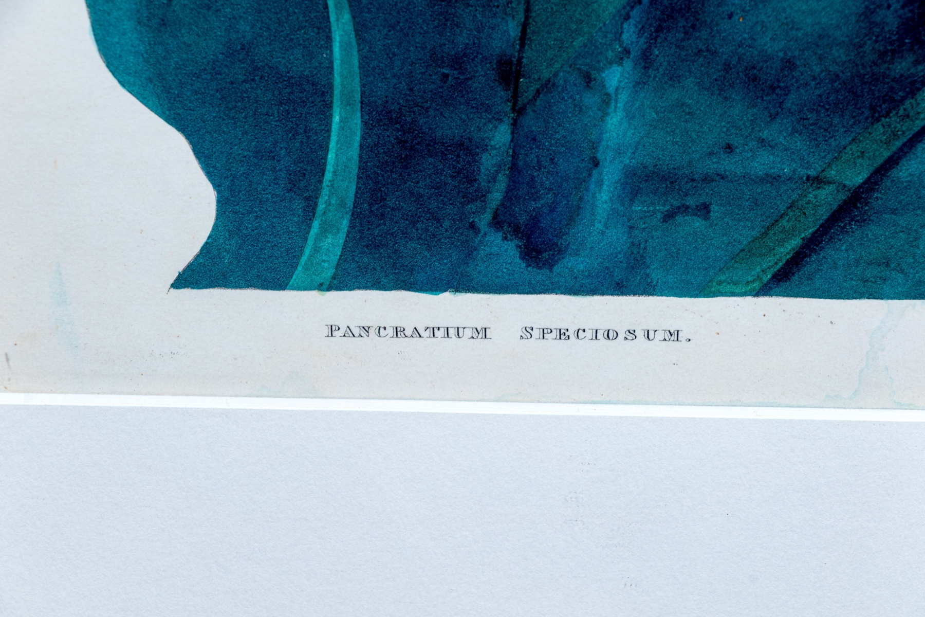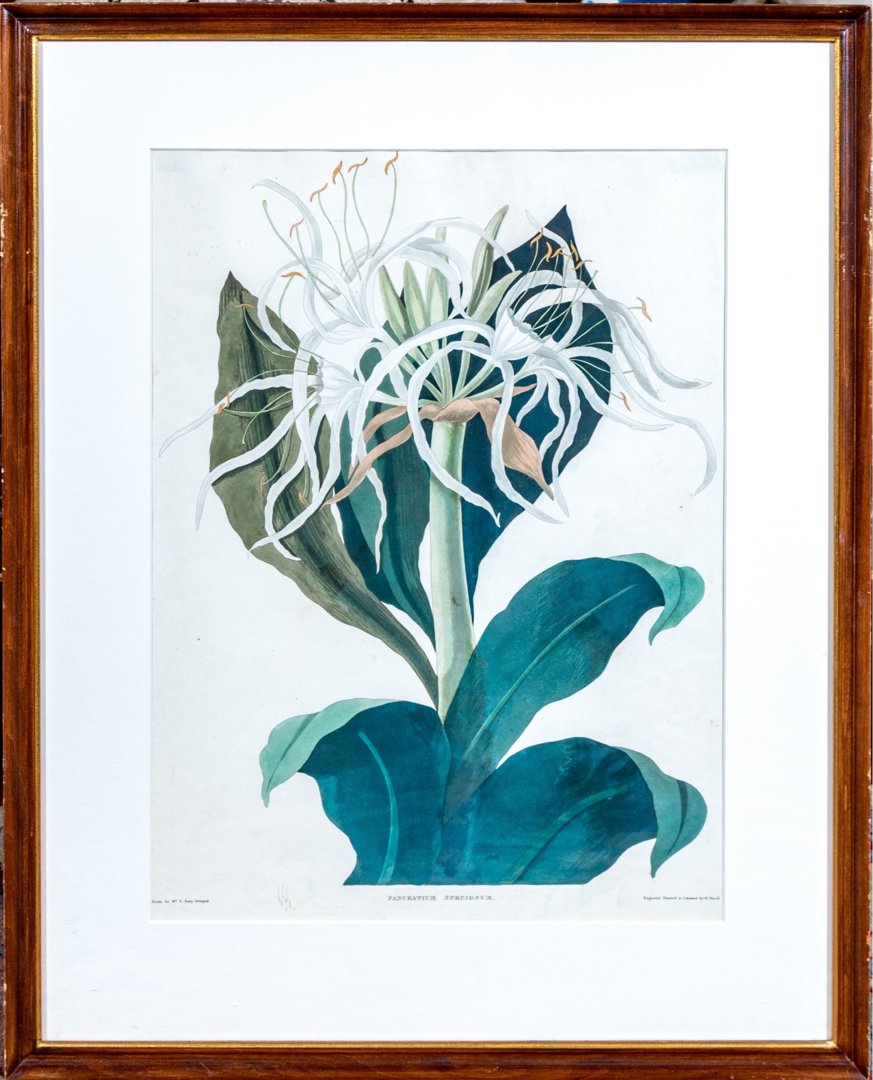 A beautifully detailed print after the original drawing by Priscilla Susan Bury (English, 1799-1872) engraved by Robert Havell (English, 1793-1878) "Pancratium Speciosum" depicting delicate white blooms emerging from a thick green stem surrounded by large teal green leaves.