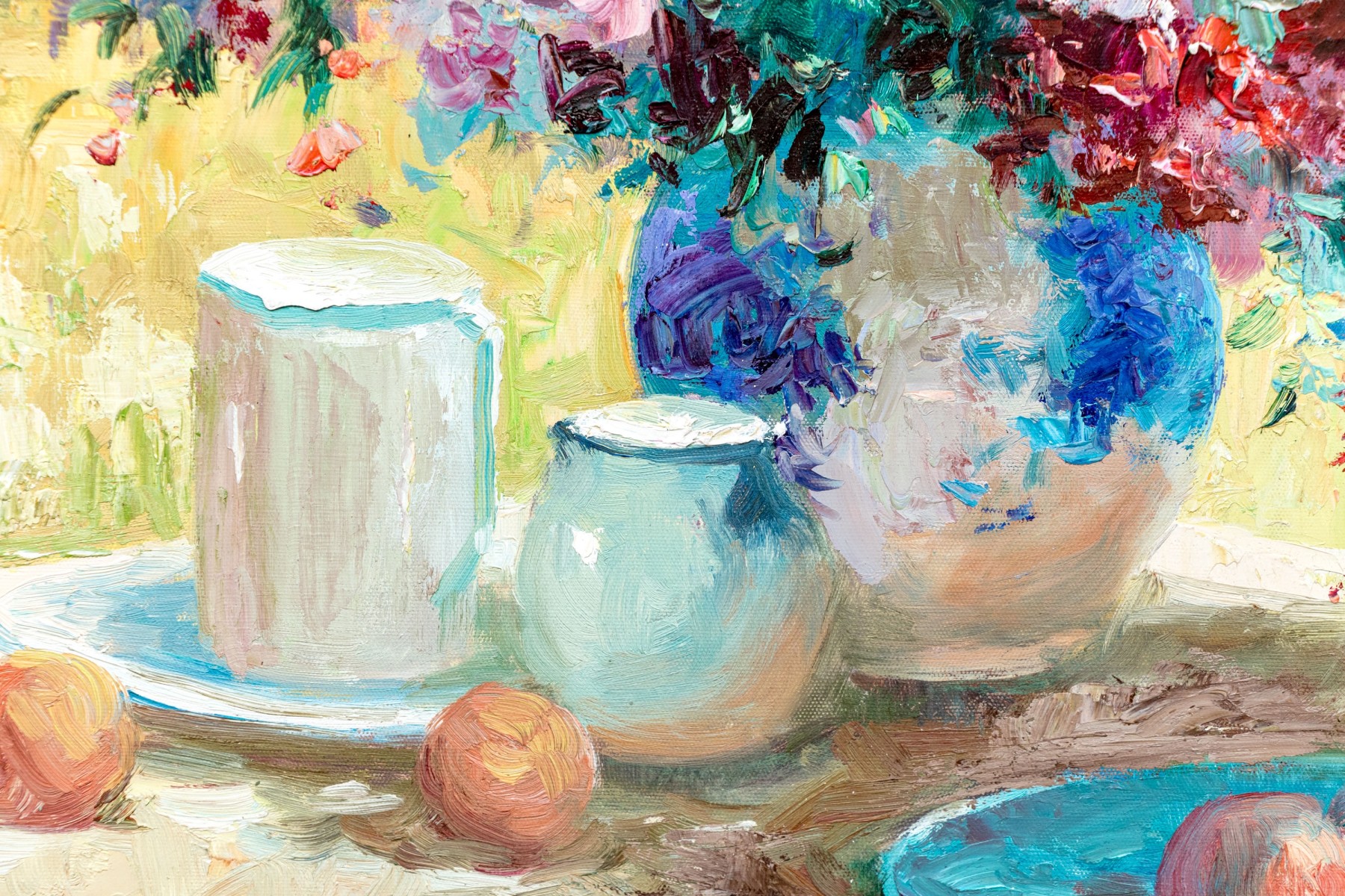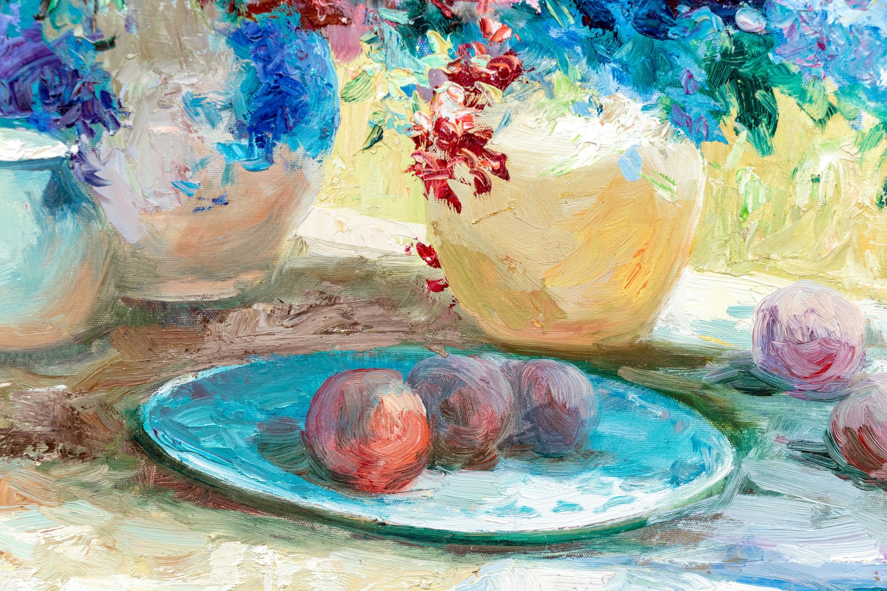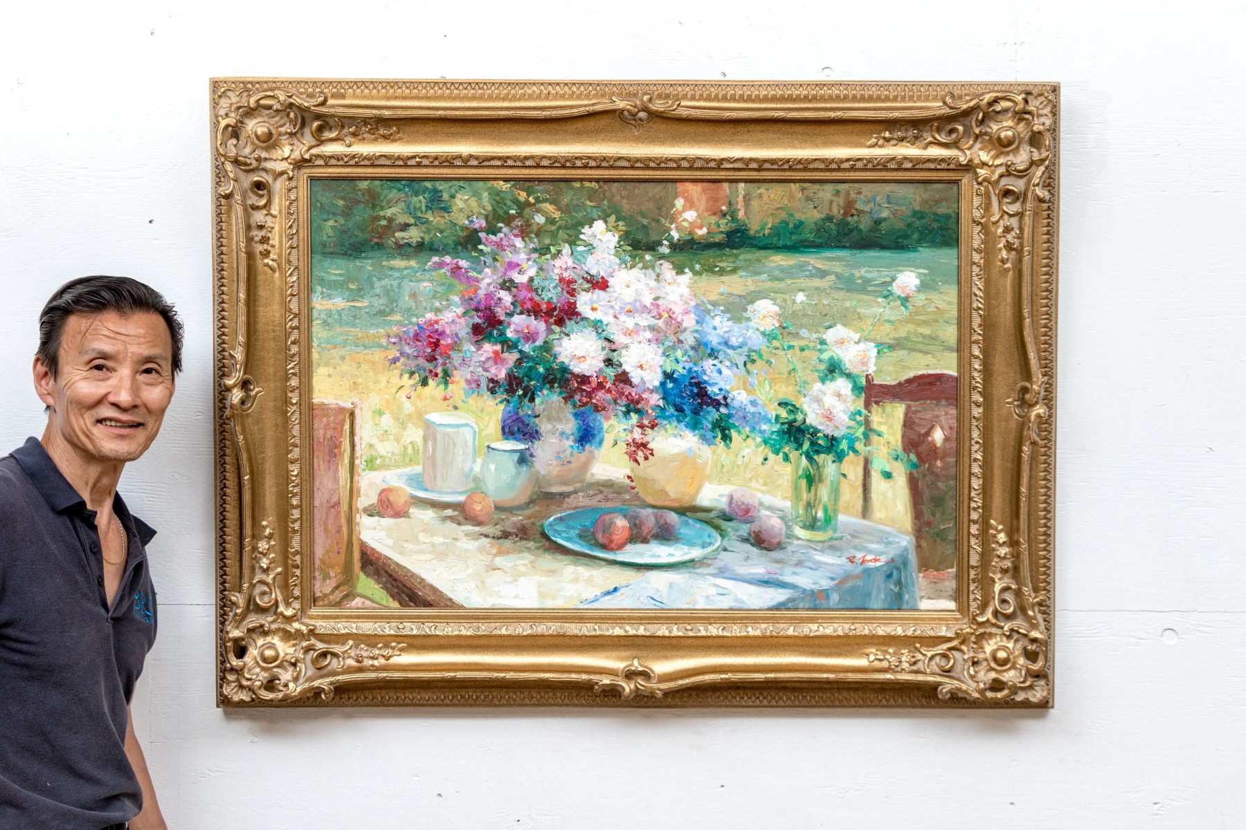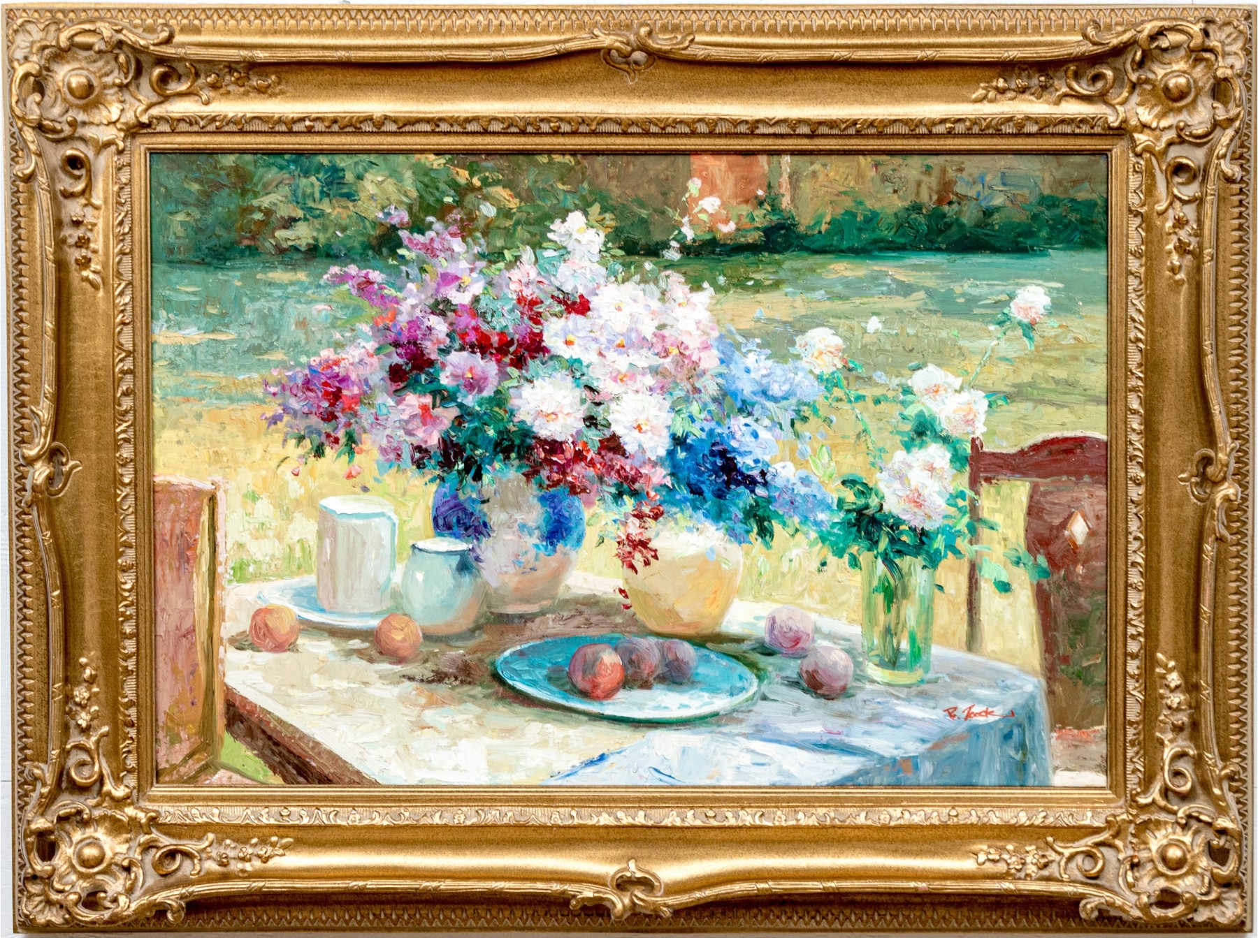 The Impressionistic style oil on canvas depicts a table in a garden with three vases with floral bouquets along with a plate and fruit with two chairs. Wonderfully thick impasto.