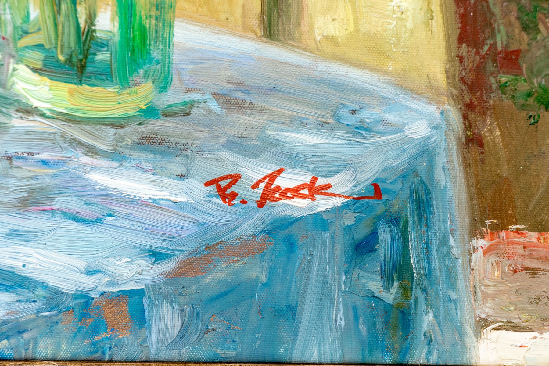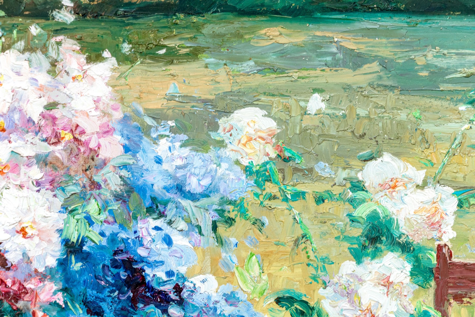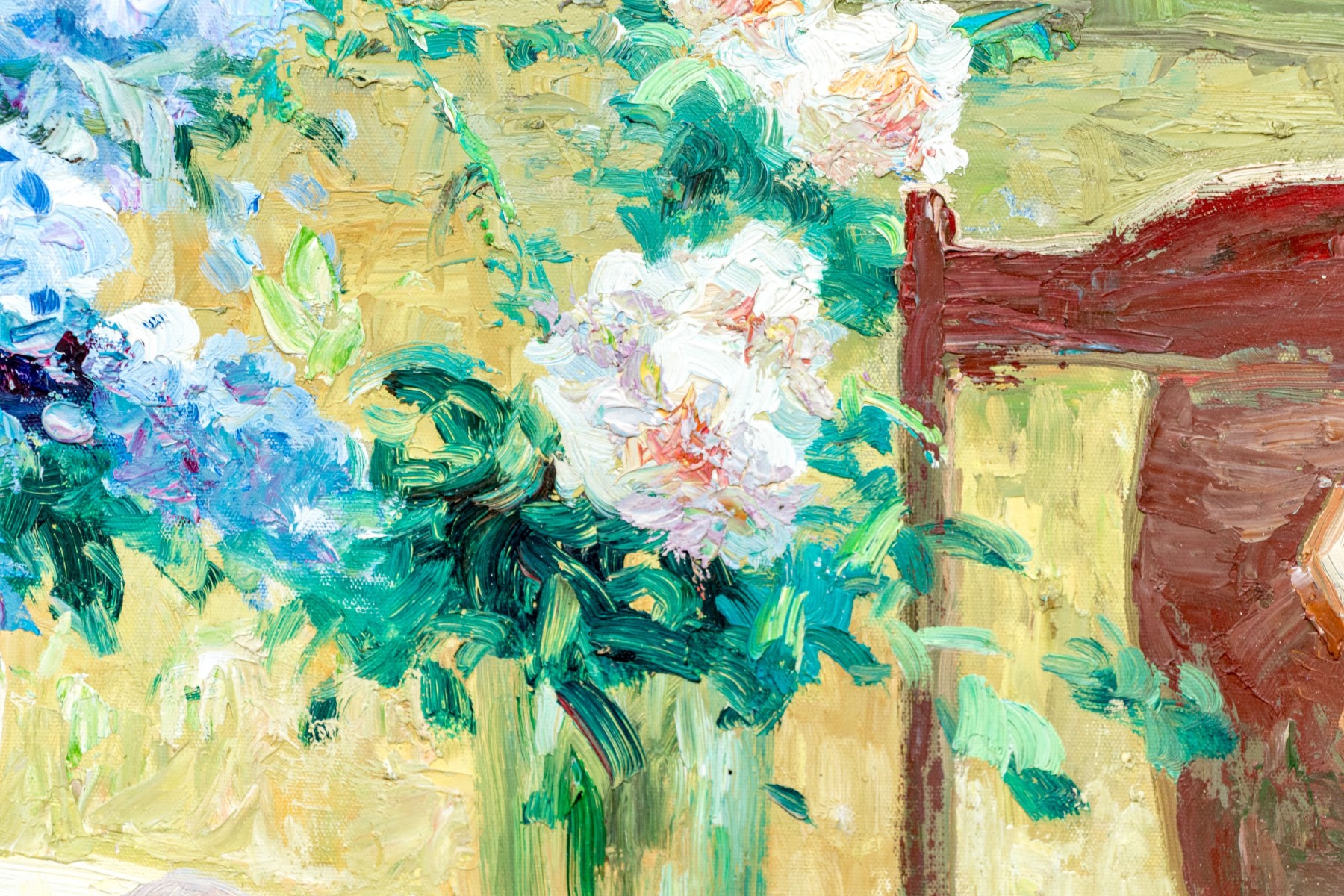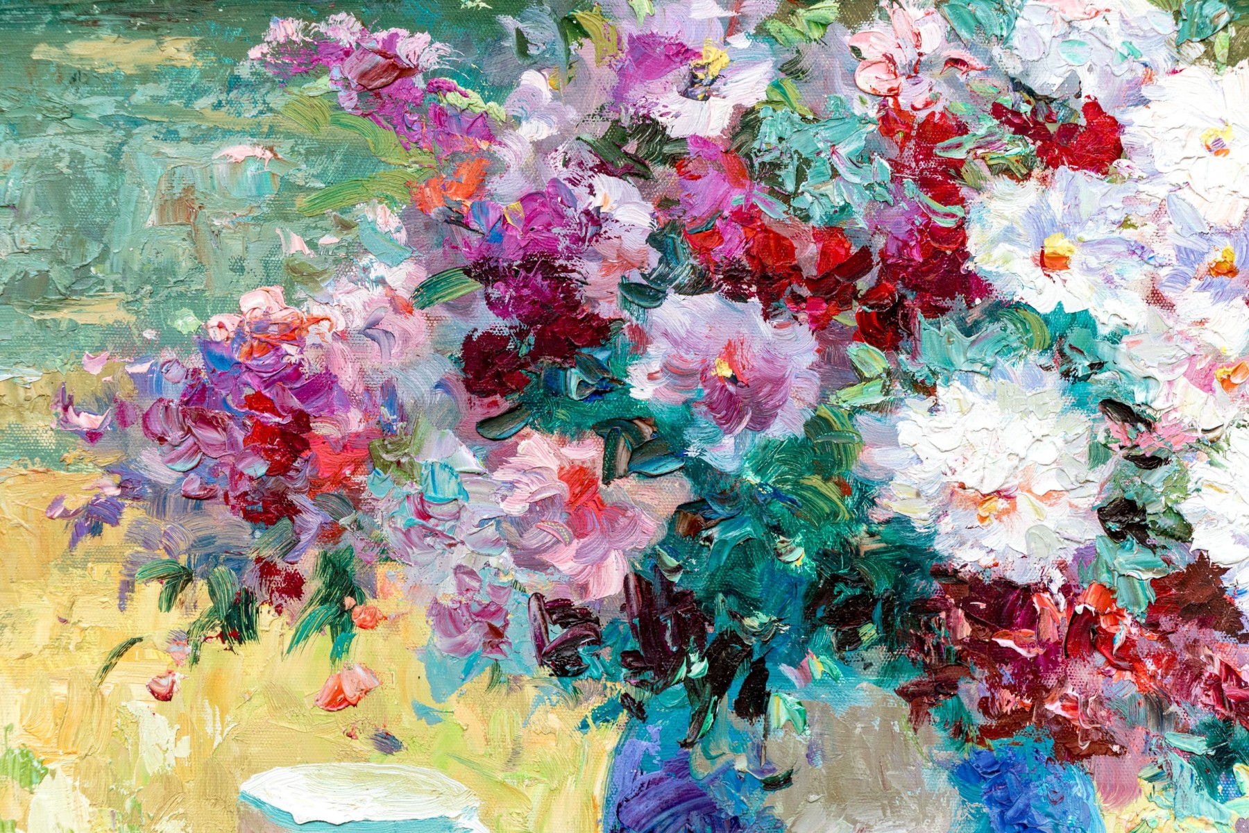 The Impressionistic style oil on canvas depicts a table in a garden with three vases with floral bouquets along with a plate and fruit with two chairs. Wonderfully thick impasto.