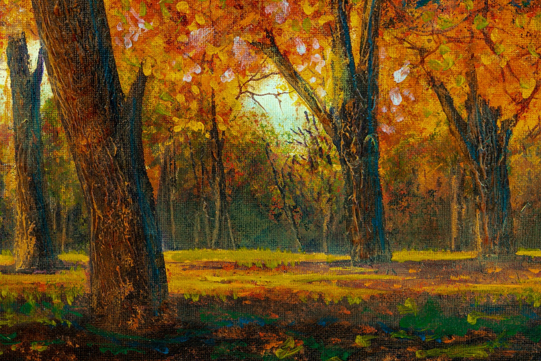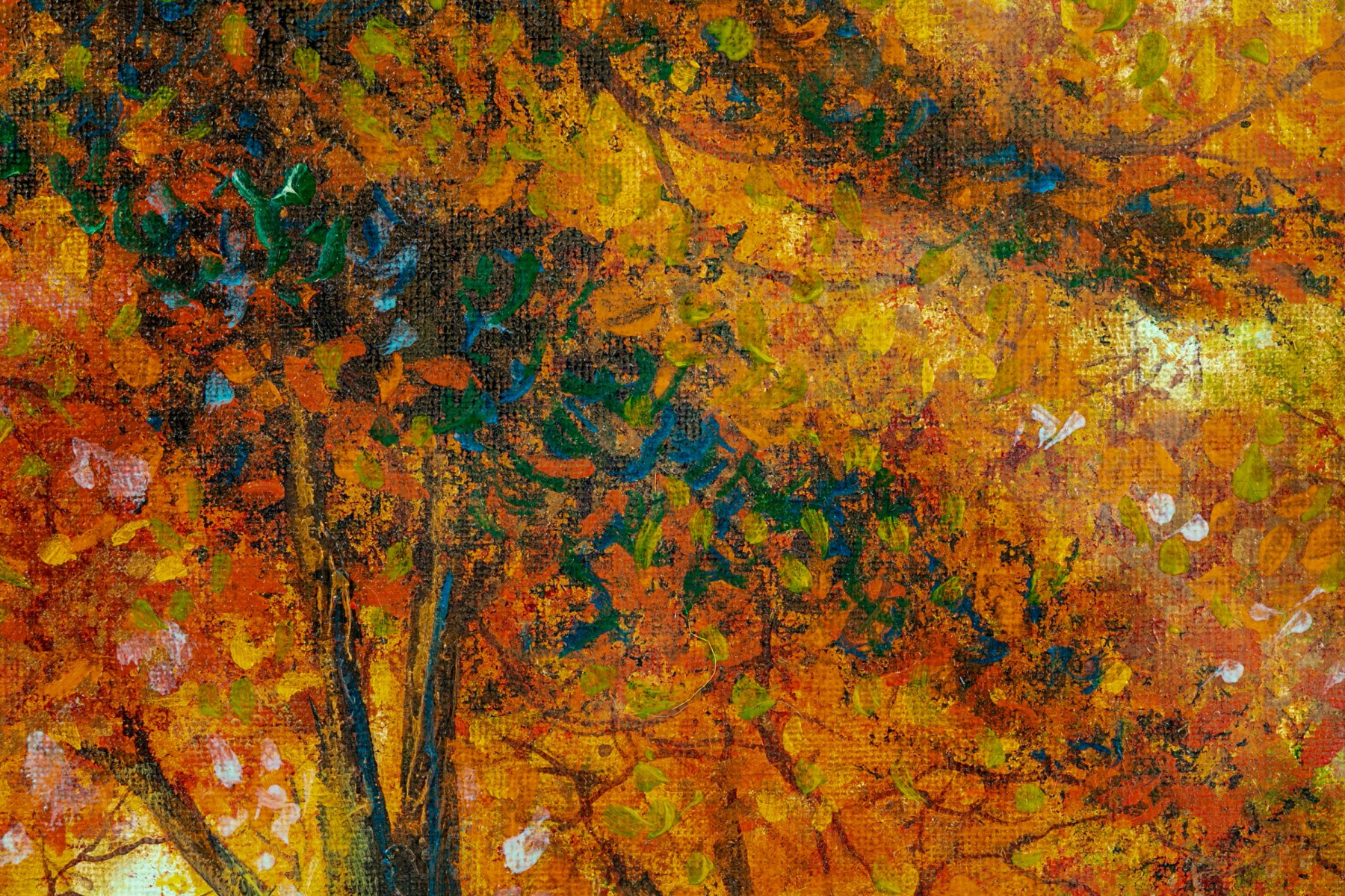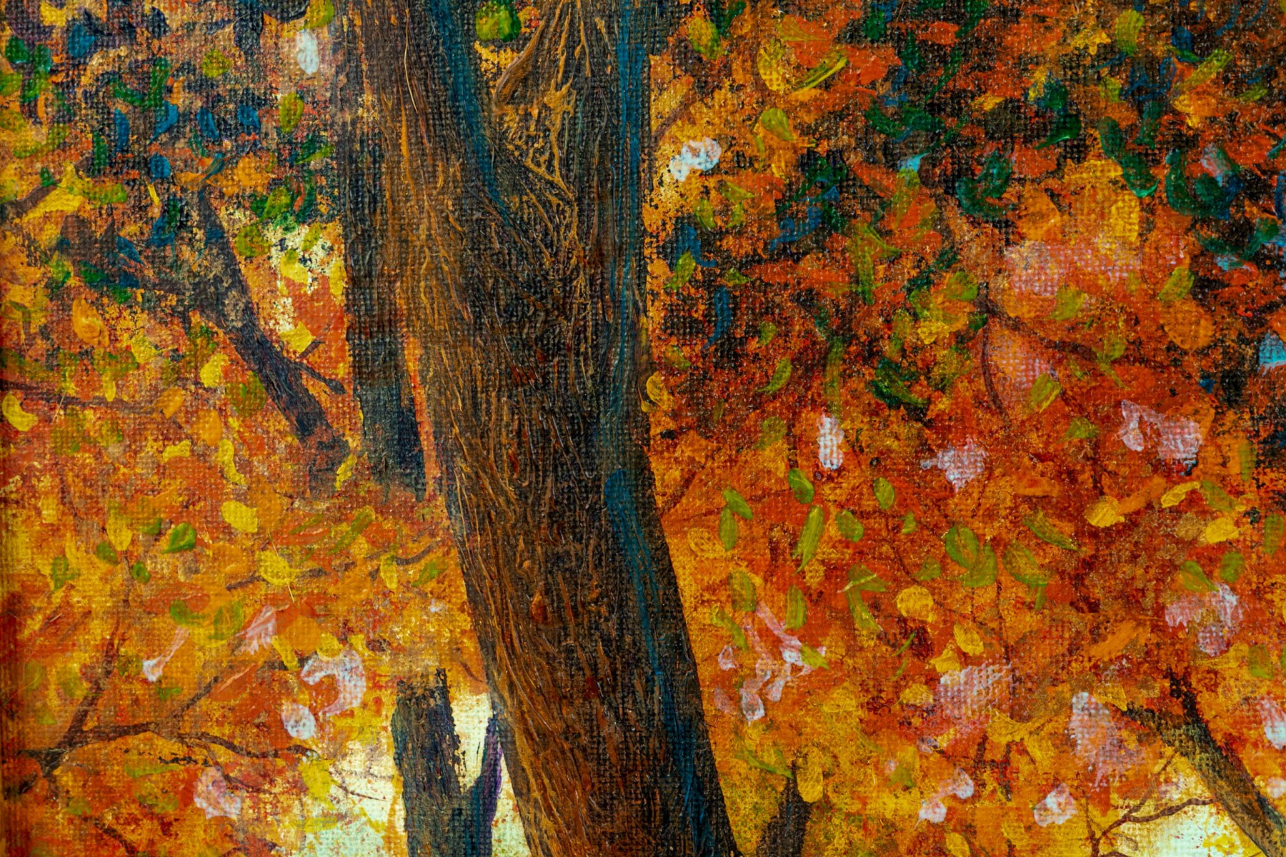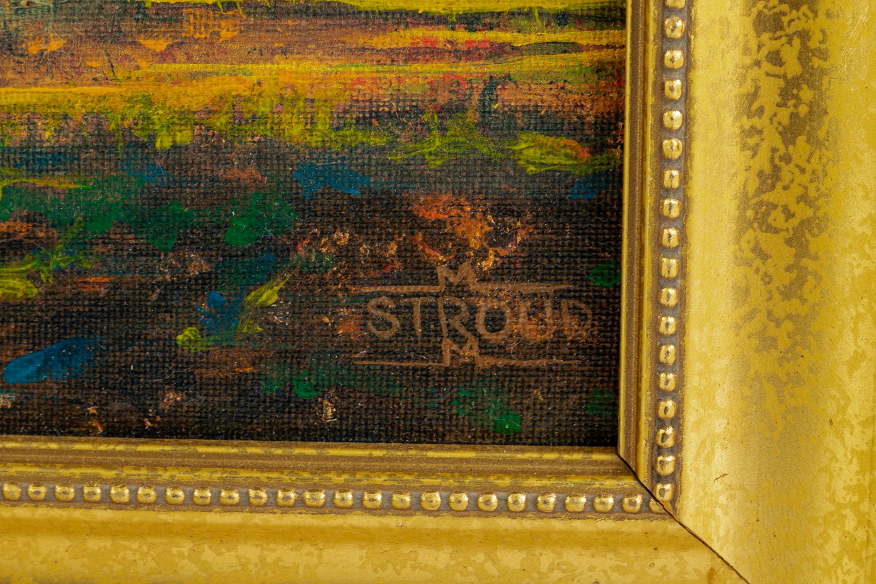 A great painting on board with a thick forest of trees highlighted by fall colored leaves in colors of orange, pink, yellow, and green. Signed Stroud to bottom right. Artist info to verso.