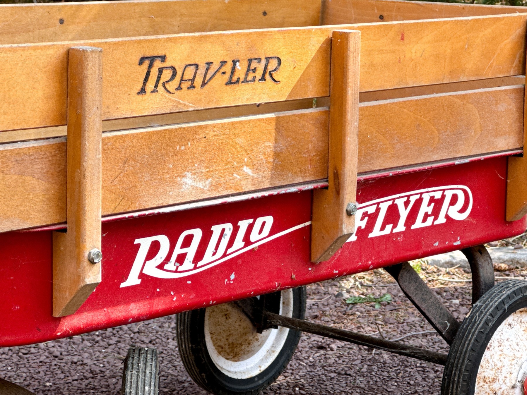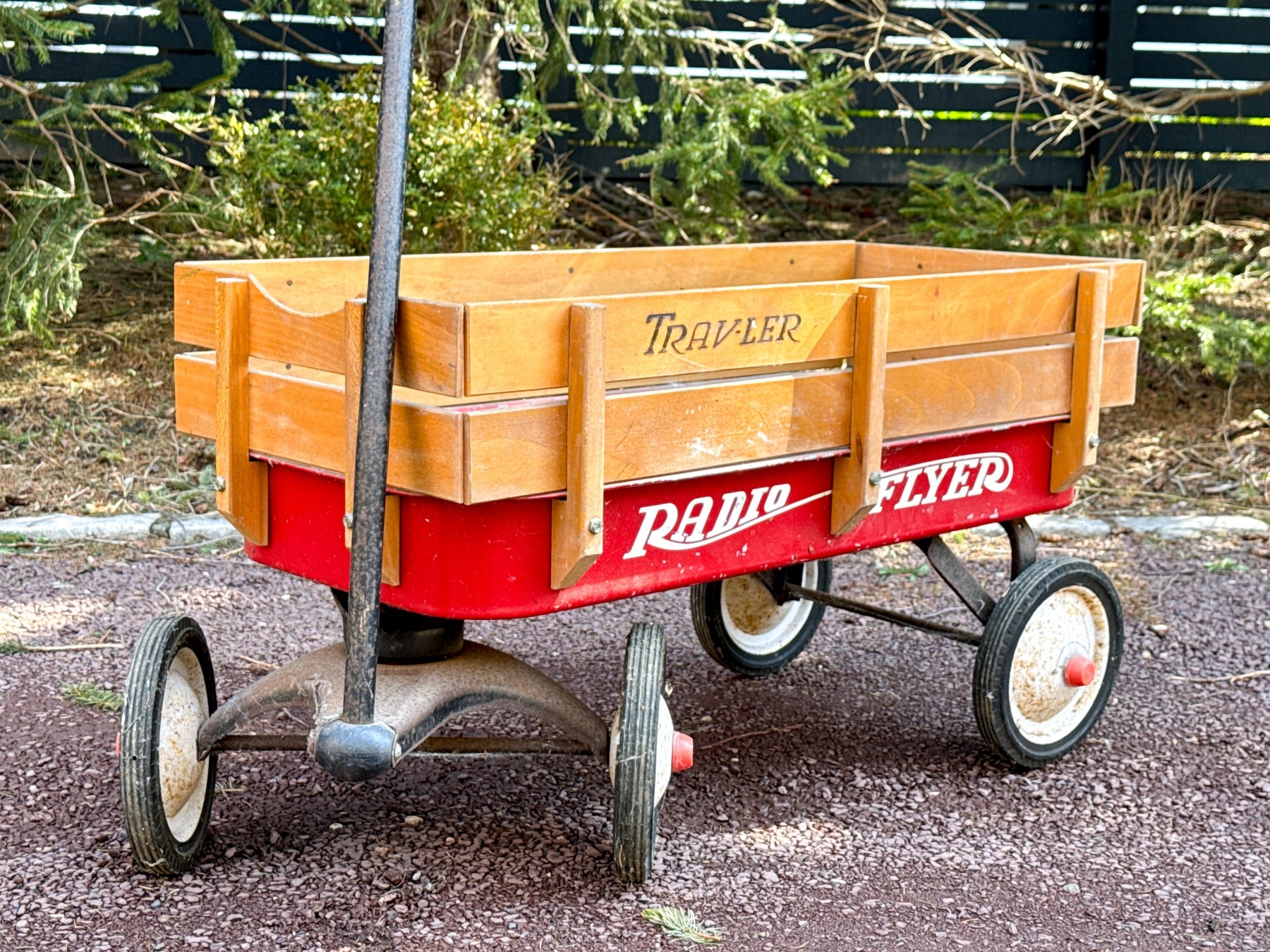 A charming Radio Flyer wagon with old fashioned charm, showcasing an orange brown wood slat top over a red metal body raised on four wheels.