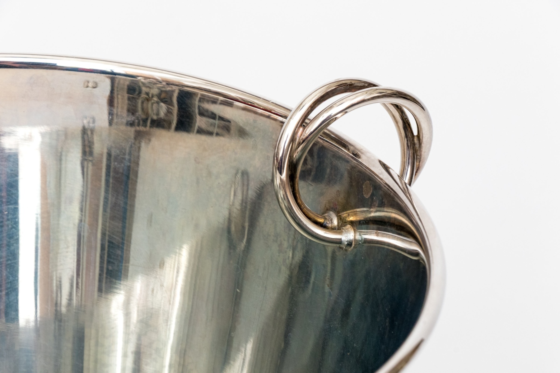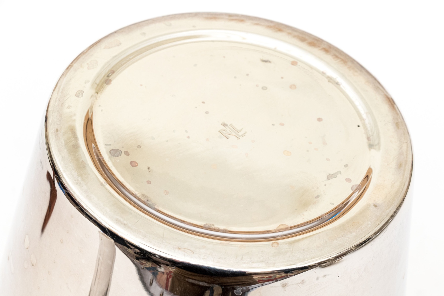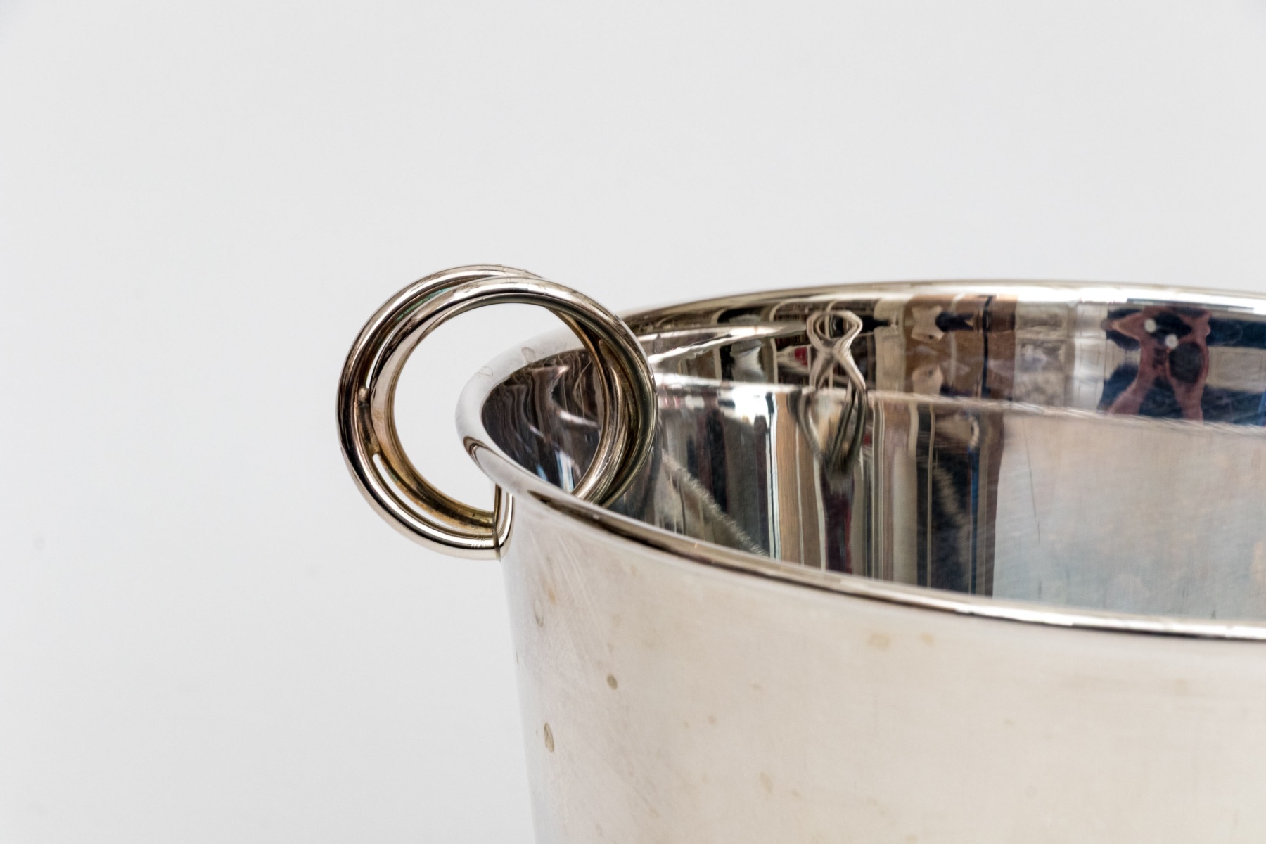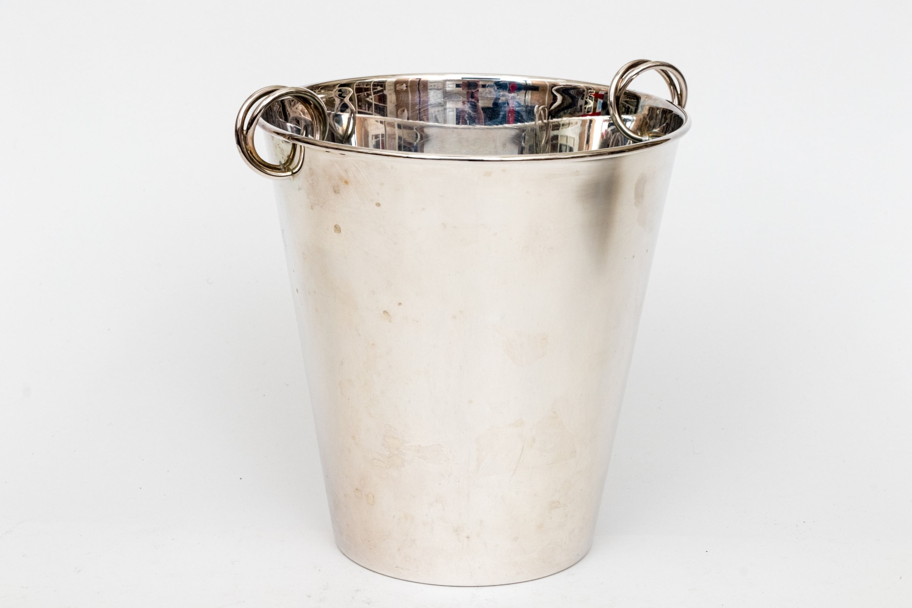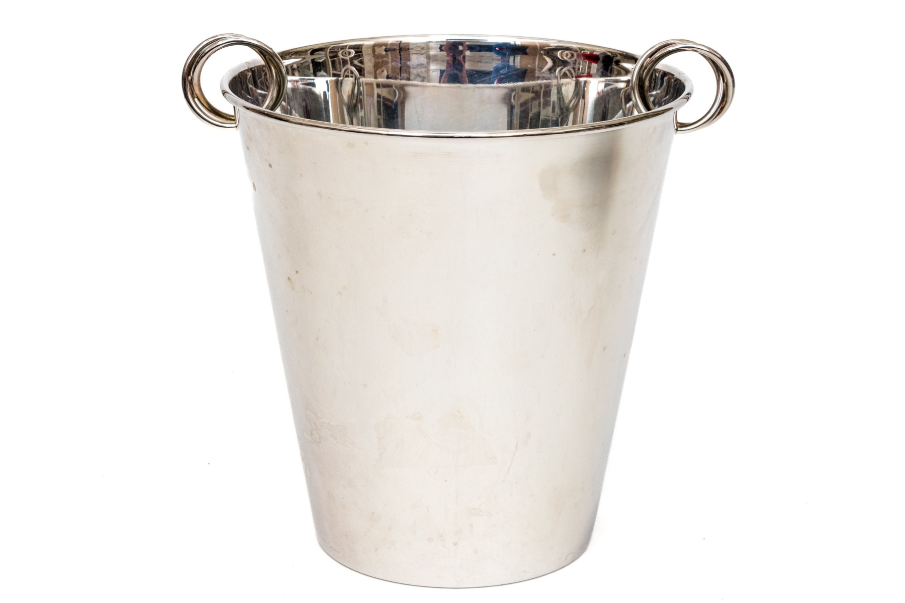 A quality Ralph Lauren aluminum cooler bucket with a semi-matte exterior and polished interior, designed with stylish double ring twin handles and a rolled rim over a tapered cylindrical body leading down to a flat foot. Marked underfoot.