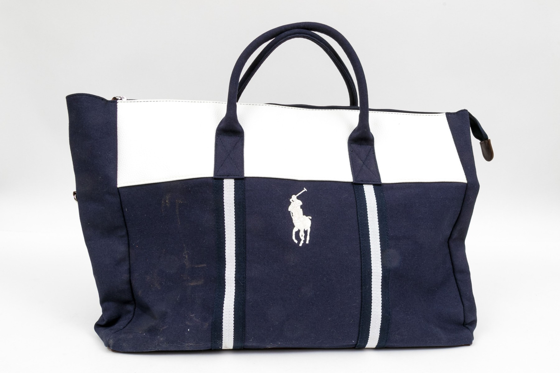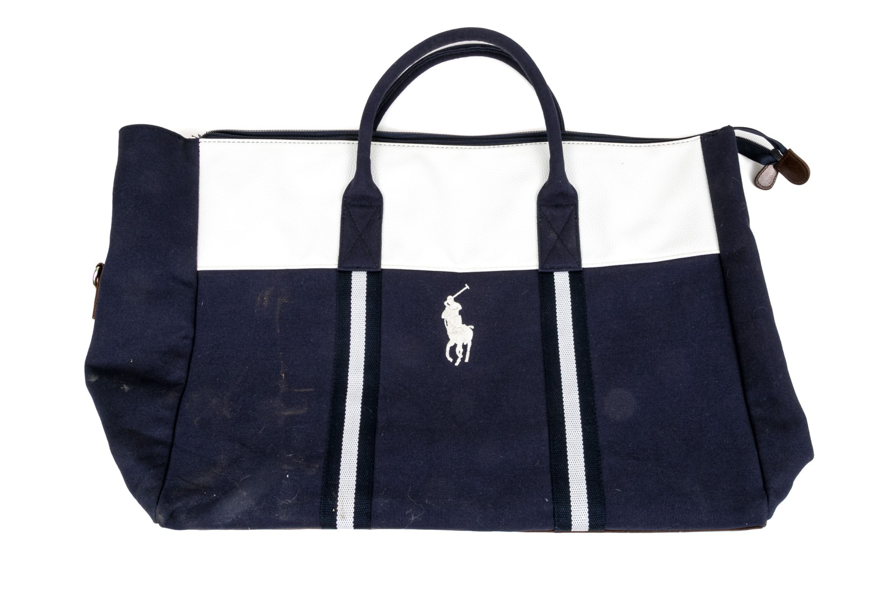 Ralph Lauren large blue cotton, white and brown leather top handle tote bag