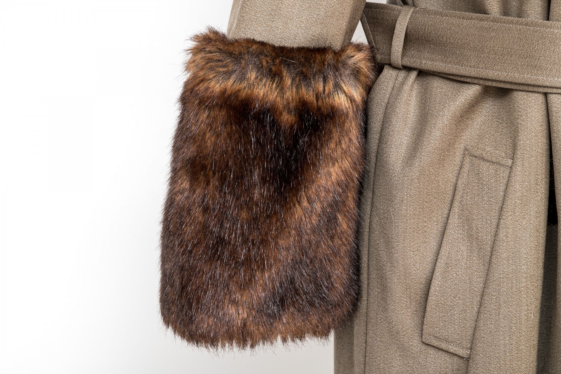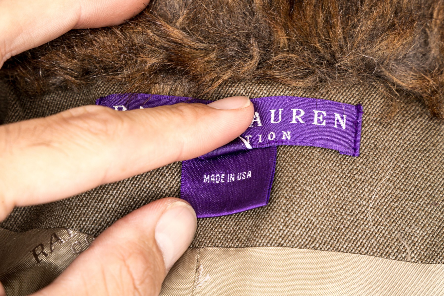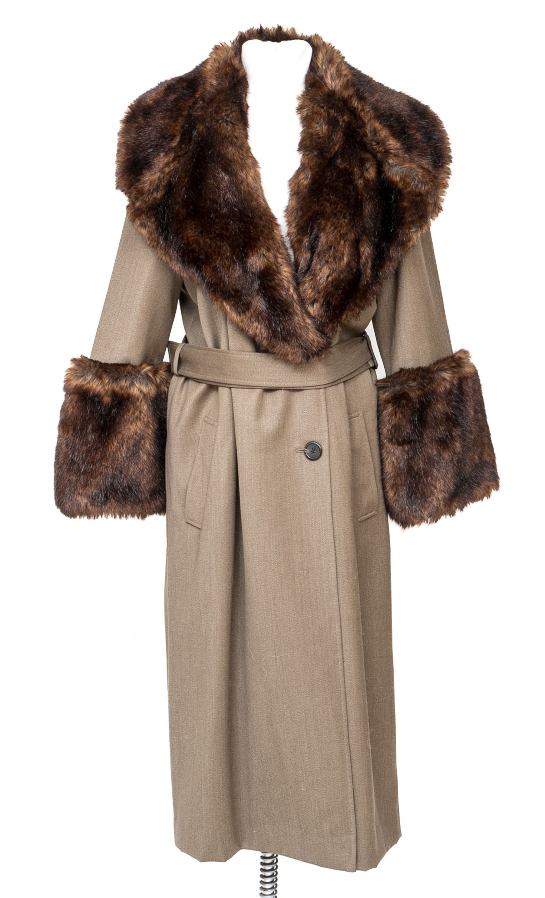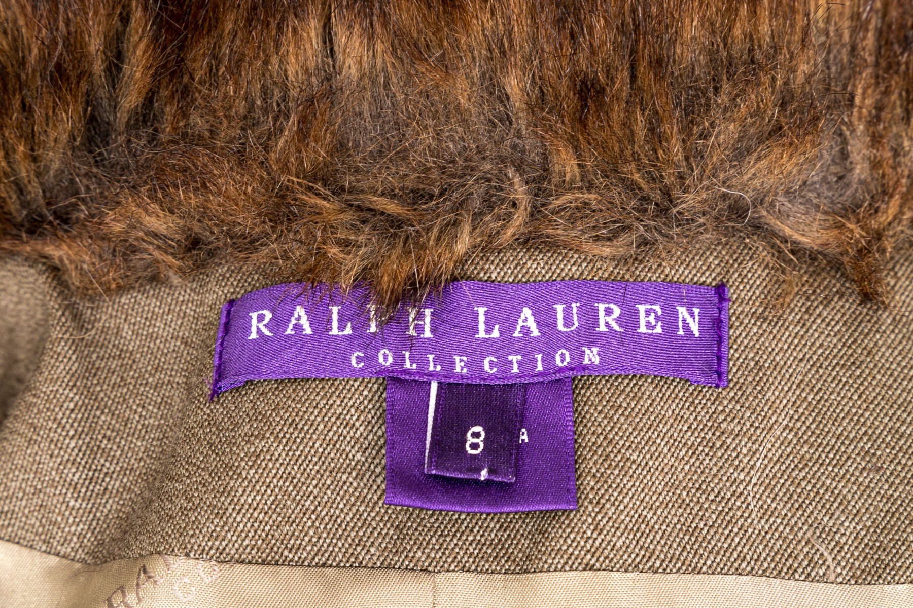 Ralph Lauren purple label tan wool belted faux fur trimmed coat, size 8