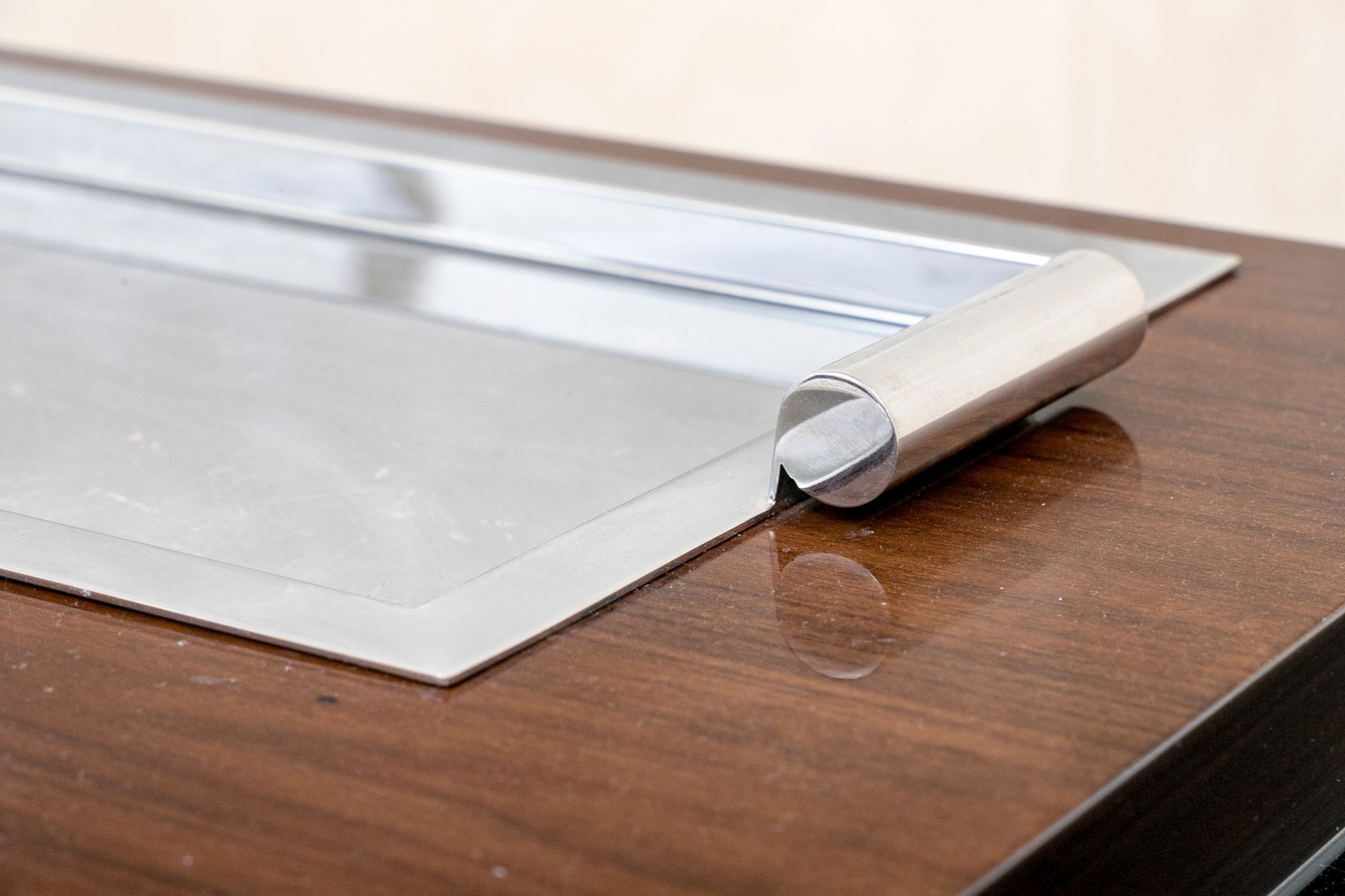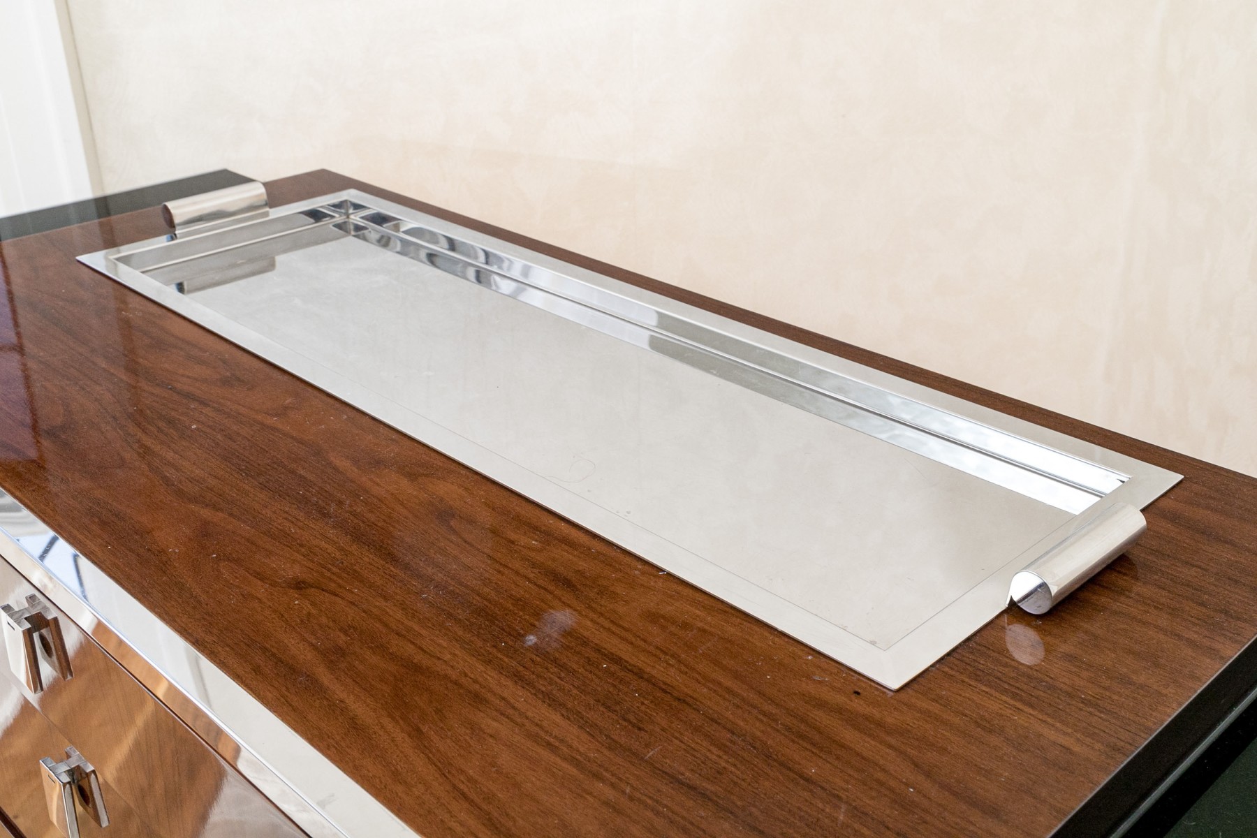 The bar features high quality hand-cast, polished stainless steel hardware, including a two handled serving tray which fits into a recessed place on the bar top.