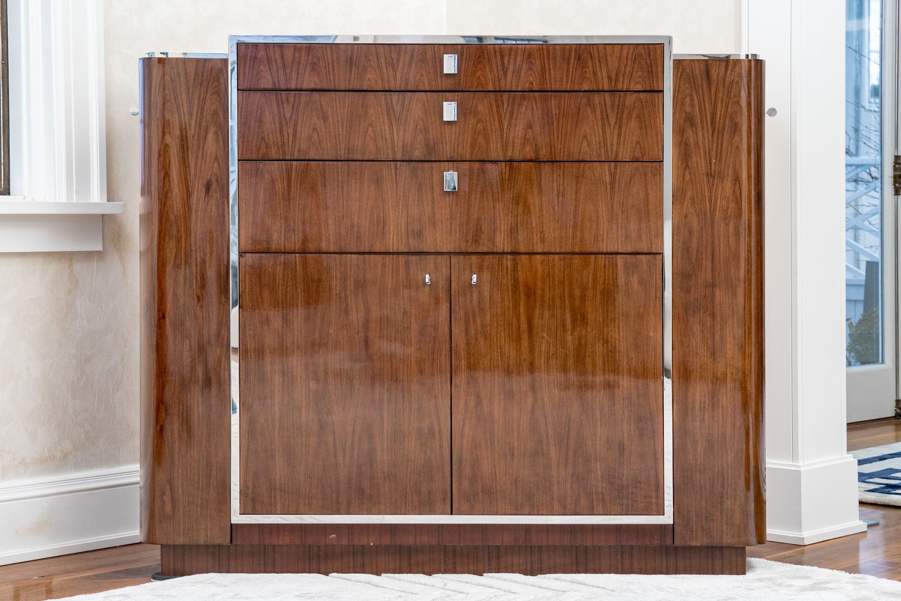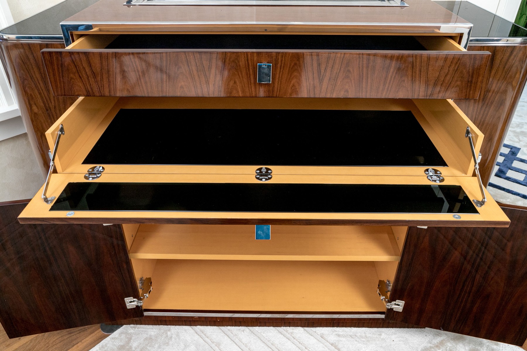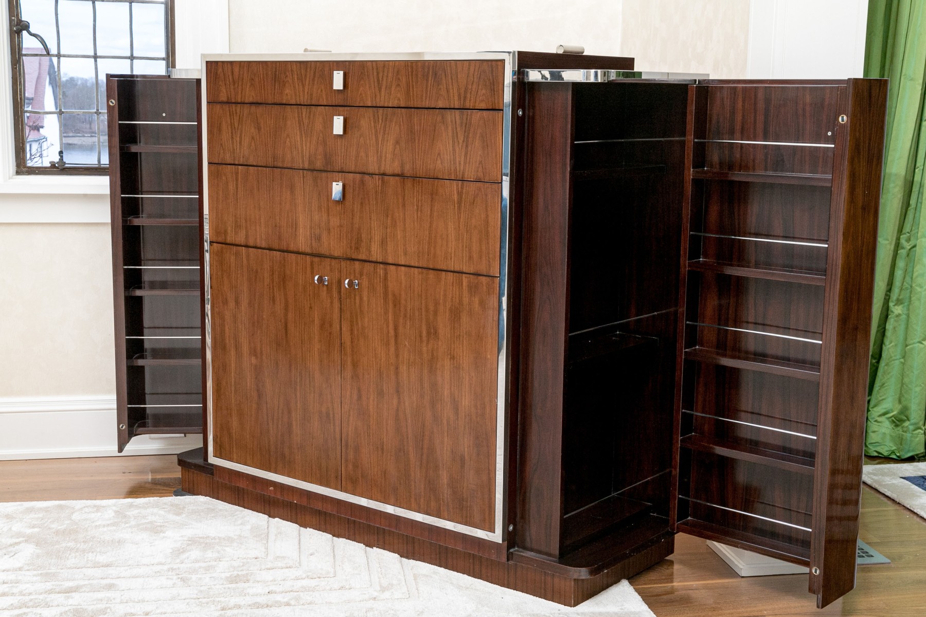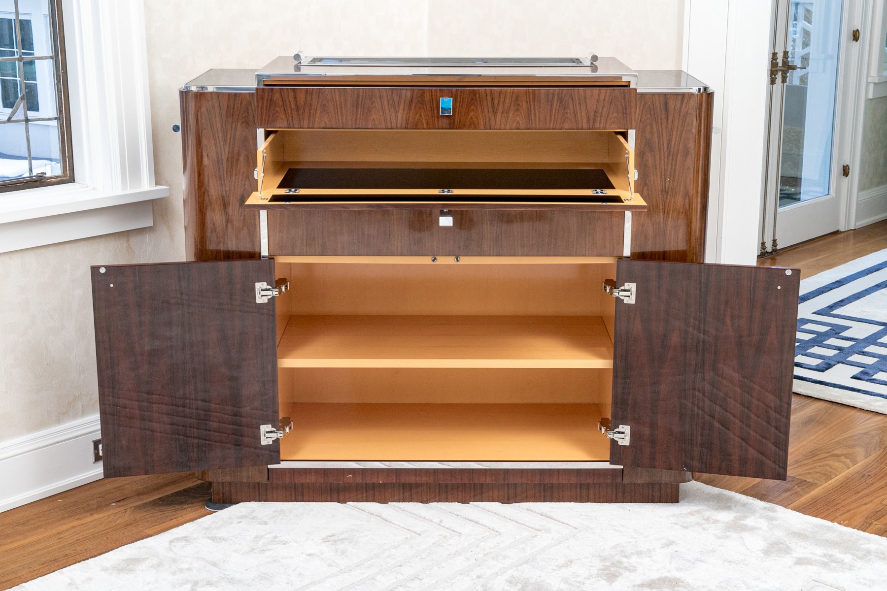 Designed as an inclusion of Ralph Lauren's Duke Collection. The bar cabinet is expertly crafted in the Art Deco style, the Ralph Lauren 'Duke' bar is crafted from solid hardwood with high quality Rosewood veneers.