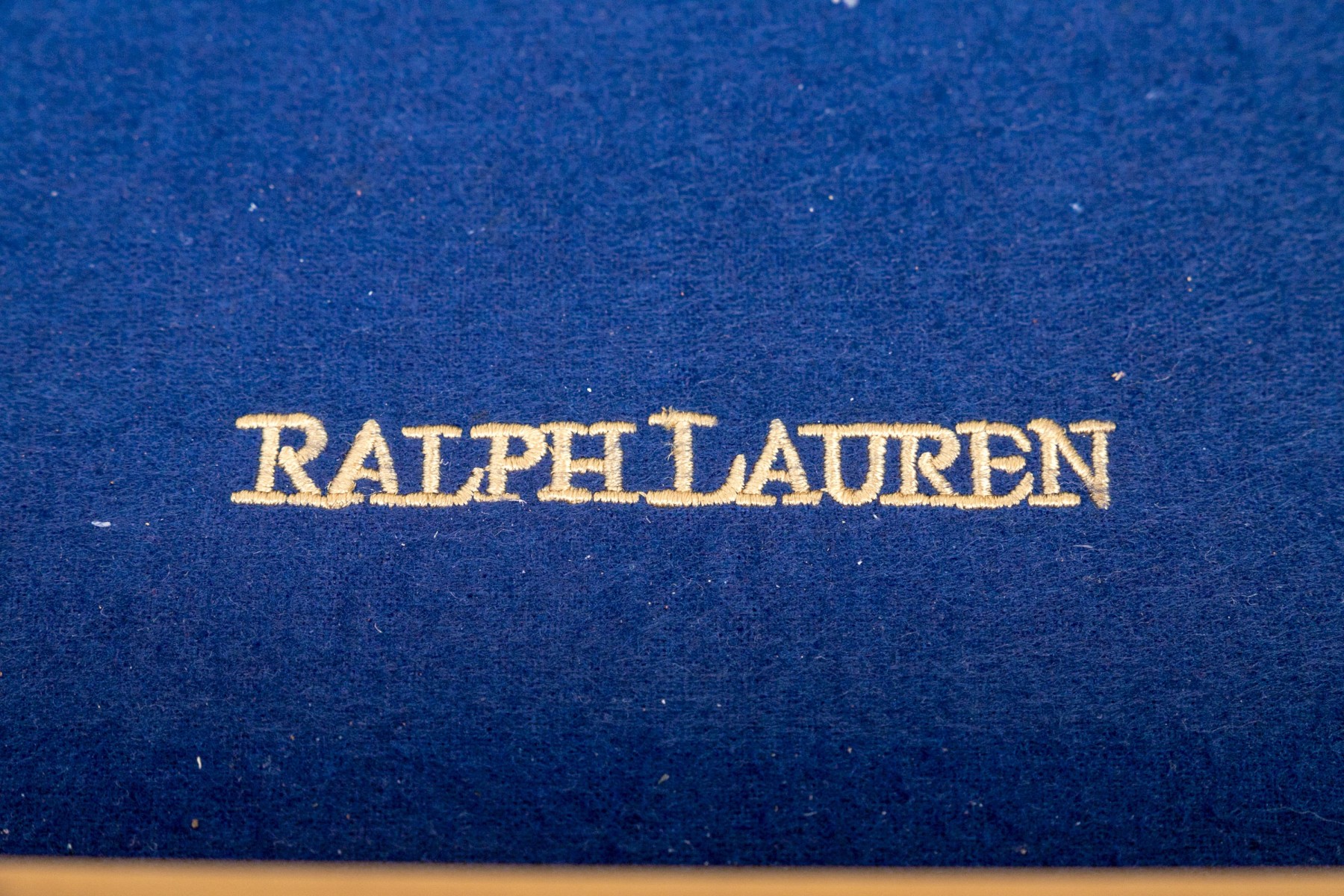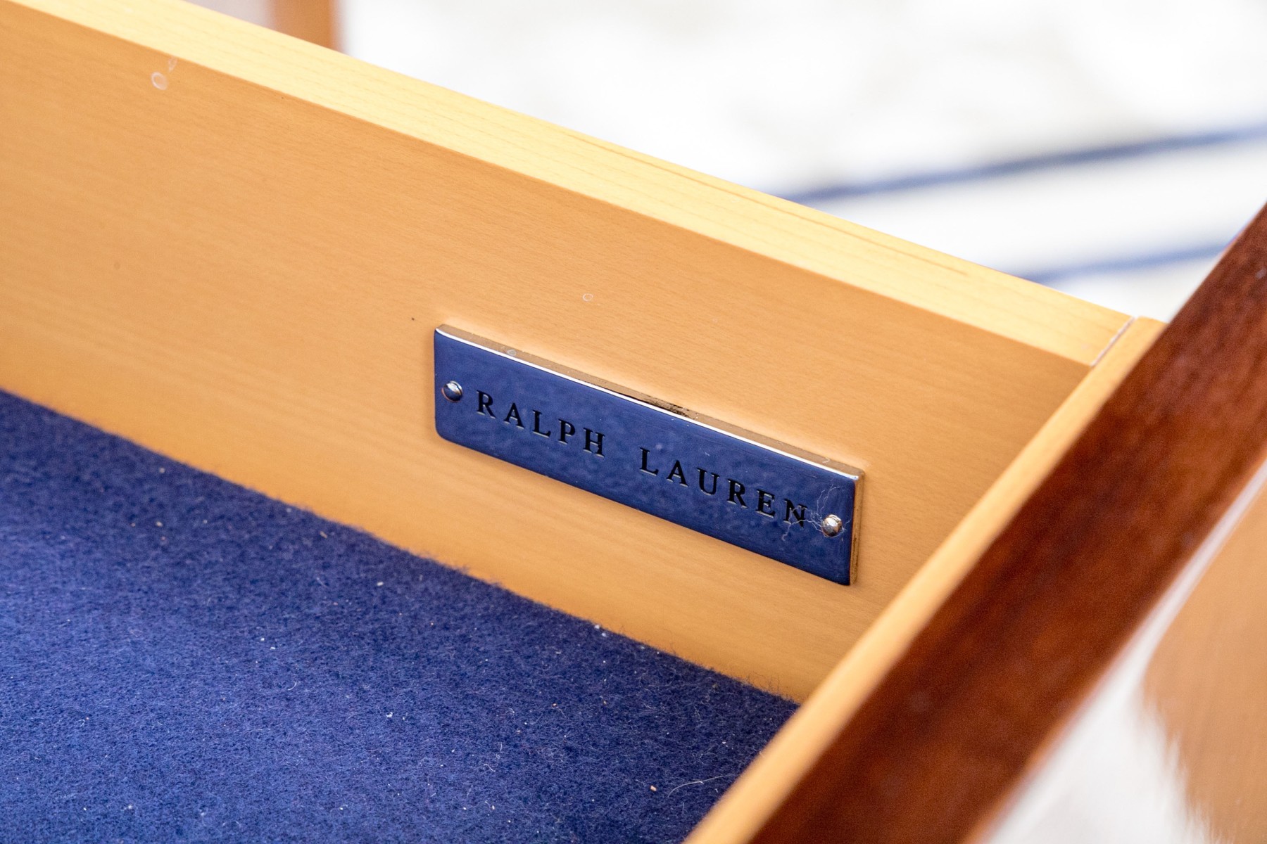 The 'Duke' bar boasts three drawers with, the top drawer having Ralph Lauren monogrammed velvet flatware liner. The second drawer features a hinged flip down front with black interior mirrored surface which pulls out. Below are two hinged doors with faux key drawer pulls, which open to a shelved interior compartment.