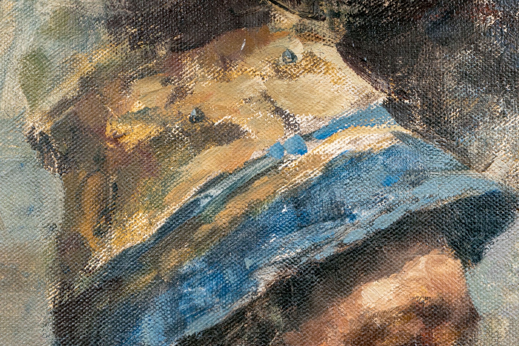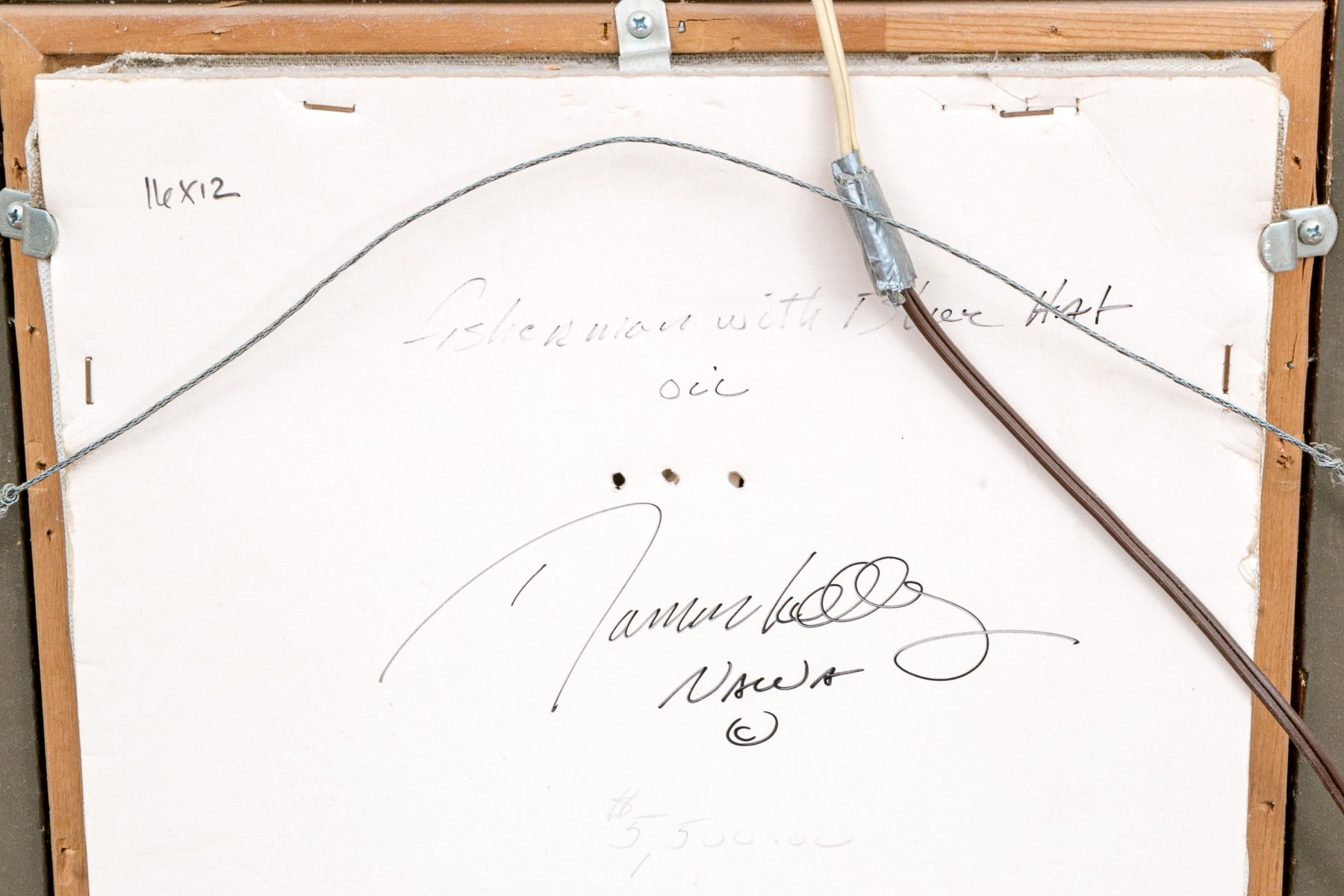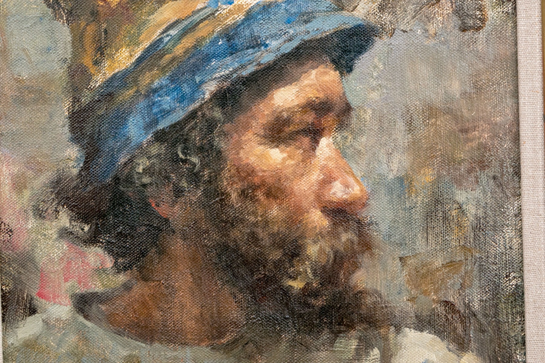 Ramon Kelley (American [WY], b. 1939) "Fisherman With Blue Hat" oil on canvas depicting an impressionist portrait of a man with his head turned in profile wearing a brown and blue bucket hat against a dappled blue, red, and brown background. Signed lower left and titled on the verso.