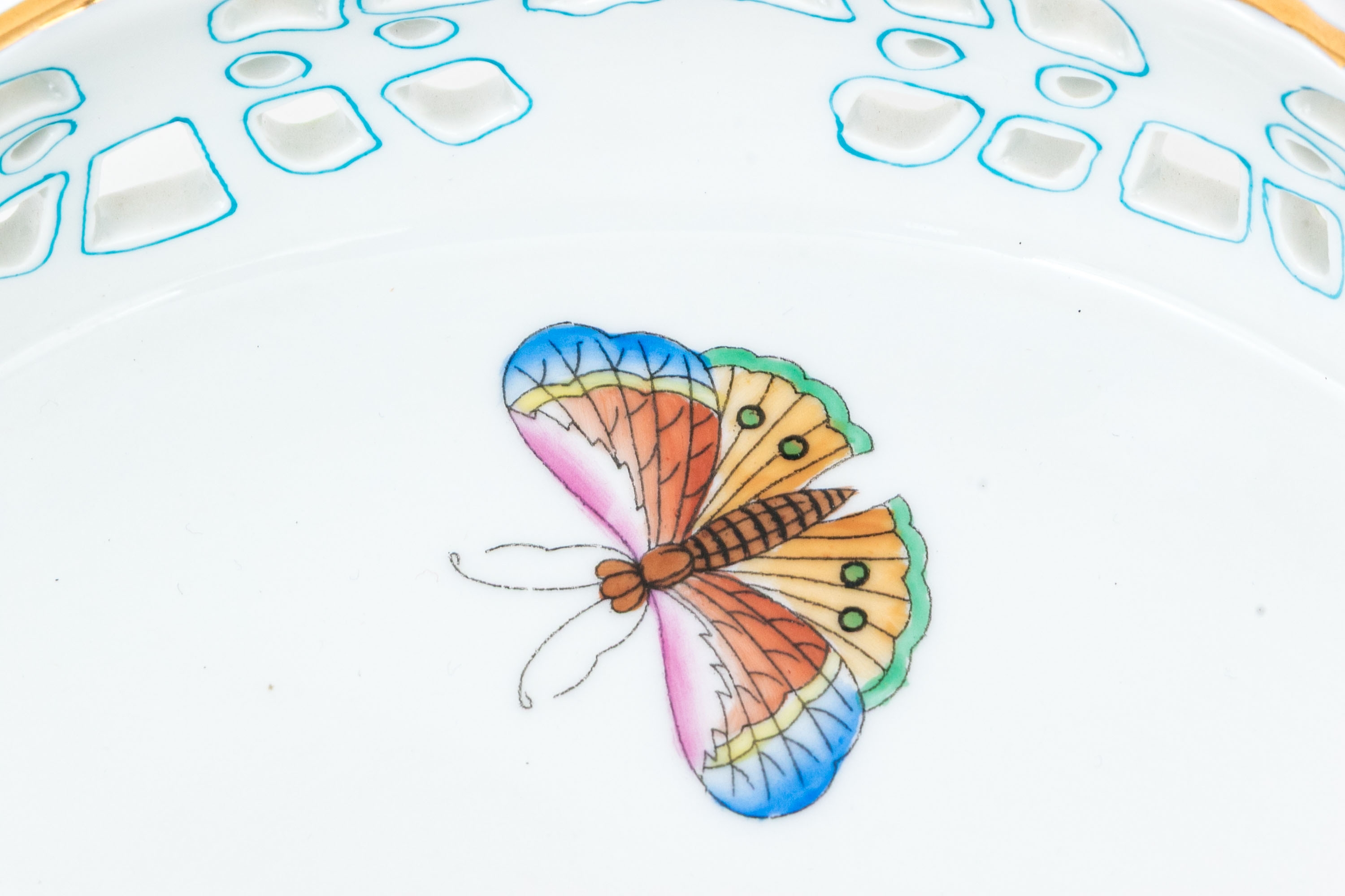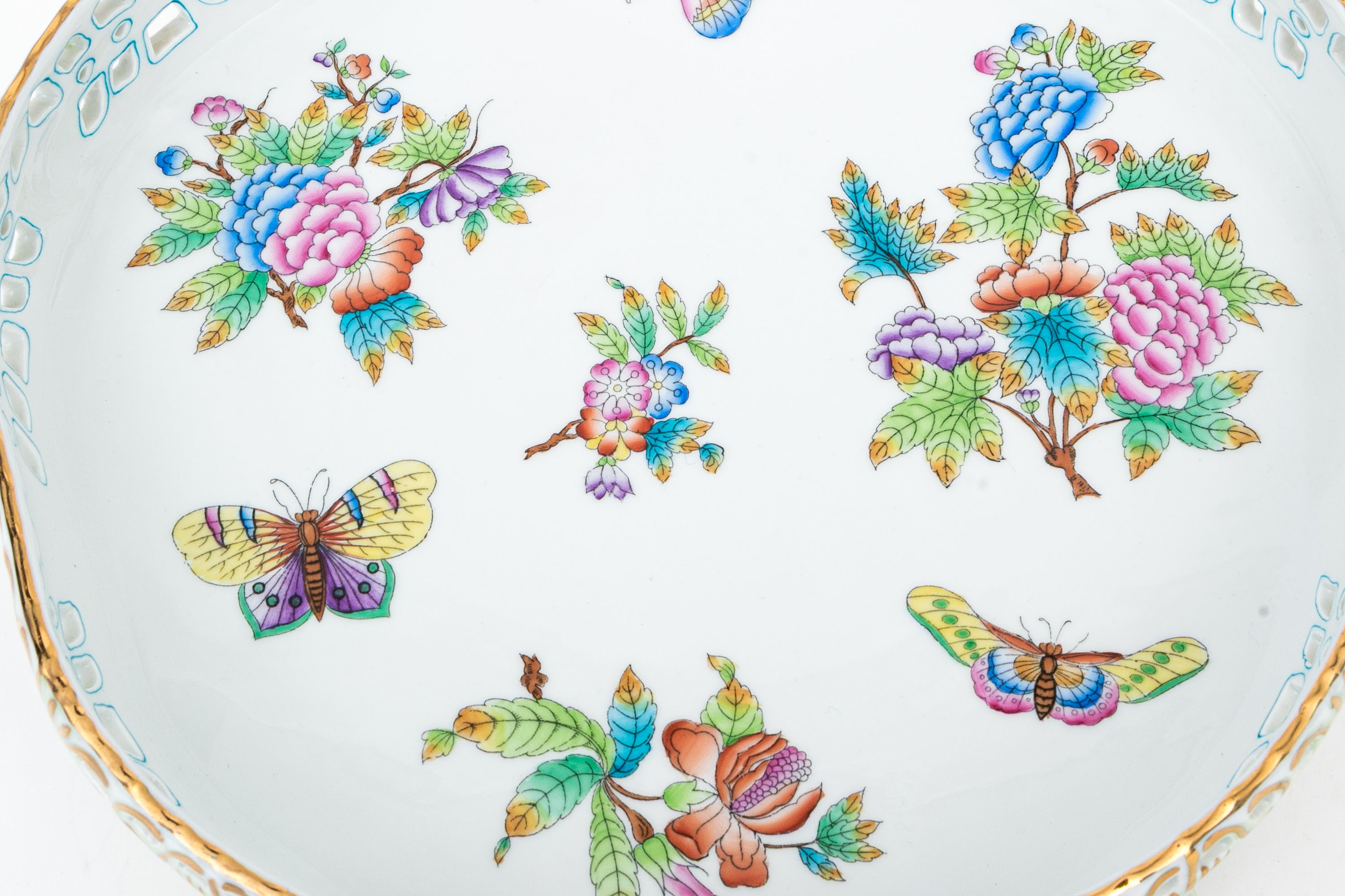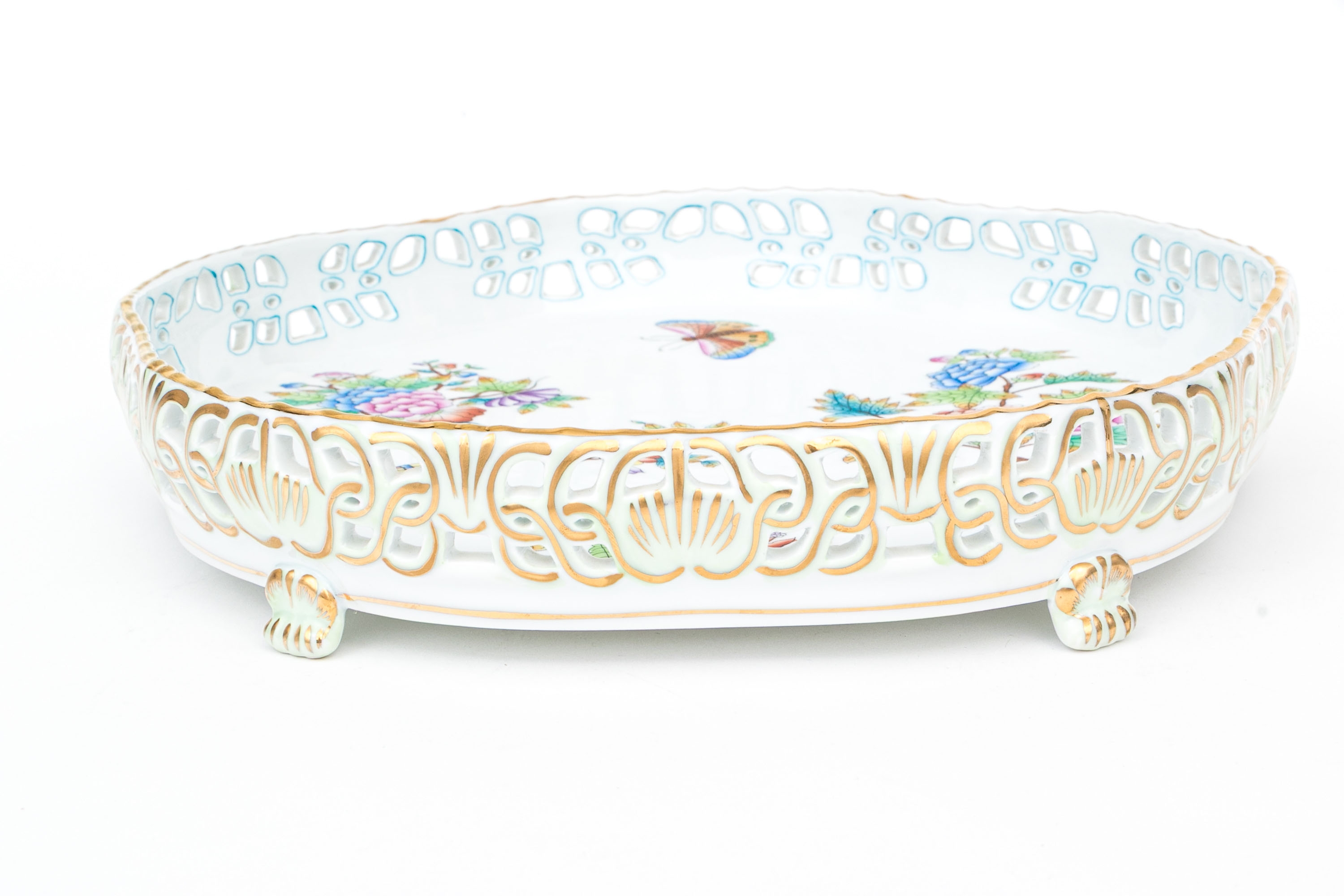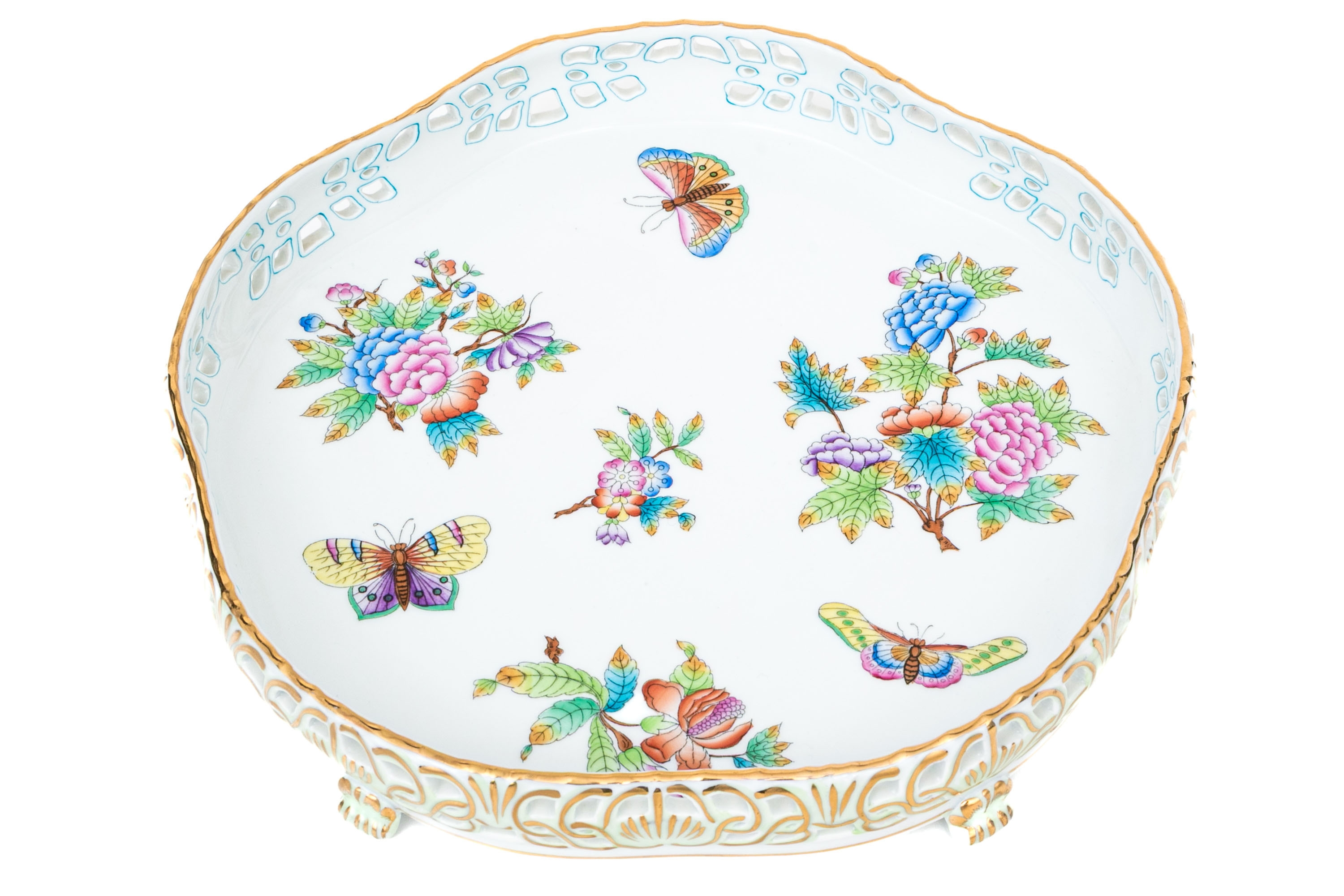 Herend Hungary hand-painted porcelain reticulated compote or footed tray in the Queen Victoria (VBO) pattern. This piece displays a lavish hand-painted motif of vibrant butterflies, peonies, and flowering branches, all executed in rich, jewel-like enamels of magenta, lilac, green, turquoise, and yellow. The openwork border is delicately reticulated with stylized scroll and fan motifs with a scalloped edge, accented throughout in 24k gold, while the piece rests on four shell-form gilt decorated feet. The underside bears the Herend blue shield hallmark with crossed paintbrushes and HANDPAINTED inscription, along with the form number 1535/VBO.