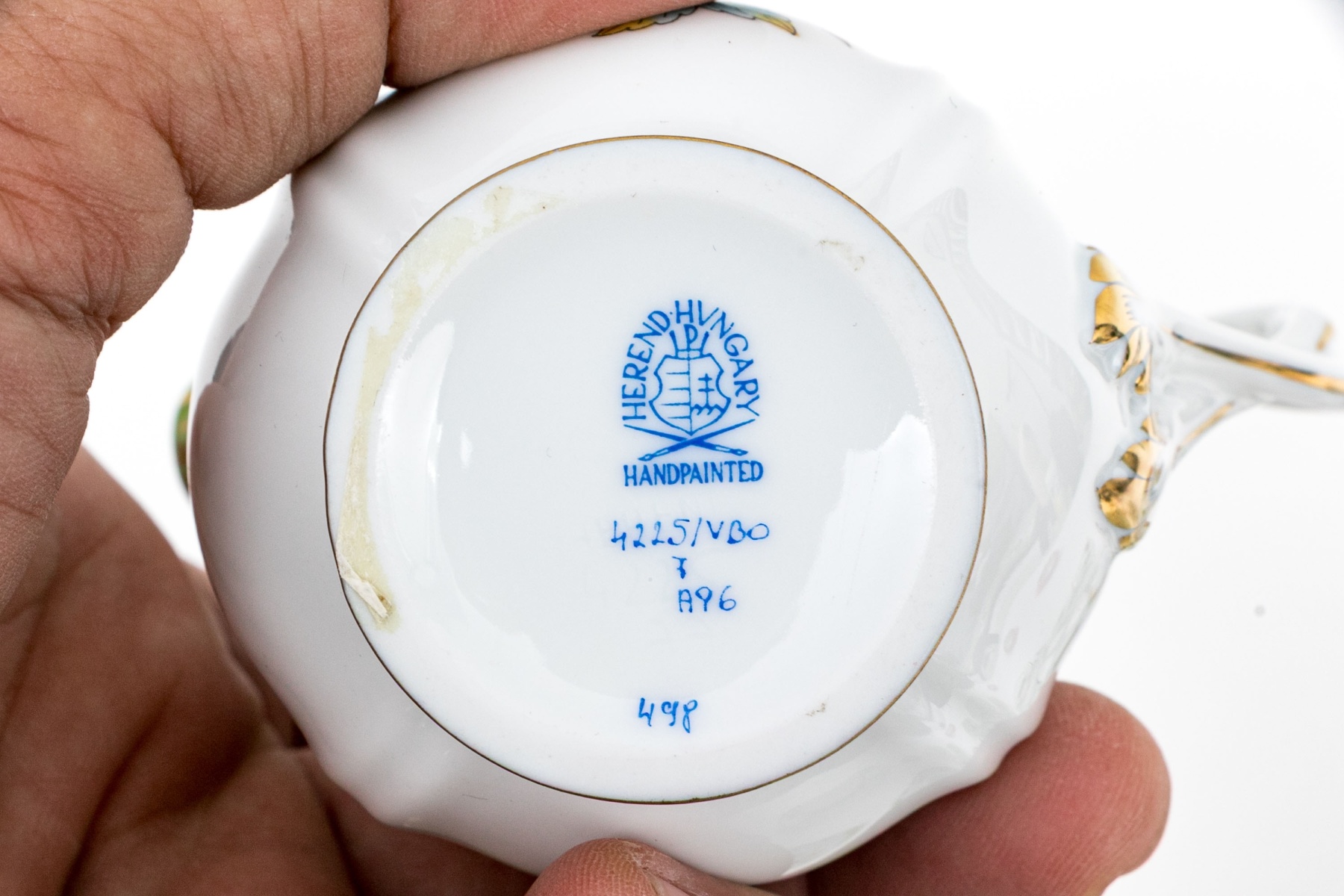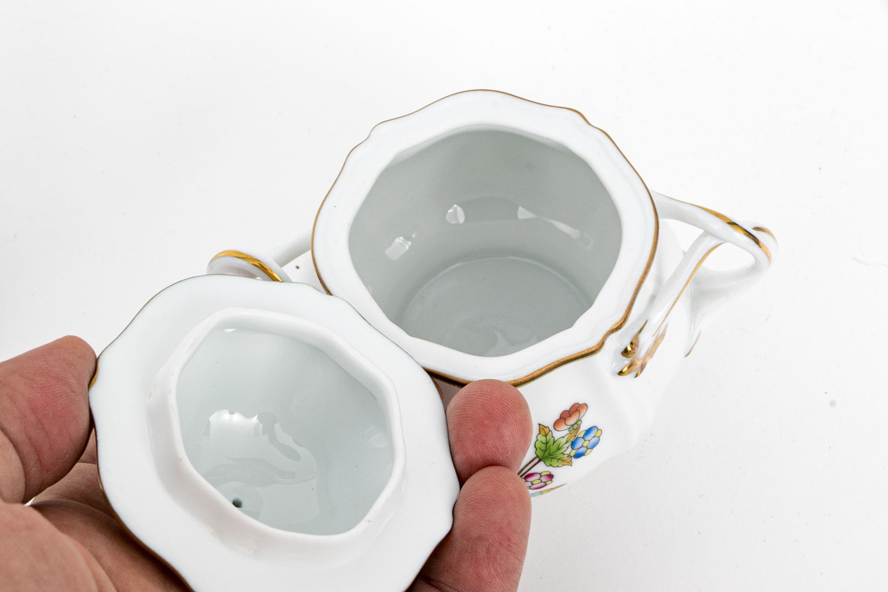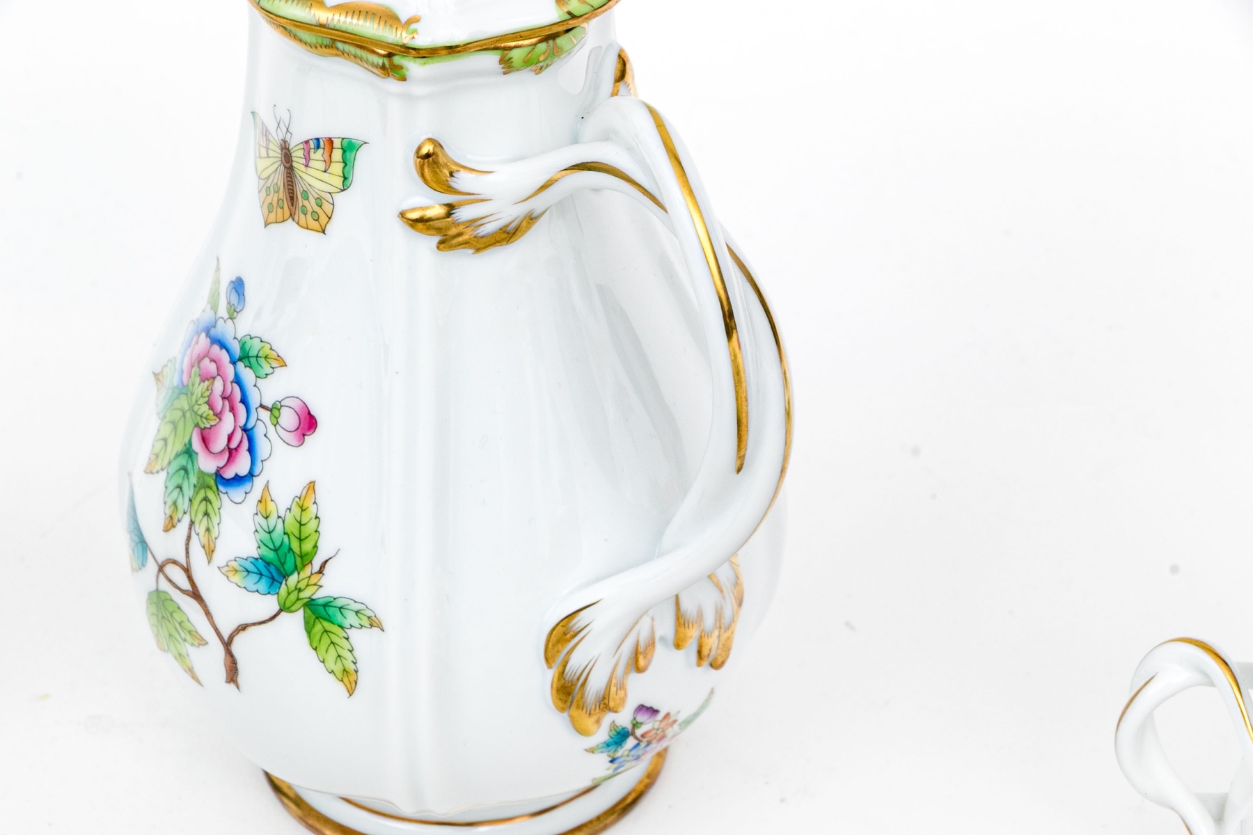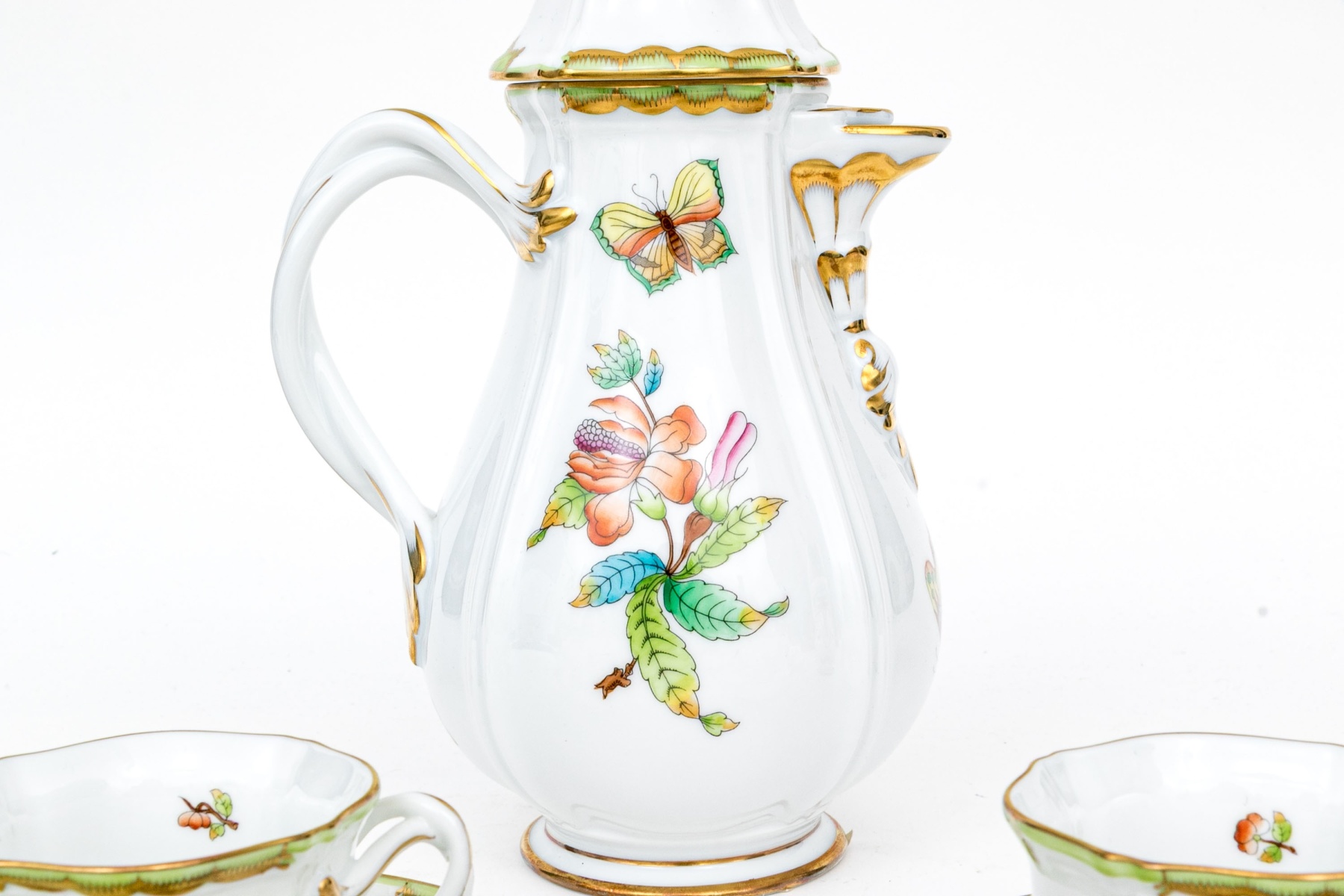 The coffee pot and sugar bowl lids feature the signature orange fruit finial with leaf detail, a hallmark of the Queen Victoria design. Each piece bears the Herend blue shield mark, inscribed HEREND HUNGARY HANDPAINTED and numbered 4227/VBO, 4225/VBO