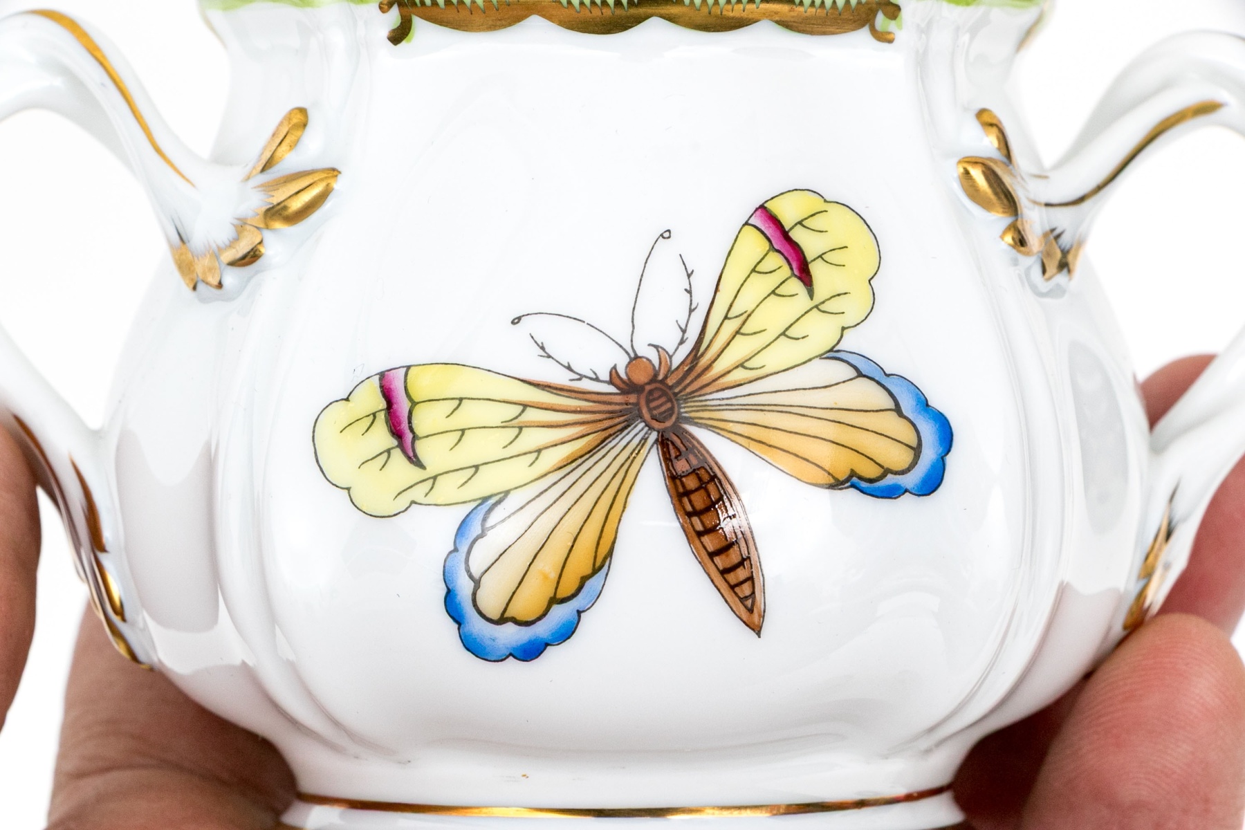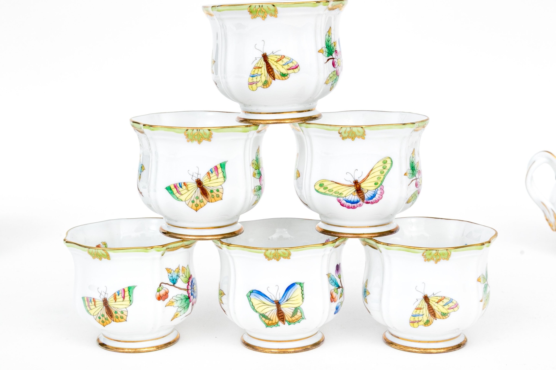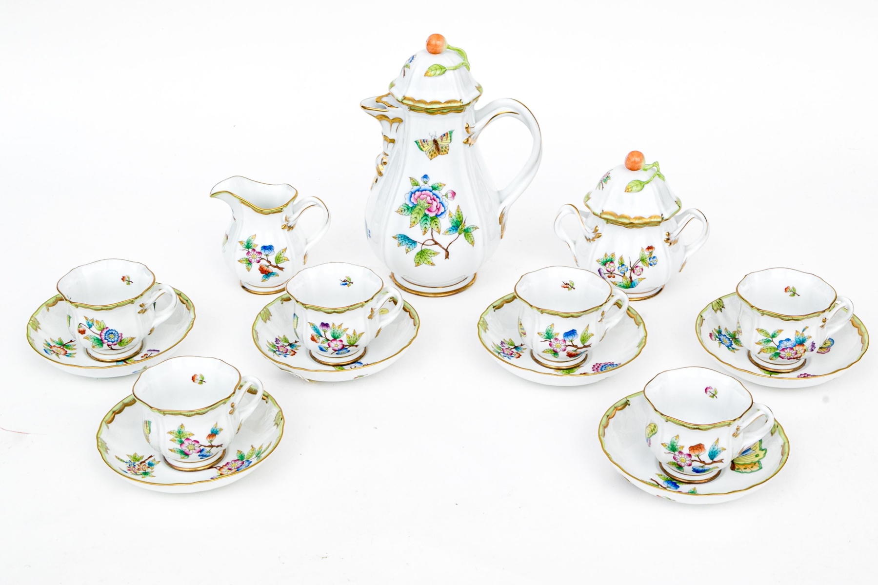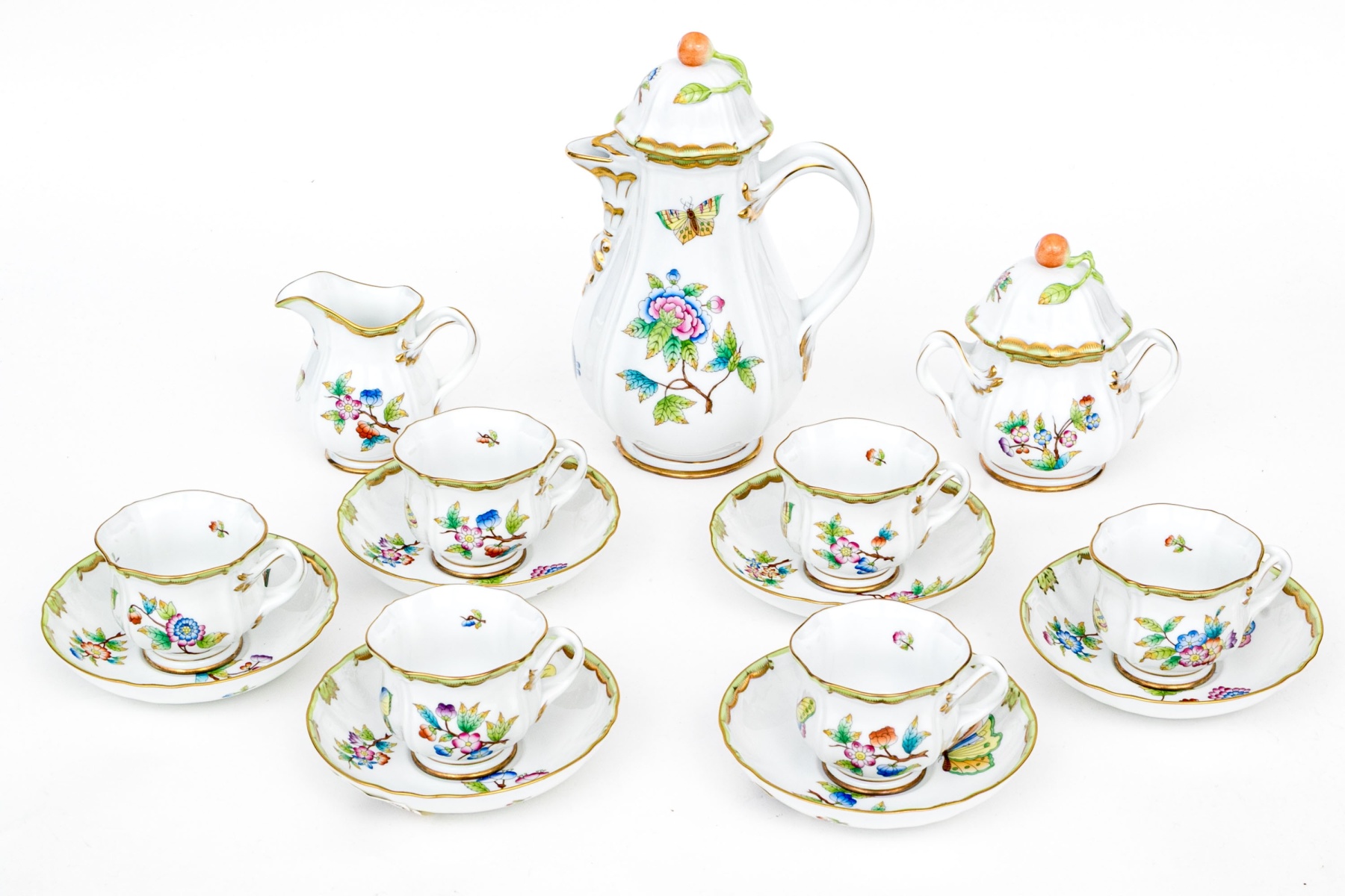 Herend Hungary hand-painted porcelain coffee service for six in the Queen Victoria (VBO) pattern, featuring bright floral sprays, butterflies, and gilt detailing. The set includes a coffee pot with lid, creamer, covered sugar bowl, and six cups with matching saucers The porcelain surfaces are richly decorated with multicolored peony blossoms, butterflies, and stylized leaves, accented with hand-applied 24K gilt trim along the rims, handles, and finials. The distinctive molded, scalloped edges and delicate ribbing highlight Herend’s attention to form as well as decoration.