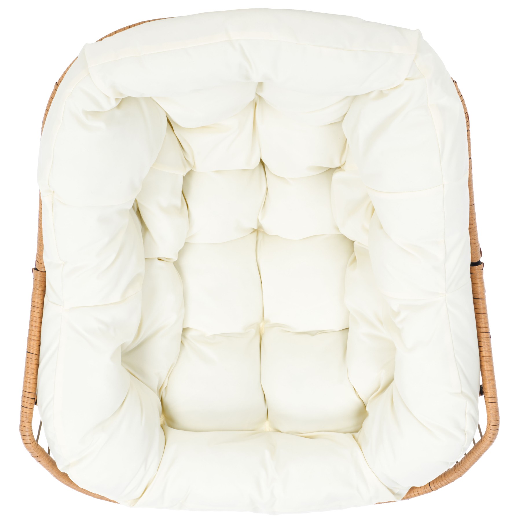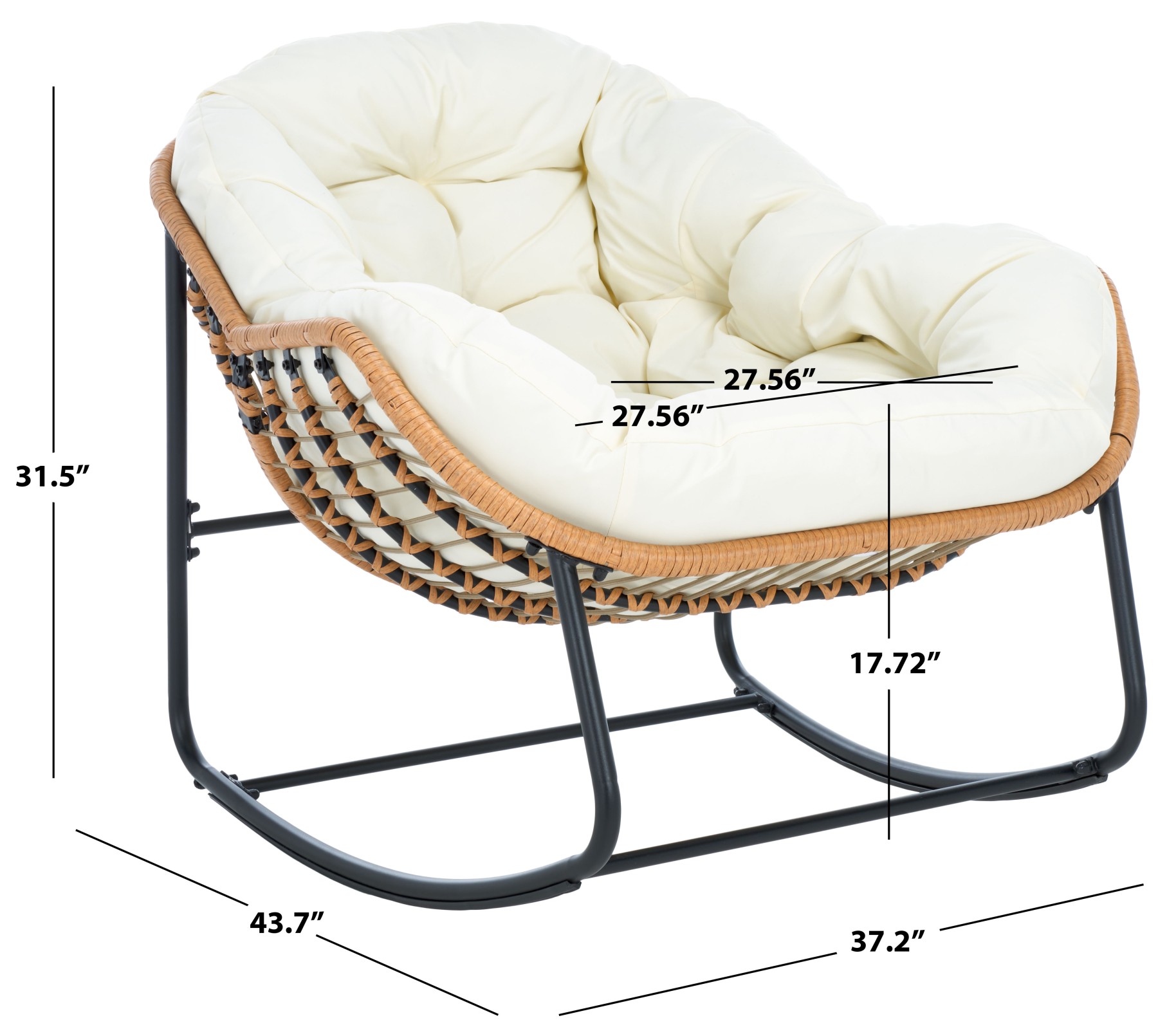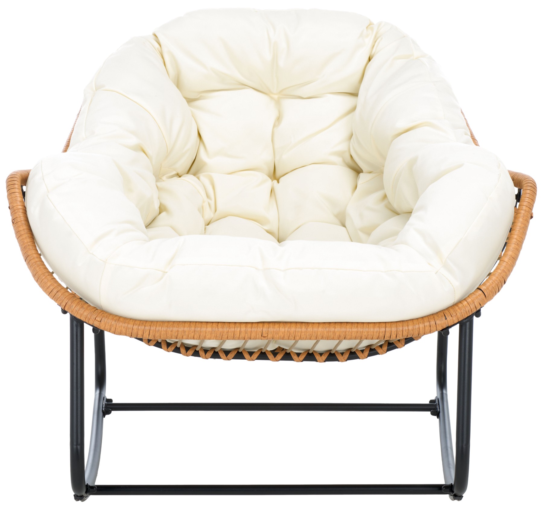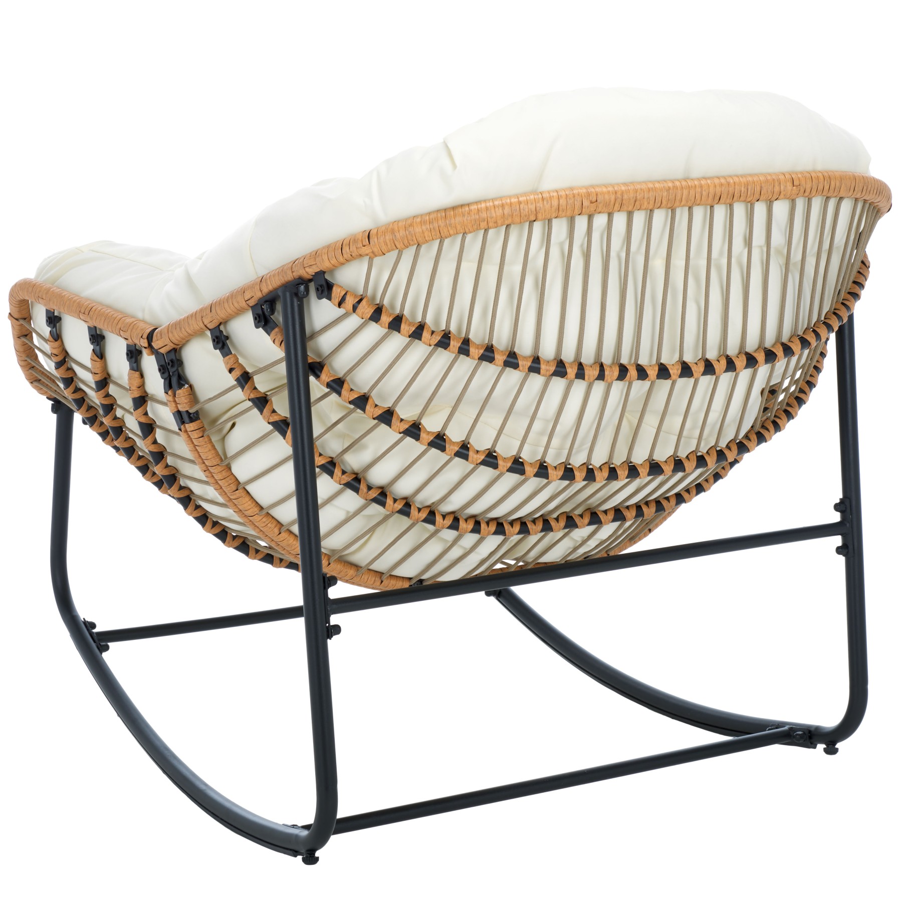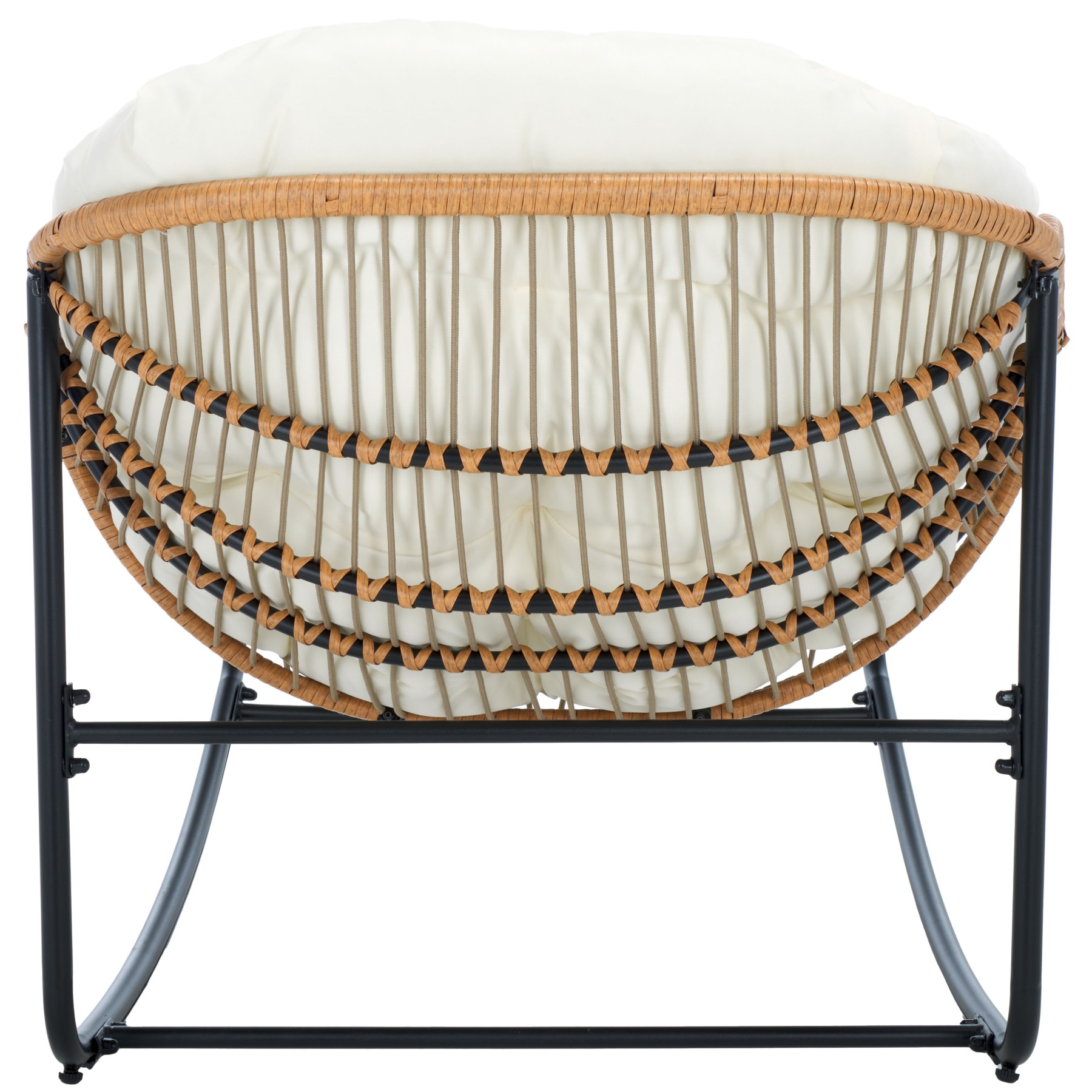 Embrace a relaxing retreat with our chic and comfy Ravena rocking chair. Our breezy and minimalist chair delivers effortless functionality and comfort. With a scoop-shaped profile, the chair provides ample room to sink in and relax. Its sculptural silhouette is crafted from rattan to offer rich textures and breezy appeal. It is topped with an elegantly tufted, beige-coloured seat for the perfect finishing touch. The padded seat follows the voluminous contours of the body to embrace your body with comfort. The rocking chair is perched upon slender, powder-coated steel legs to lightly sway and provide the perfect space to read, lounge, and enjoy a nap outdoors.