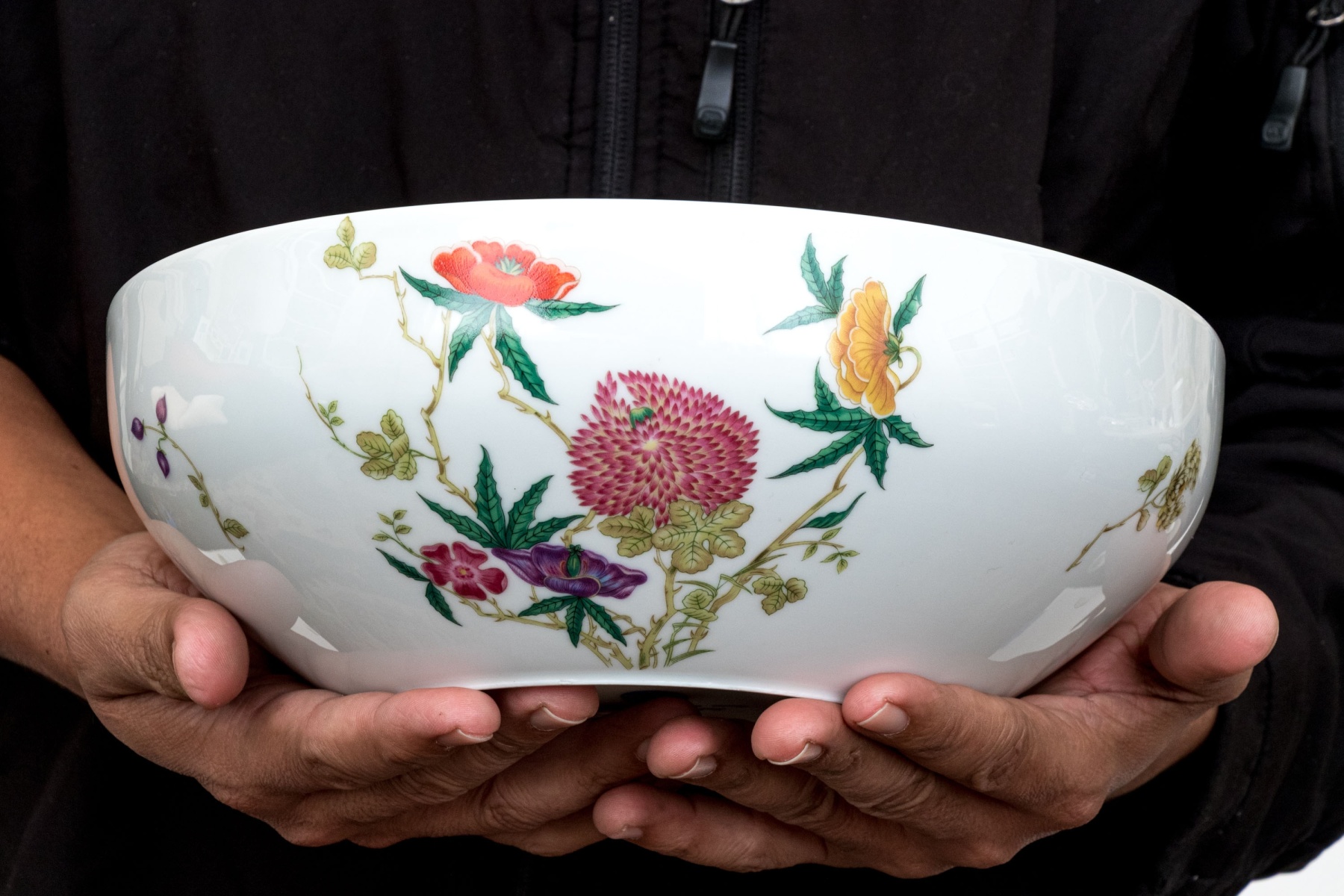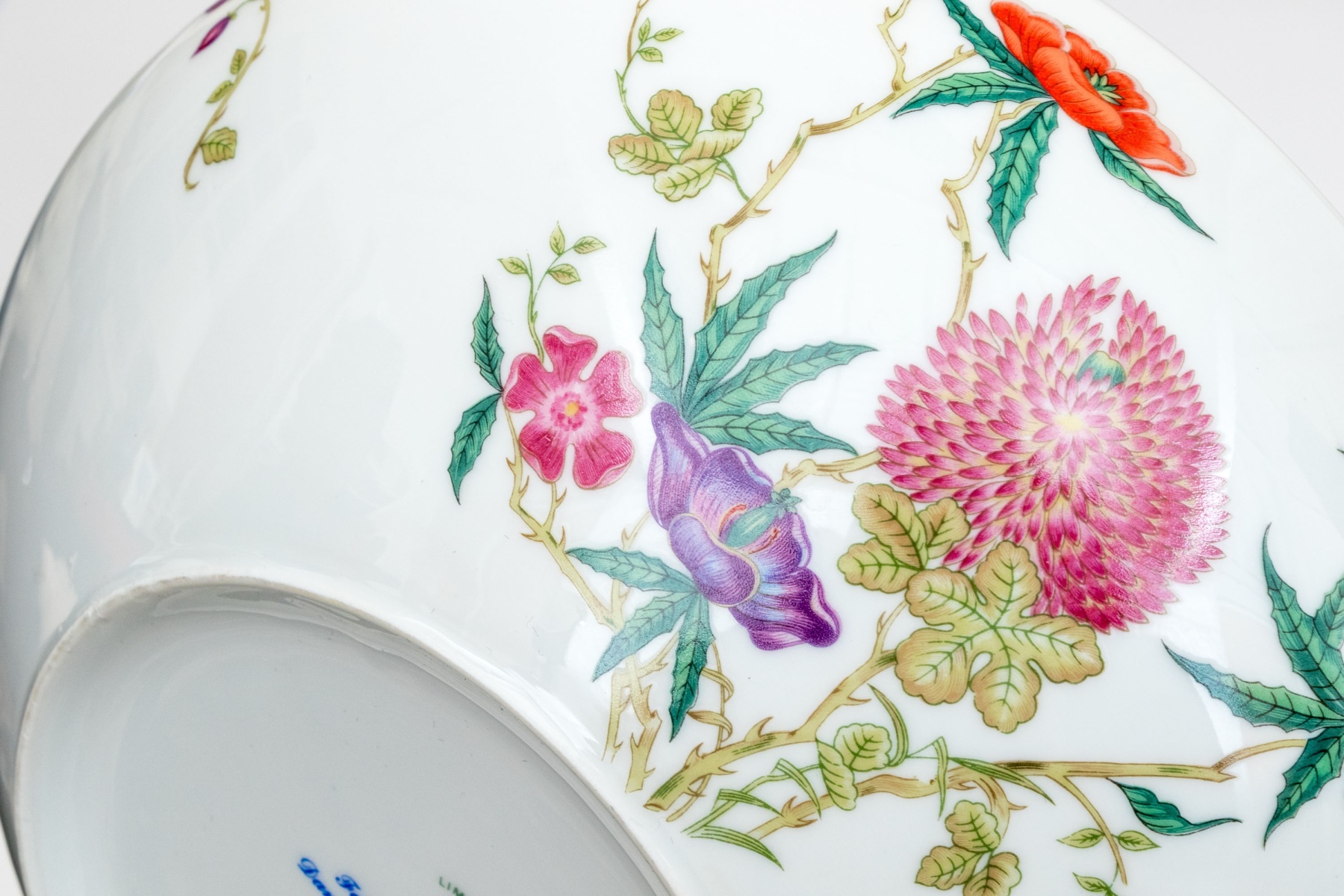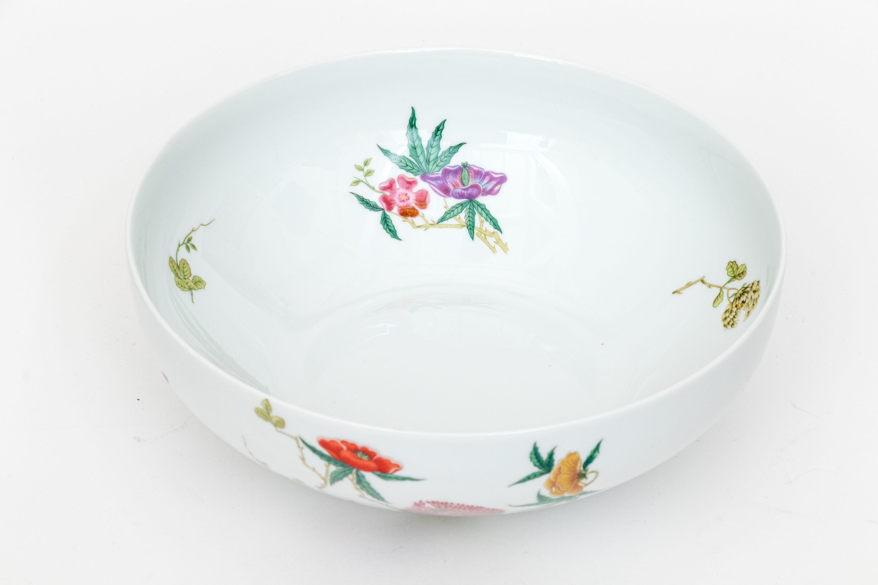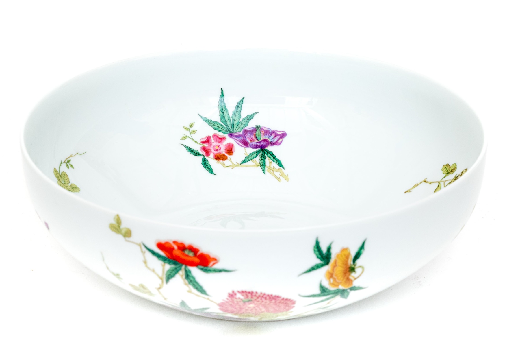 A gorgeous Raynaud & Co. Limoges porcelain bowl decorated with chinoiserie floral sprays in rich orange, yellow, purple, and plum on yellow-green branching foliage against a bright white ground. Marked underfoot.
