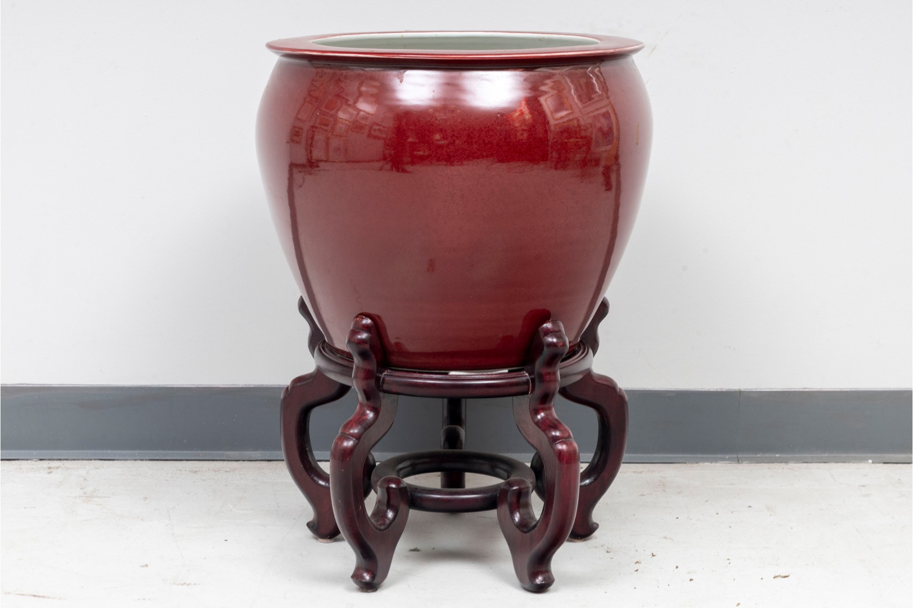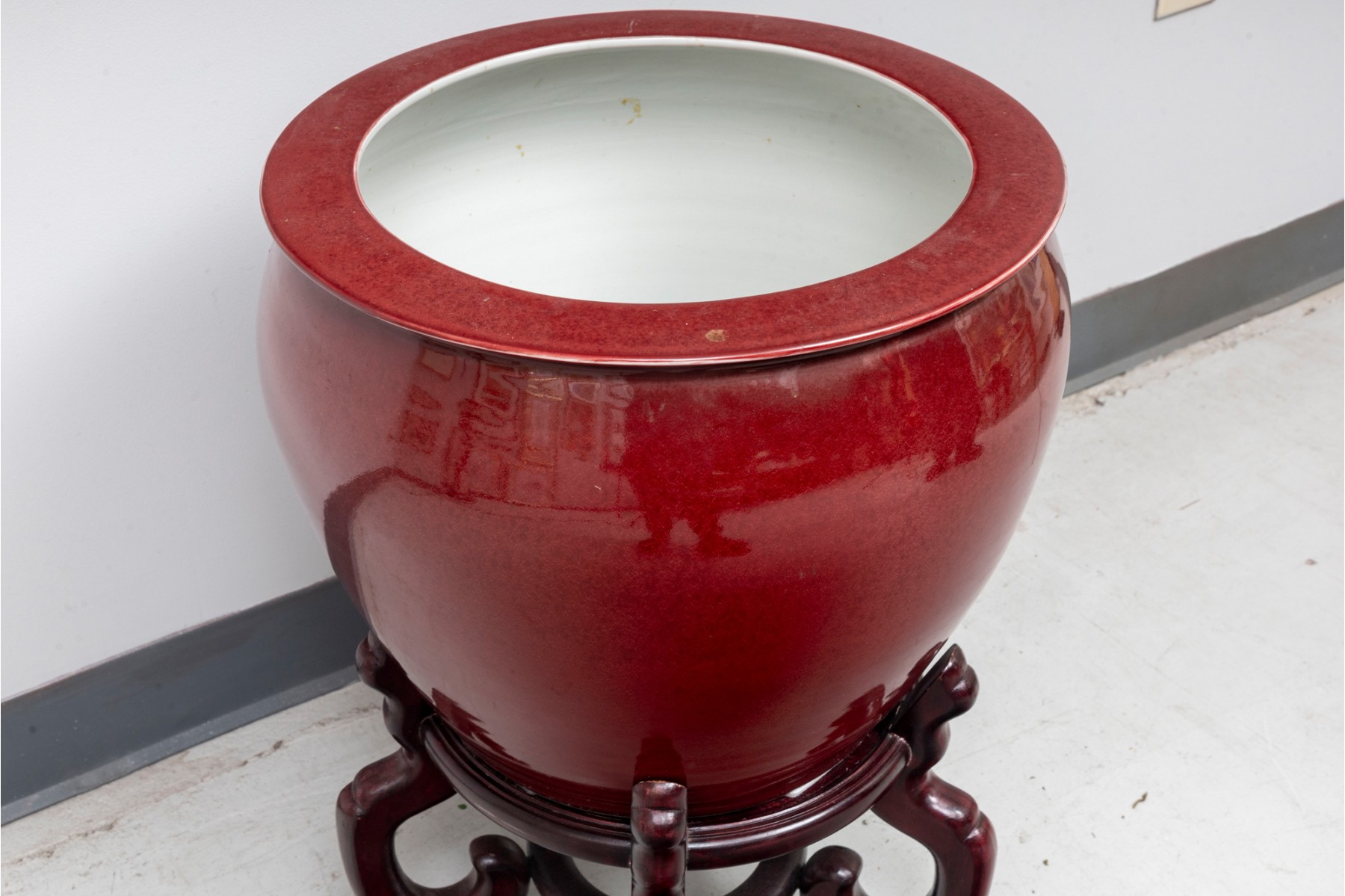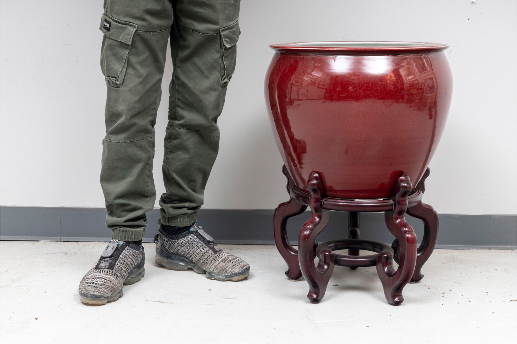A large gloss red glaze ceramic fishbowl planter — Chinese, complete with oriental wood stand.