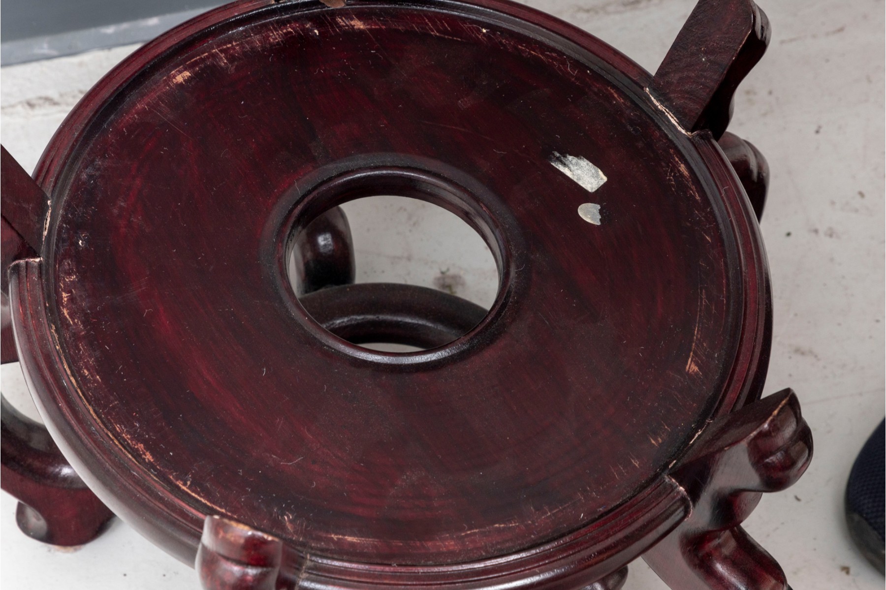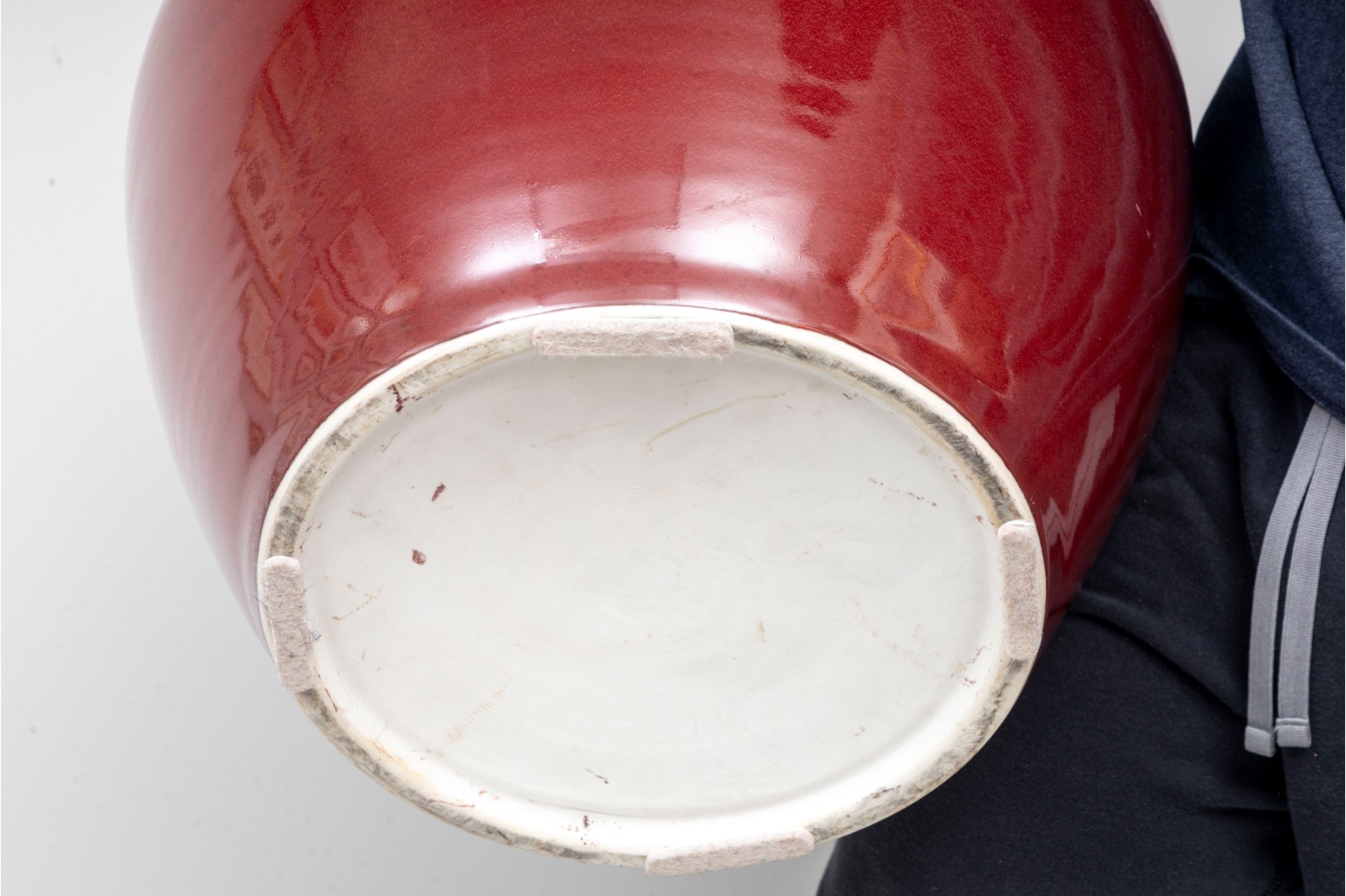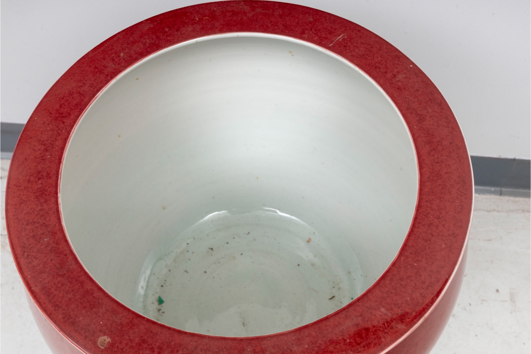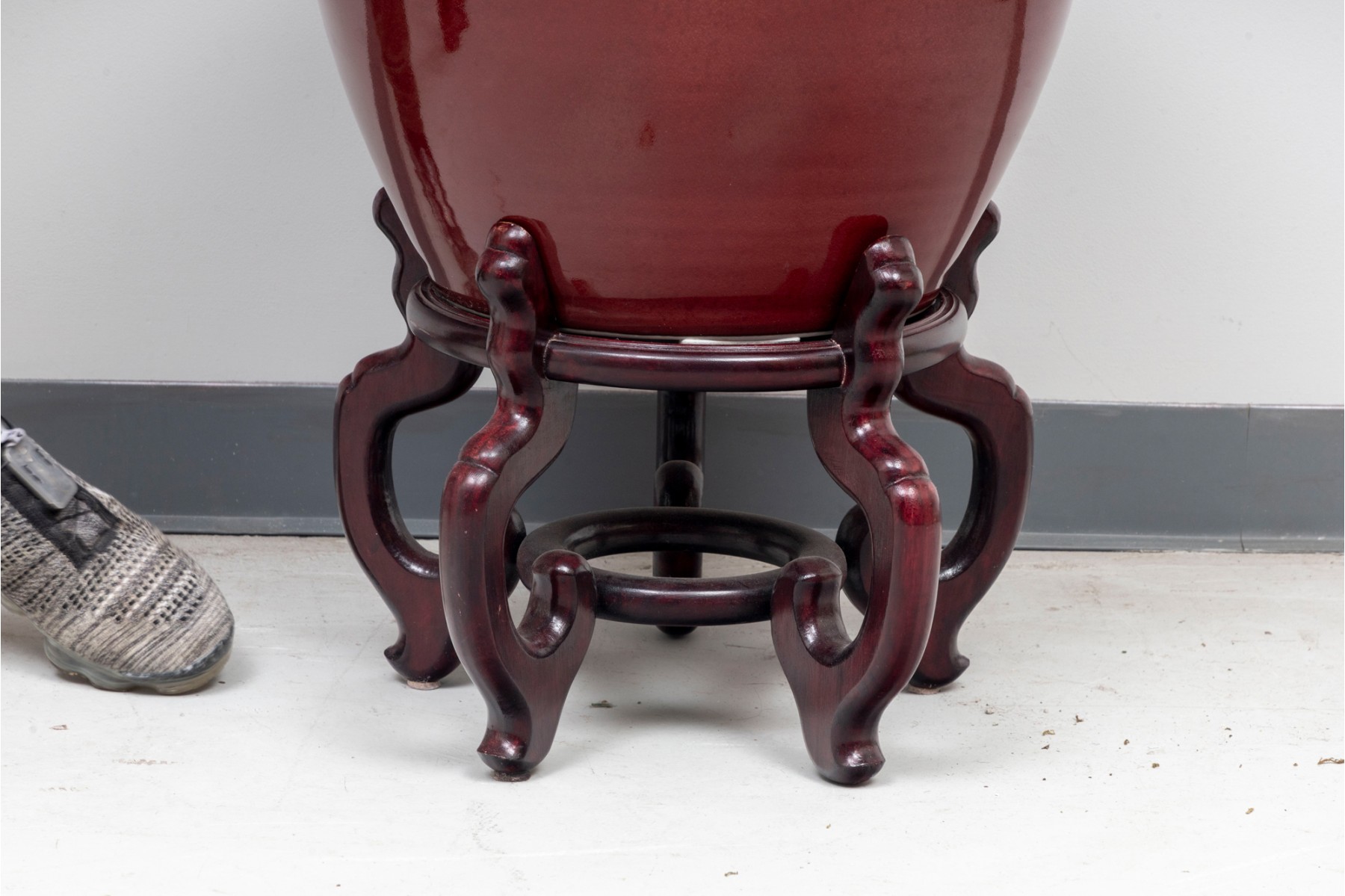 A large gloss red glaze ceramic fishbowl planter — Chinese, complete with oriental wood stand.