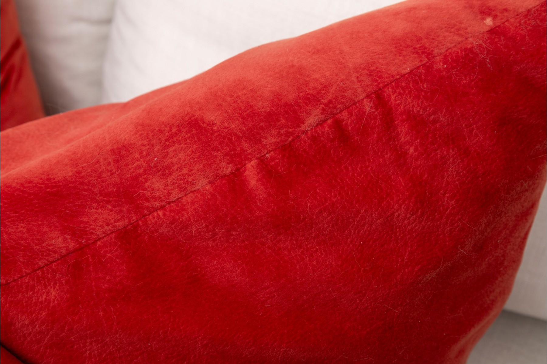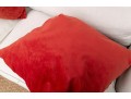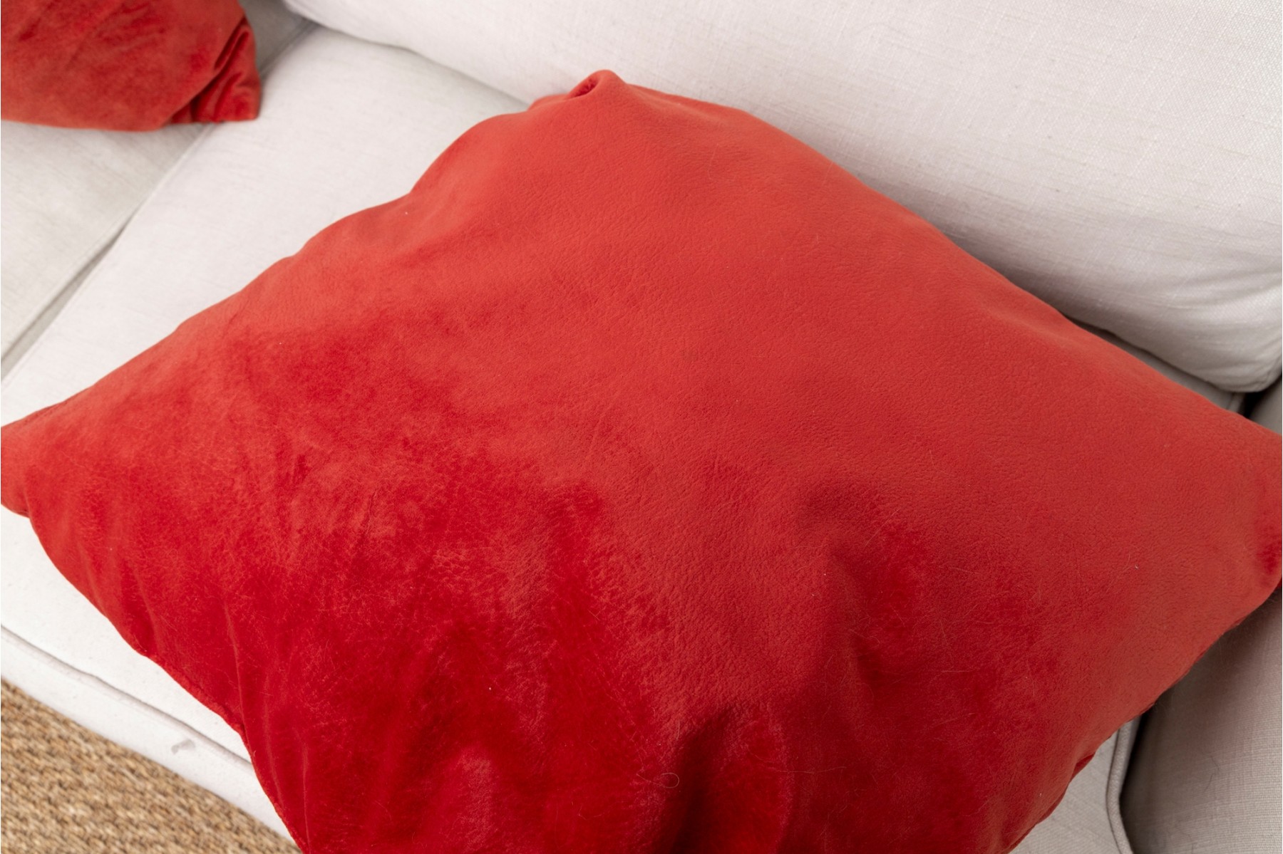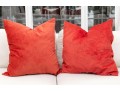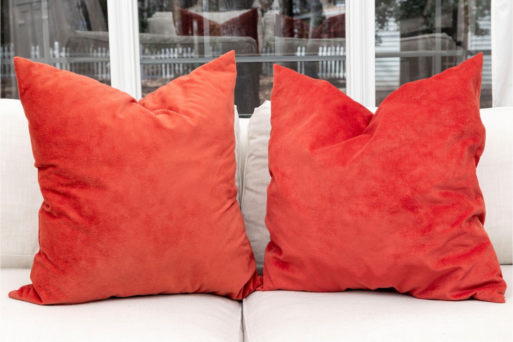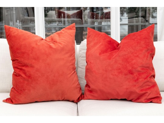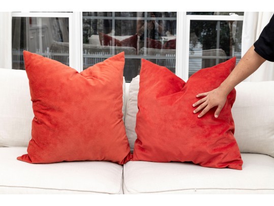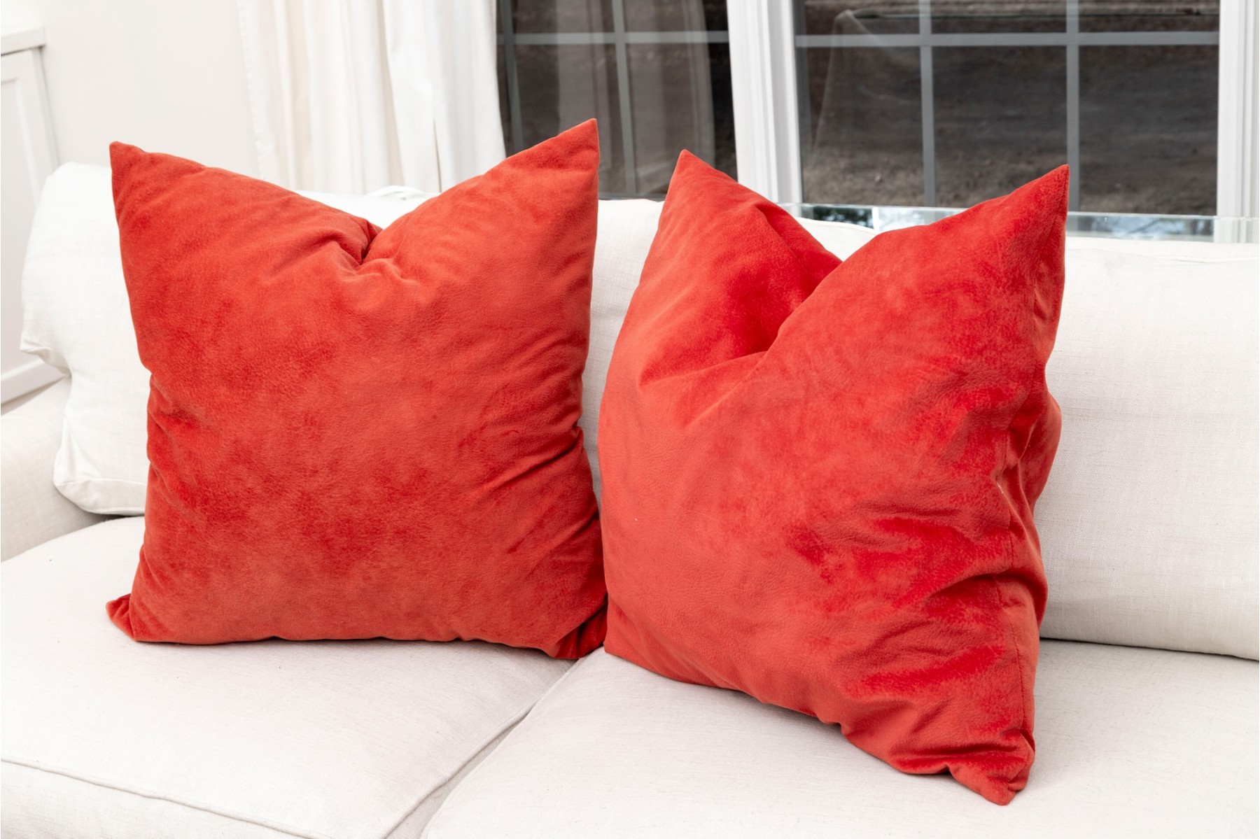 A pair of microfiber throw pillows in a rich red, perfect as a pop of color to any ensemble.