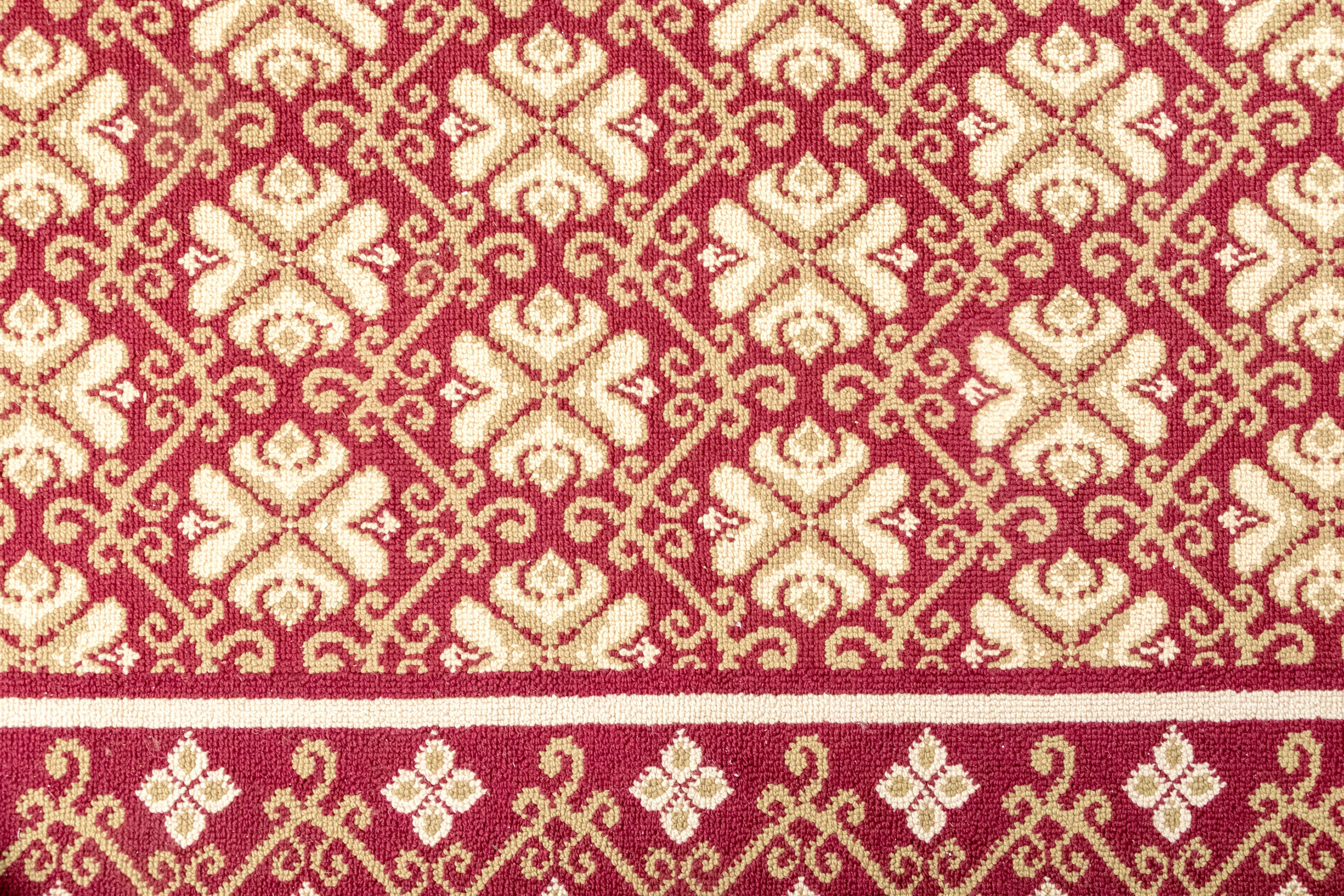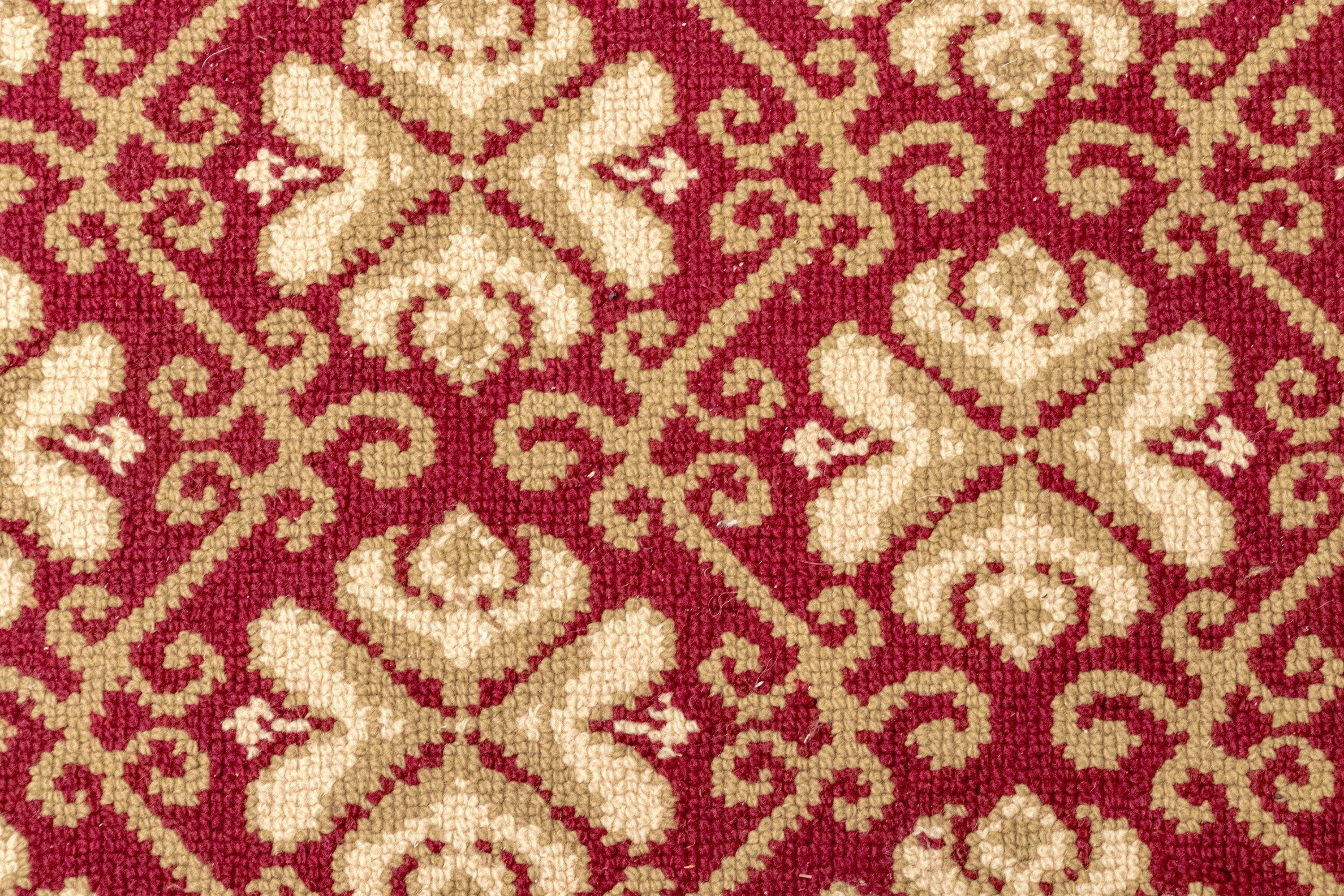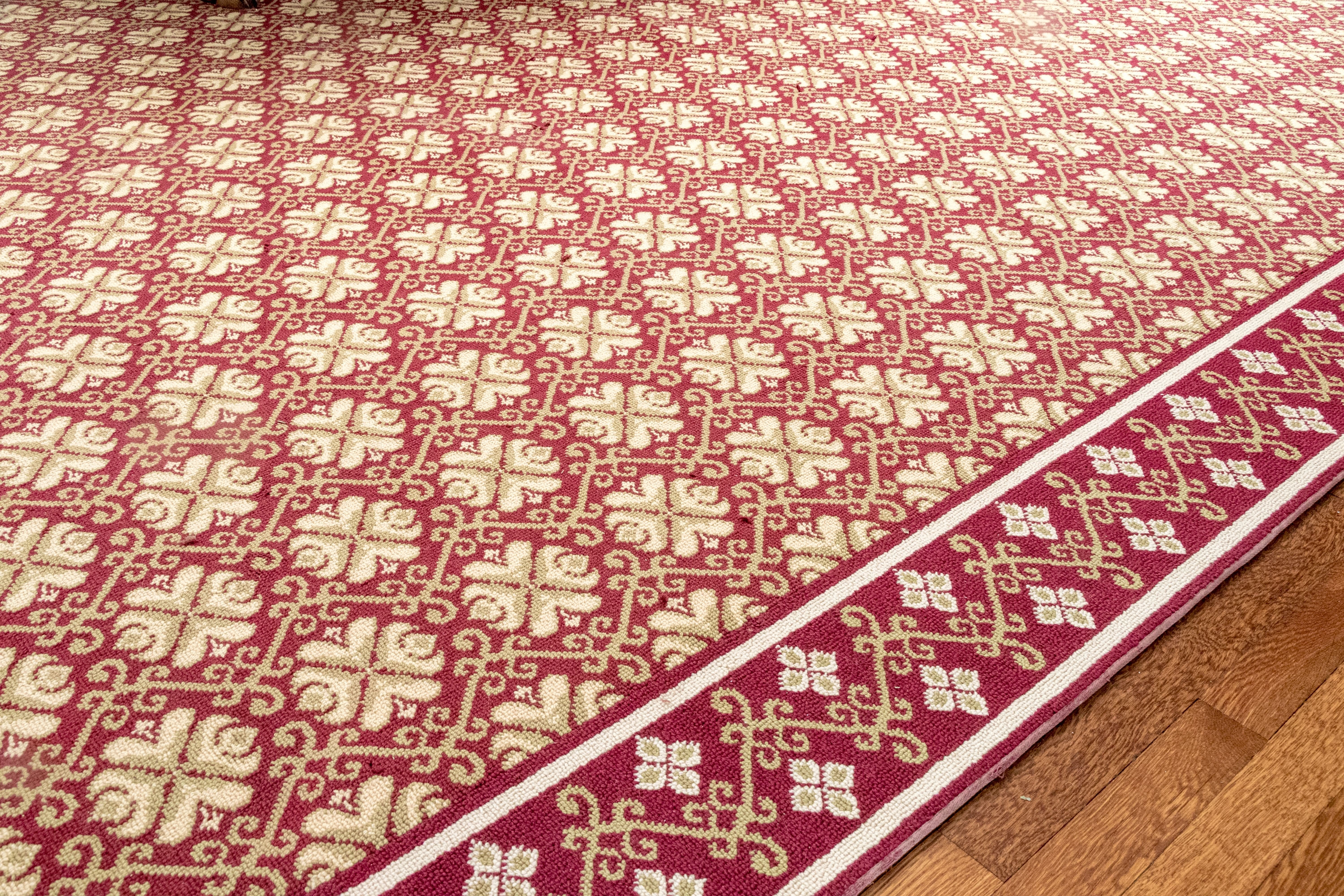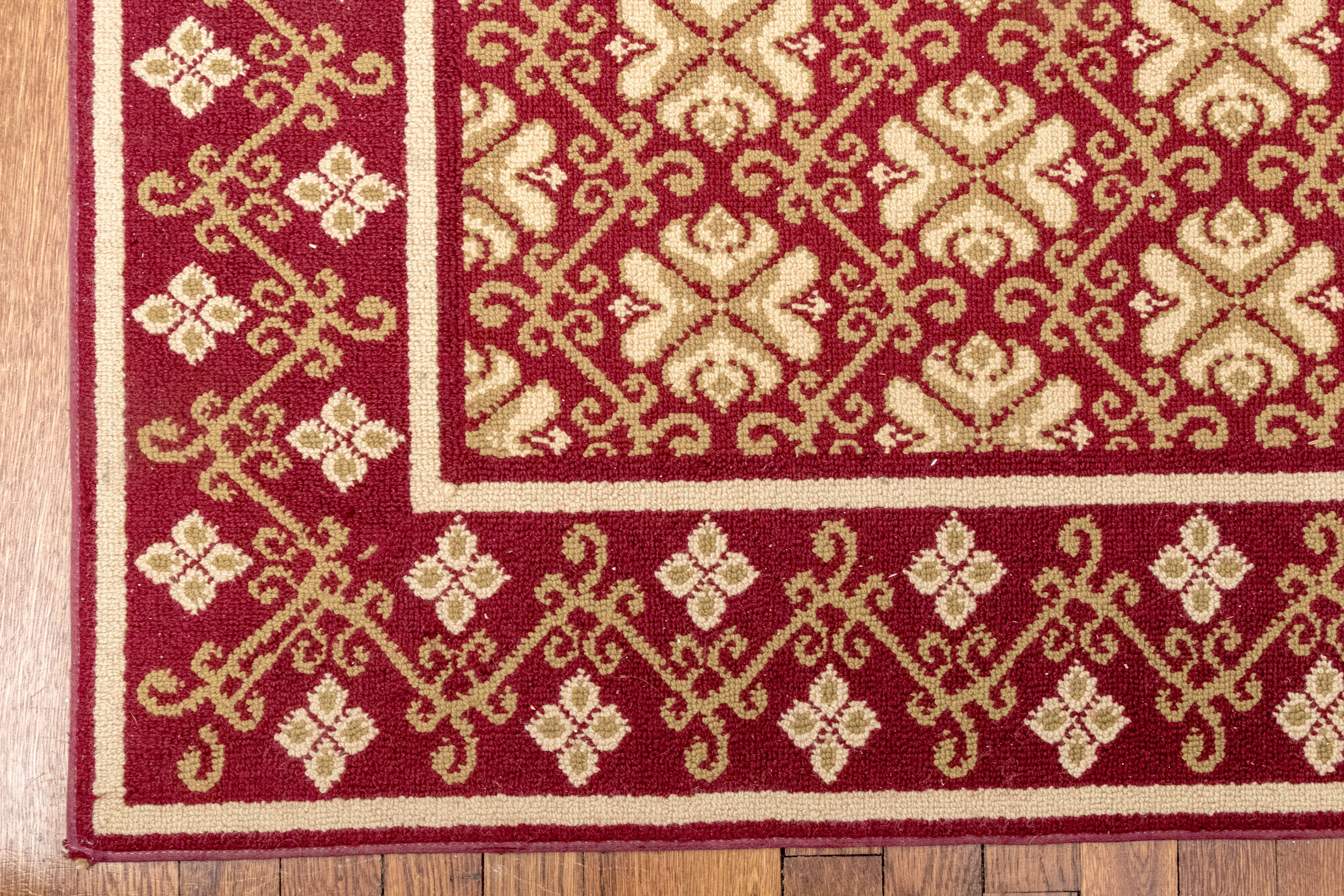 A high quality Stark room size carpet sporting a red main border with cream and beige vining florals flanked by narrow cream and red guard borders around a red field. The field is finely detailed with tessellated vines and quatrefoil floral medallions throughout.
