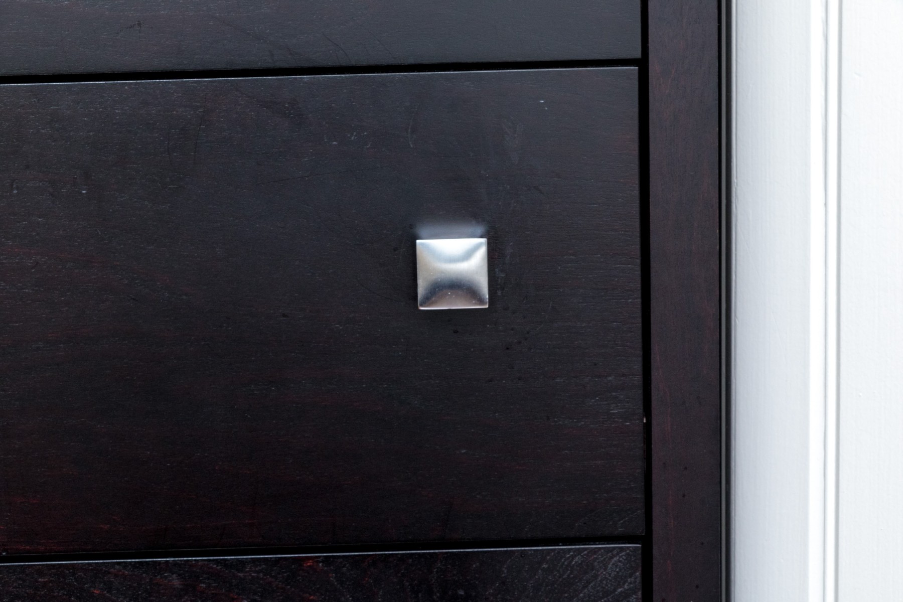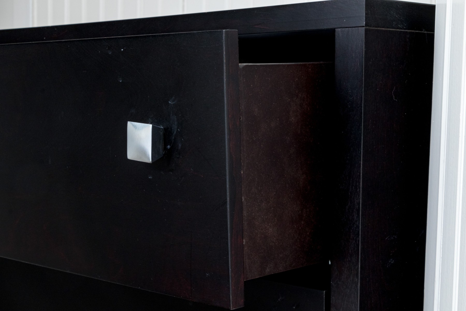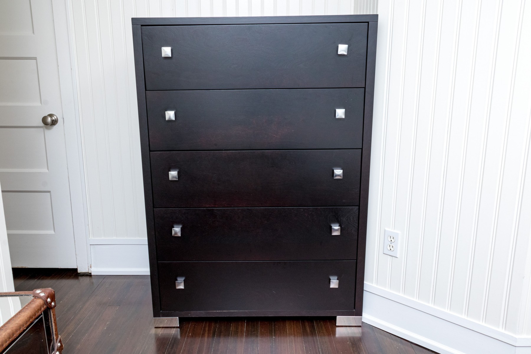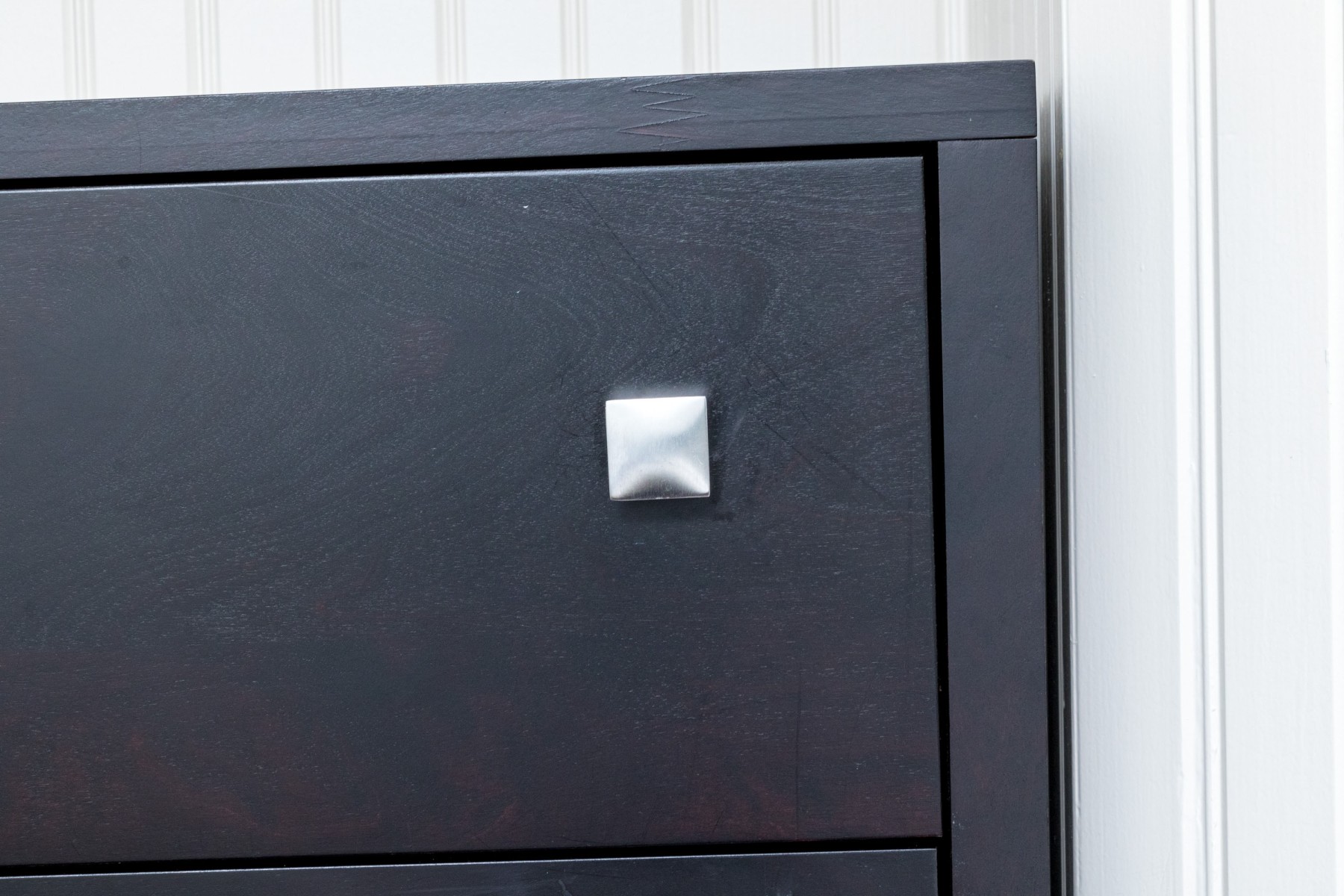 Finished in espresso hued wood laminate, each of the drawers has a pair of modern brushed metal pyramidal form drawer pulls.