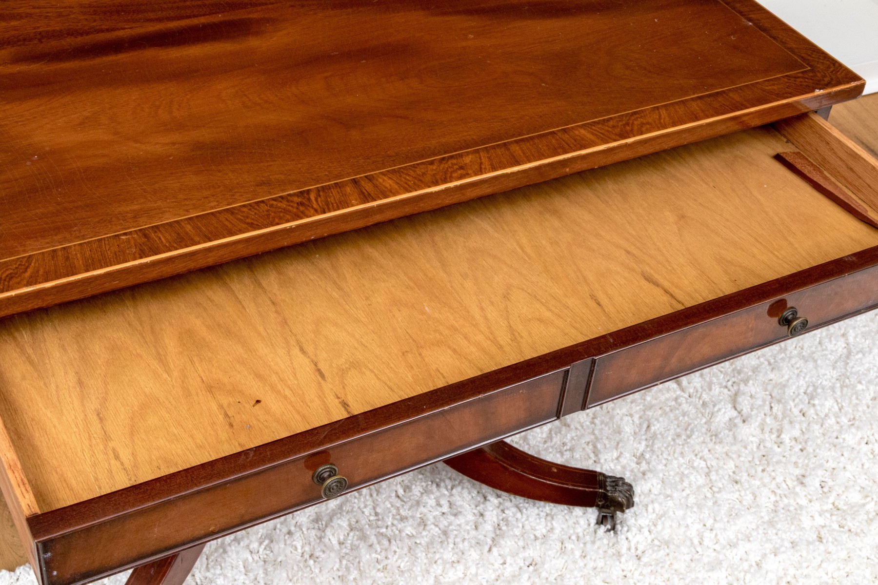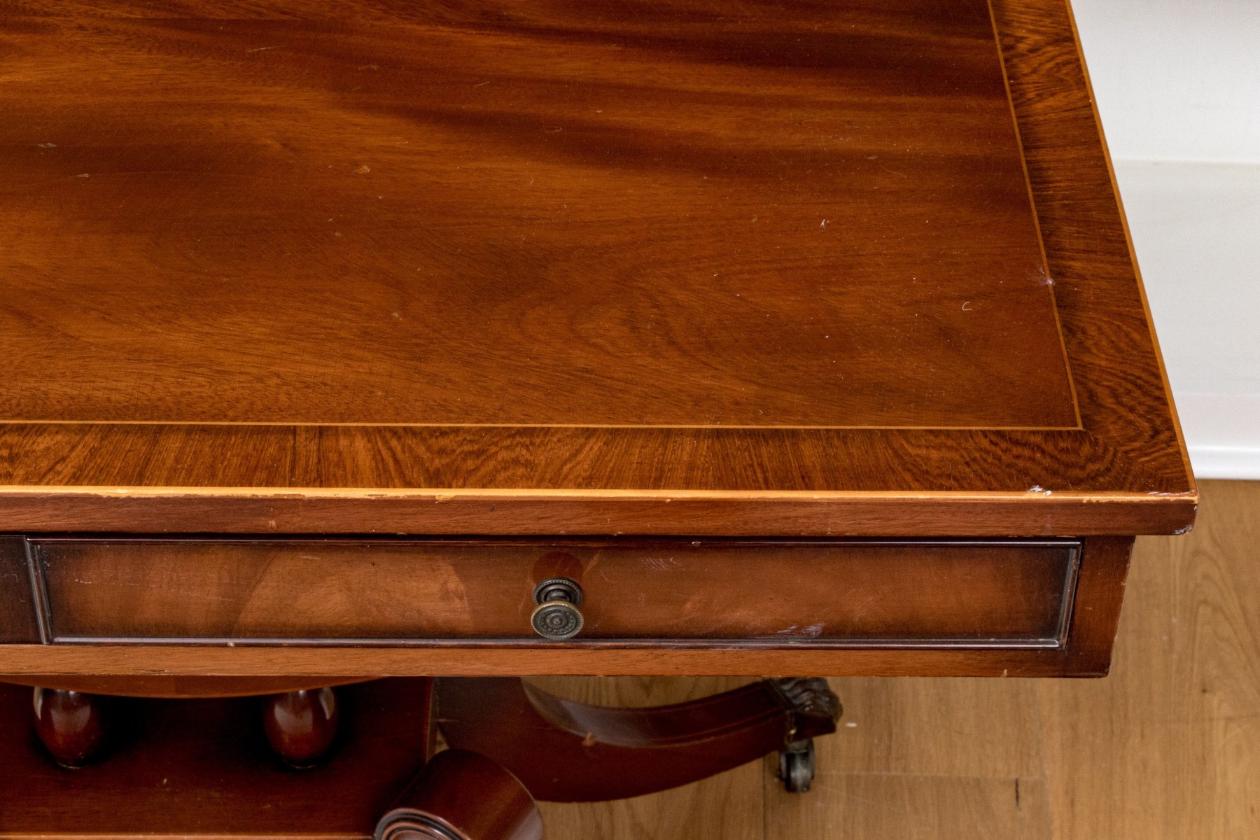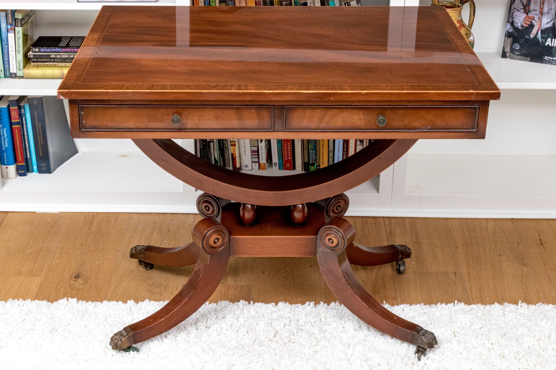 A gorgeous card table in classic Regency style, well crafted in richly hued red-brown wood. The table features a sleek rectangular top, two drawers with figured veneers, and paneled sides raised over an eye-catching U-form support on four ovoid knops over a rectangular stretcher supporting four saber legs with rosette knees and brass hairy paw feet on casters for easy mobility.
