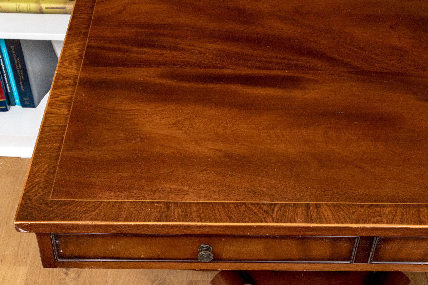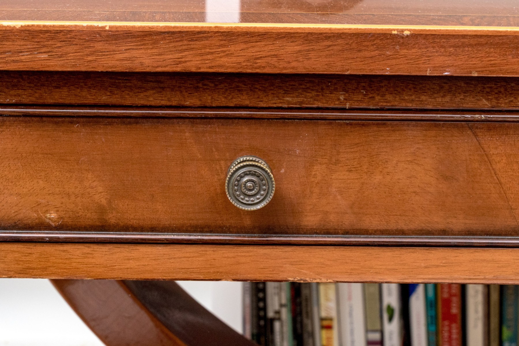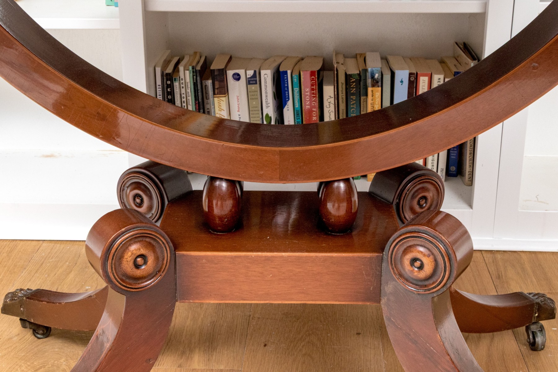 A gorgeous card table in classic Regency style, well crafted in richly hued red-brown wood. The table features a sleek rectangular top, two drawers with figured veneers, and paneled sides raised over an eye-catching U-form support on four ovoid knops over a rectangular stretcher supporting four saber legs with rosette knees and brass hairy paw feet on casters for easy mobility.