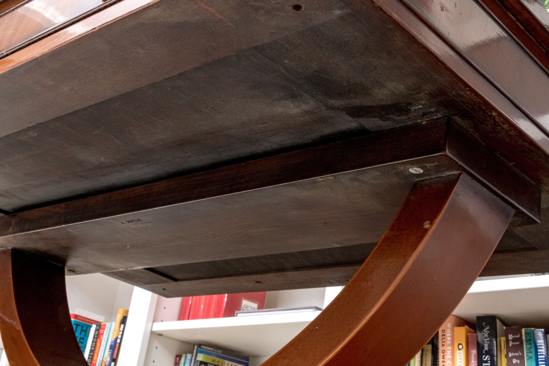 Previous repair to one leg. Some lifting and craquelure to the veneer on top. Despite wear a very handsome piece.