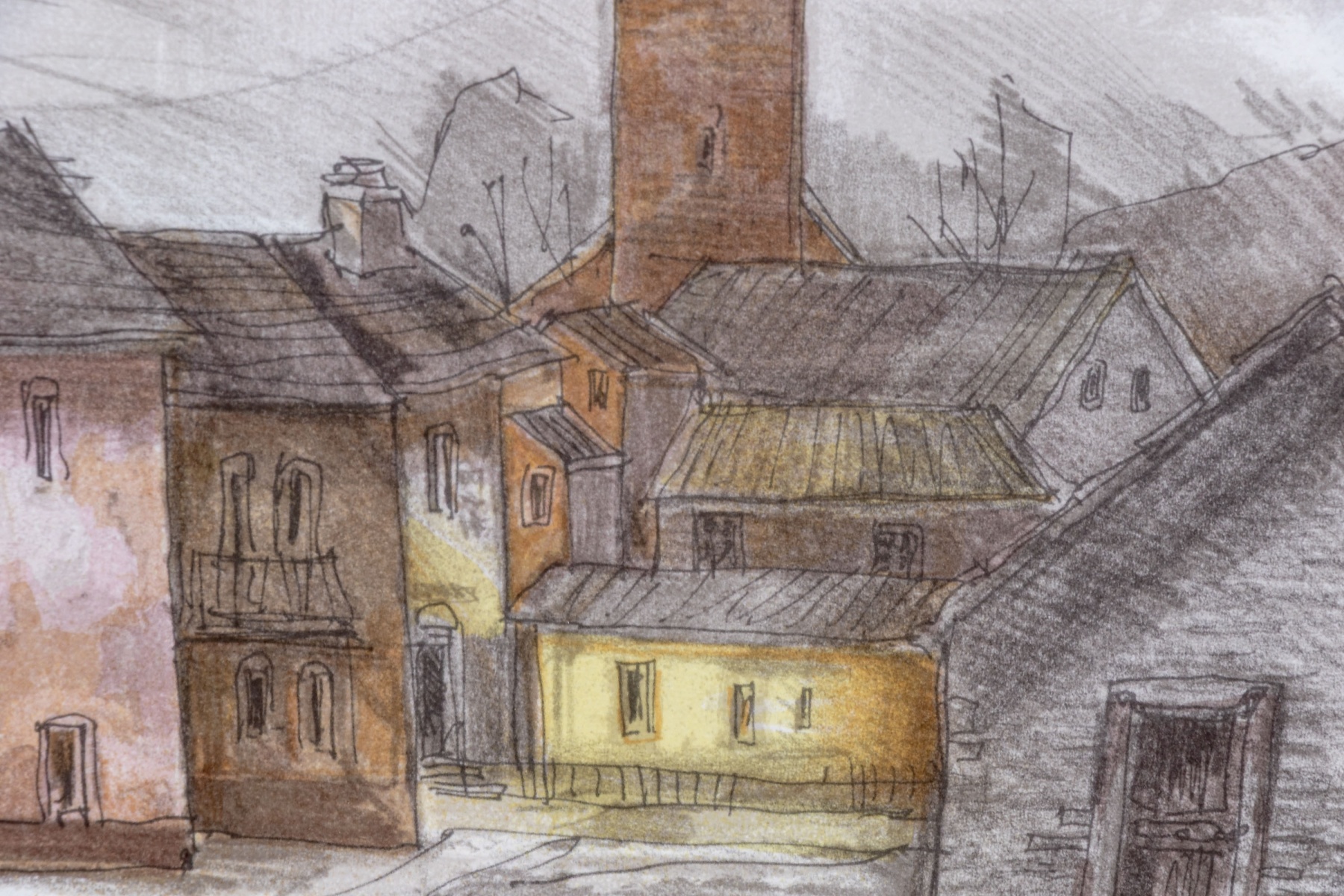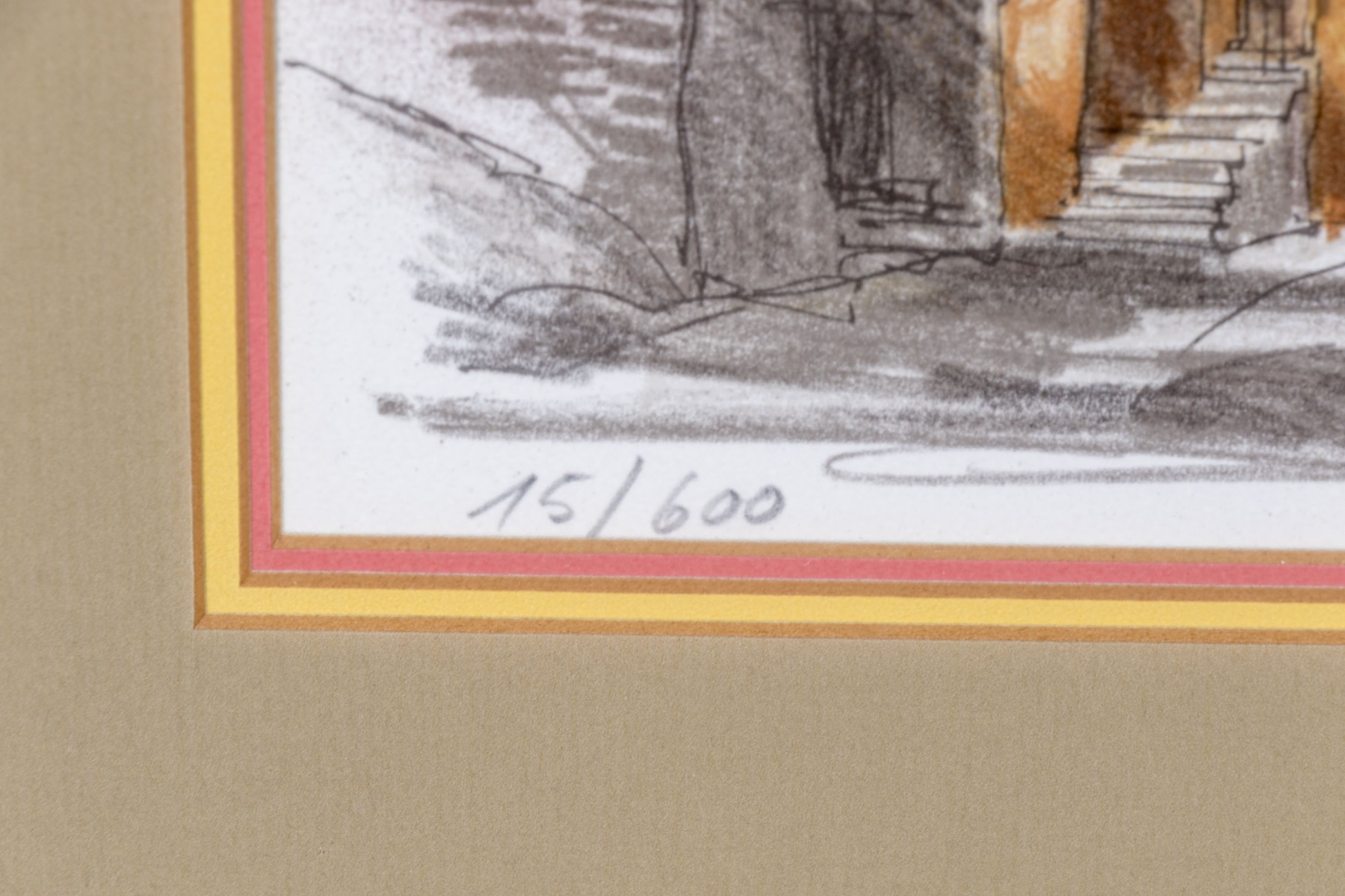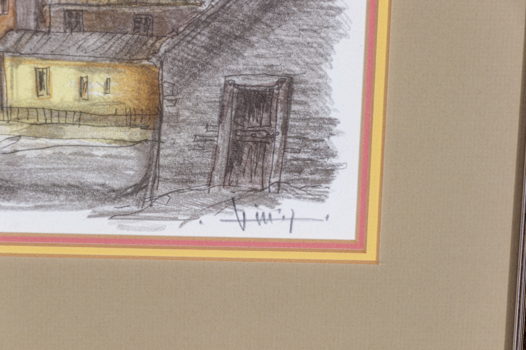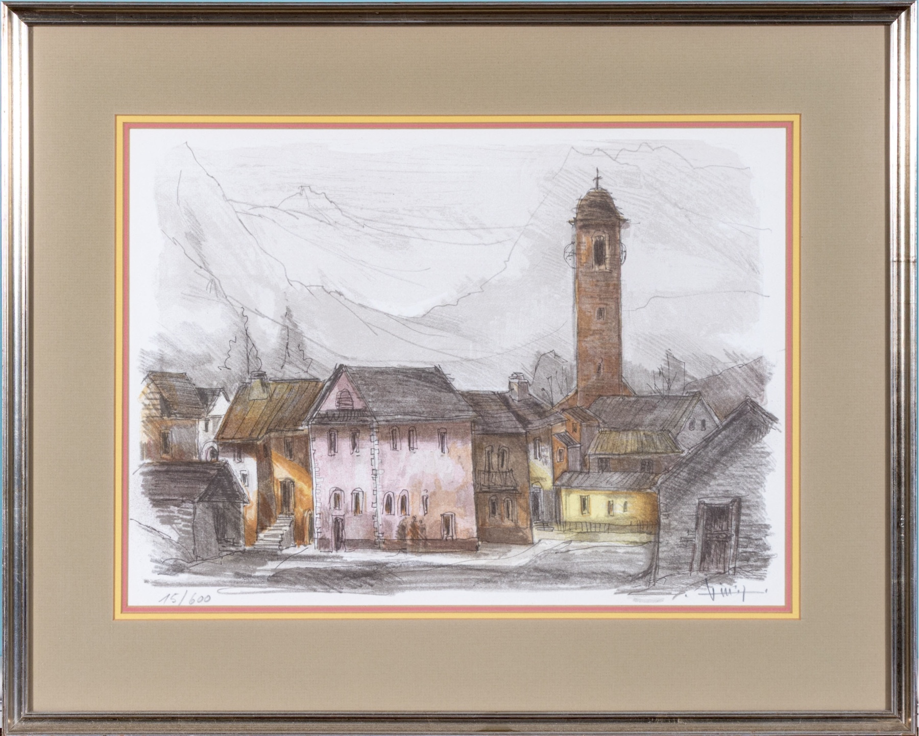 René Villiger (Swiss, 1931-2010) "Typical Village in the Ticino, South of the Alps in Switzerland" lithograph depicting a charming, gesturally rendered townscape with a limited color palette in orange, pink, and brown across the central view of buildings leading out to a gray monochrome background of trees and mountains. Pencil signed lower right, numbered 75/600 lower left, and affixed with a label on the verso denoting the print as being produced for Deutsch Relays, Inc.