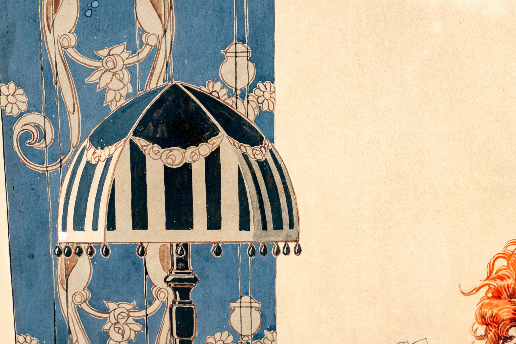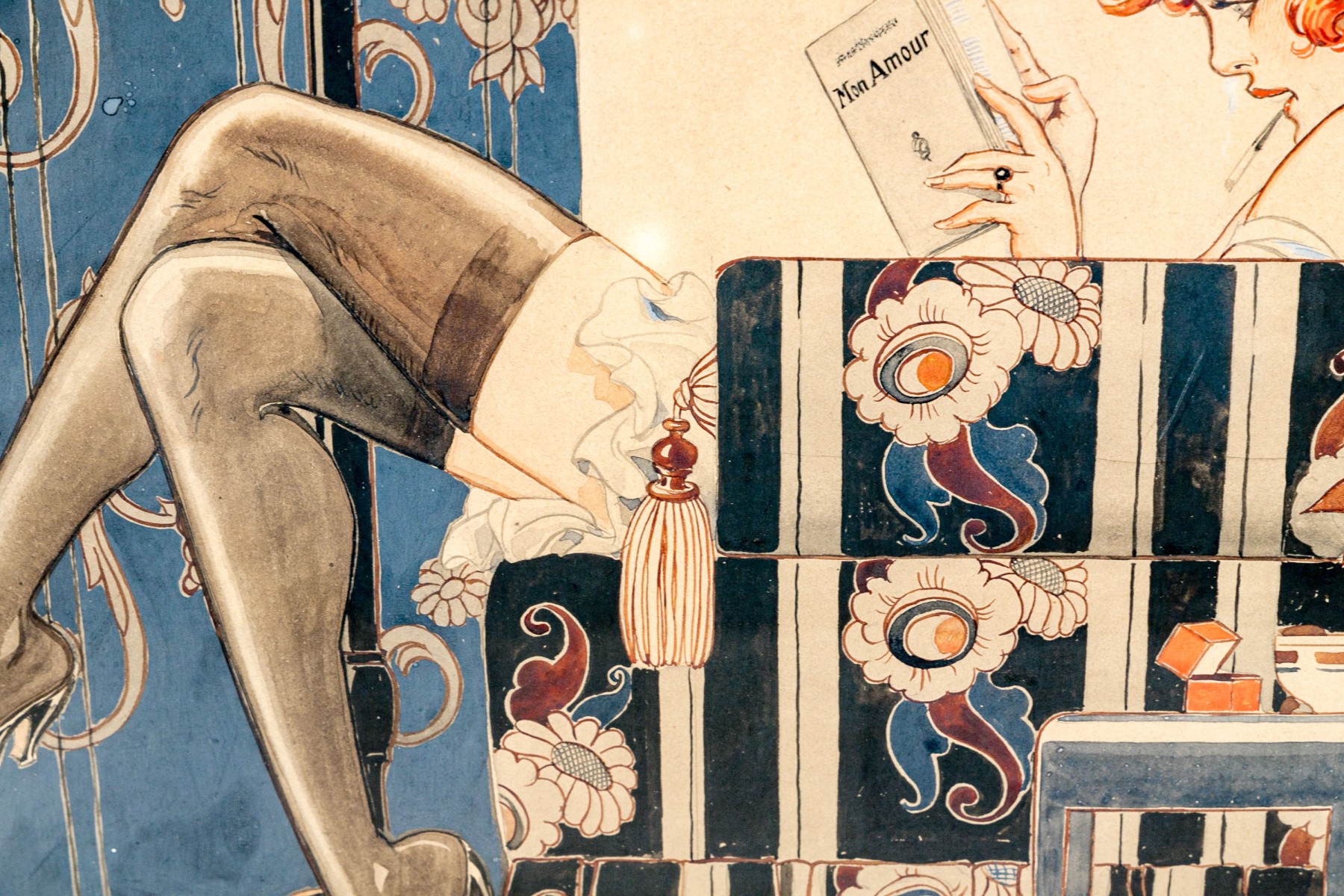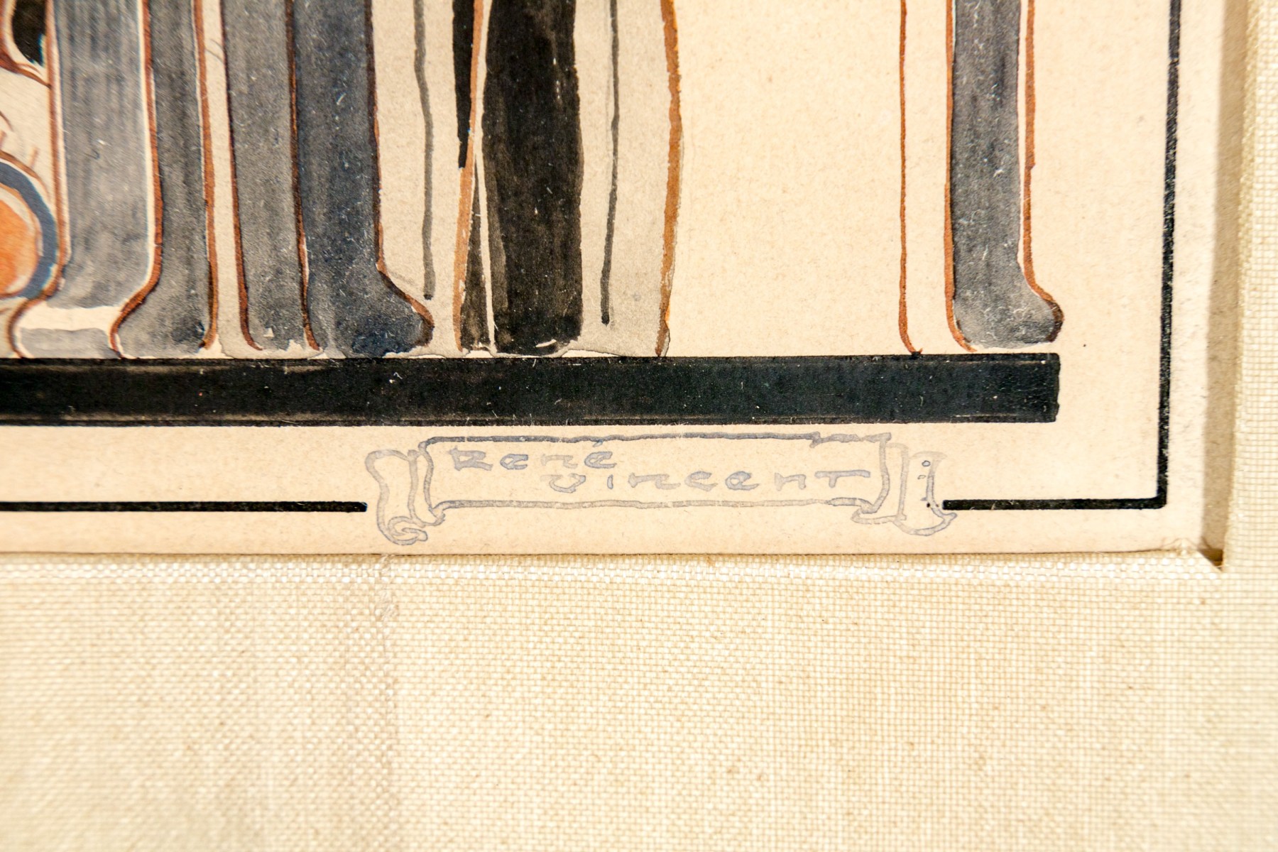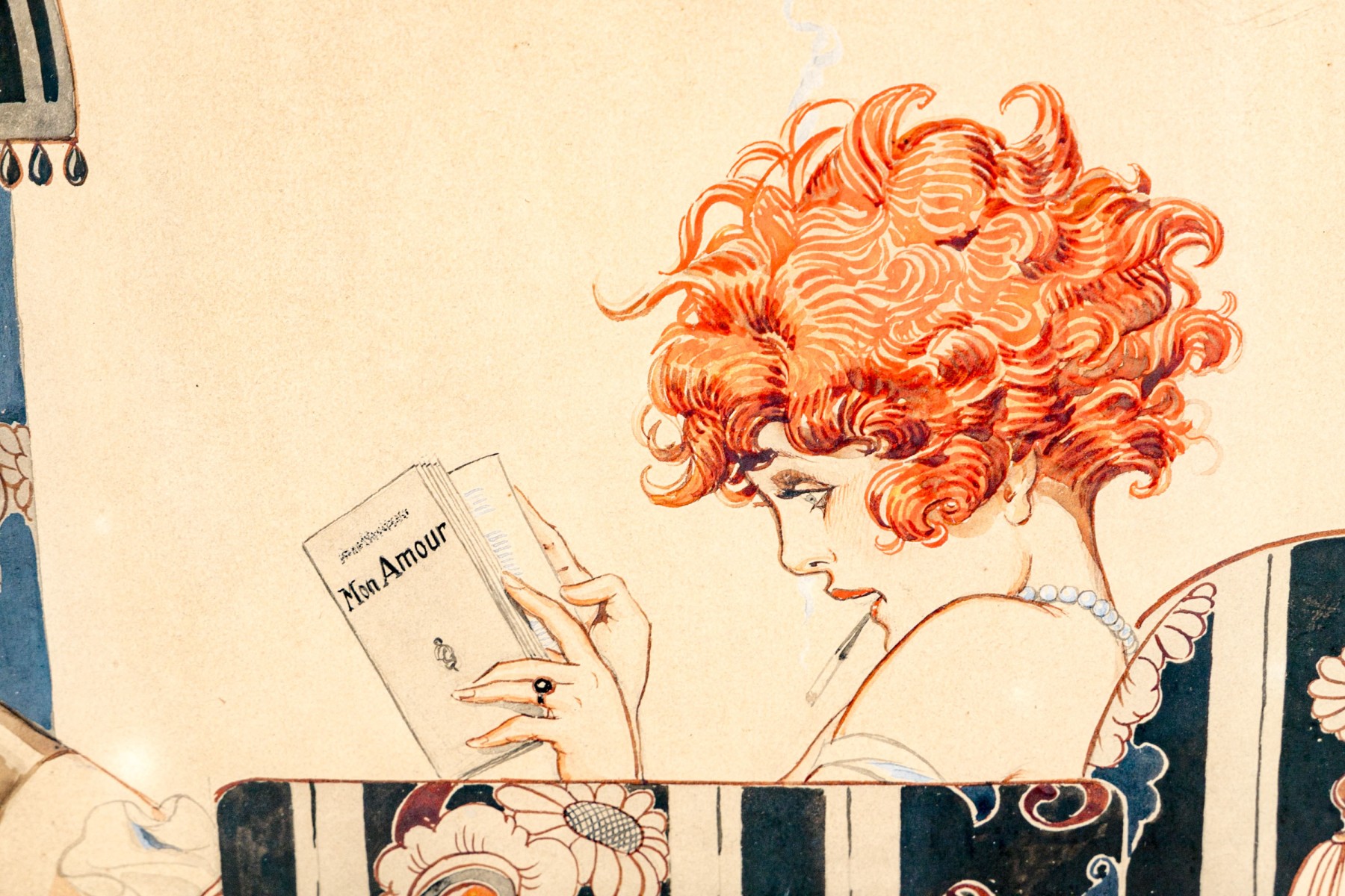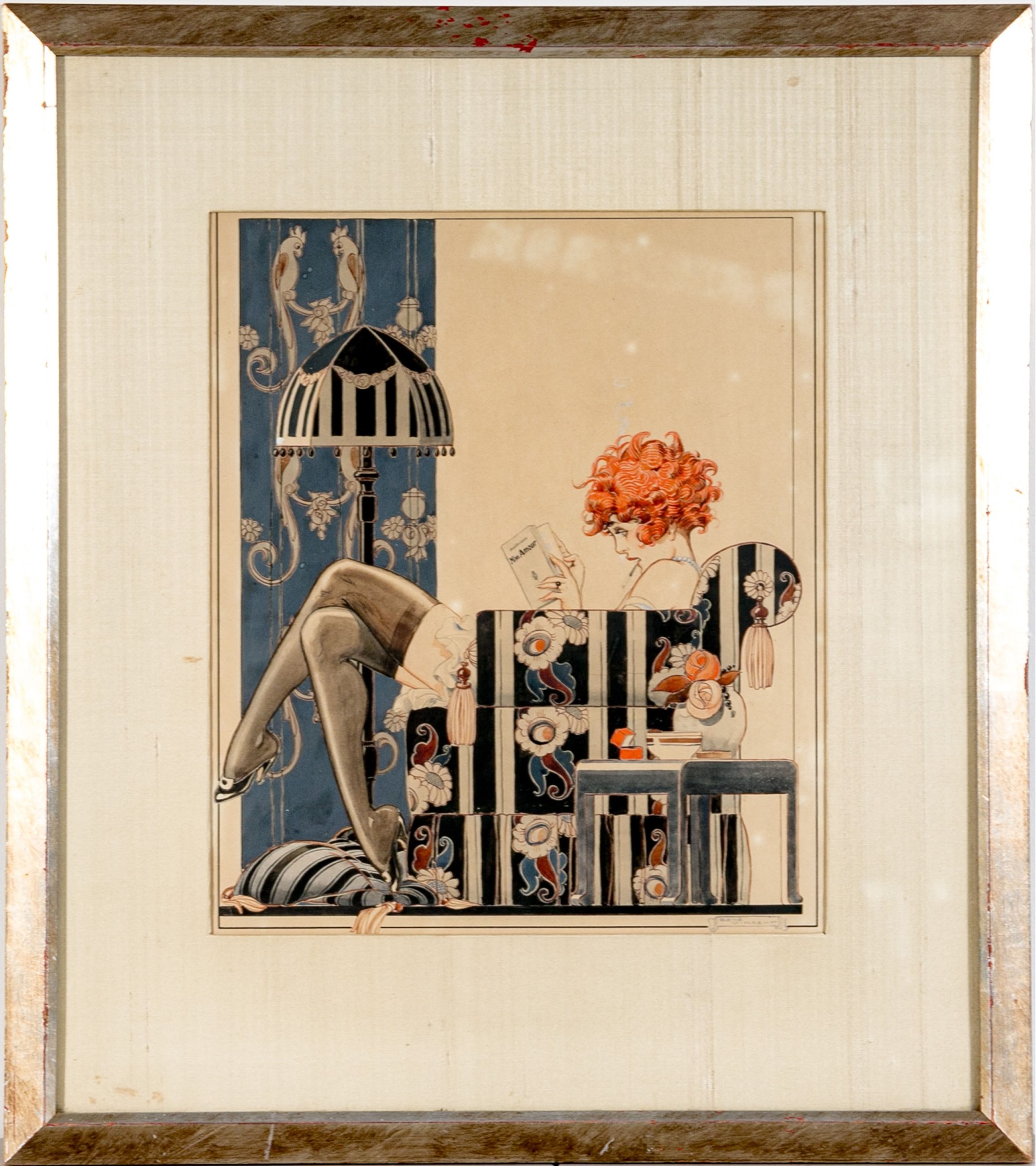 This beautiful Art Deco piece is sure to stun in any room with its elaborate decorations and elegant French woman smoking and reading. Signed "René Vincent" lower right.