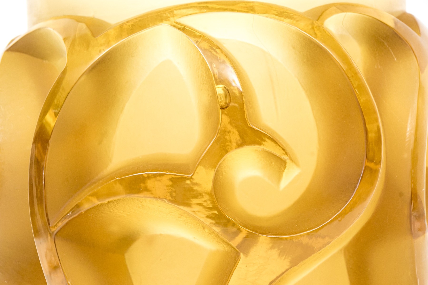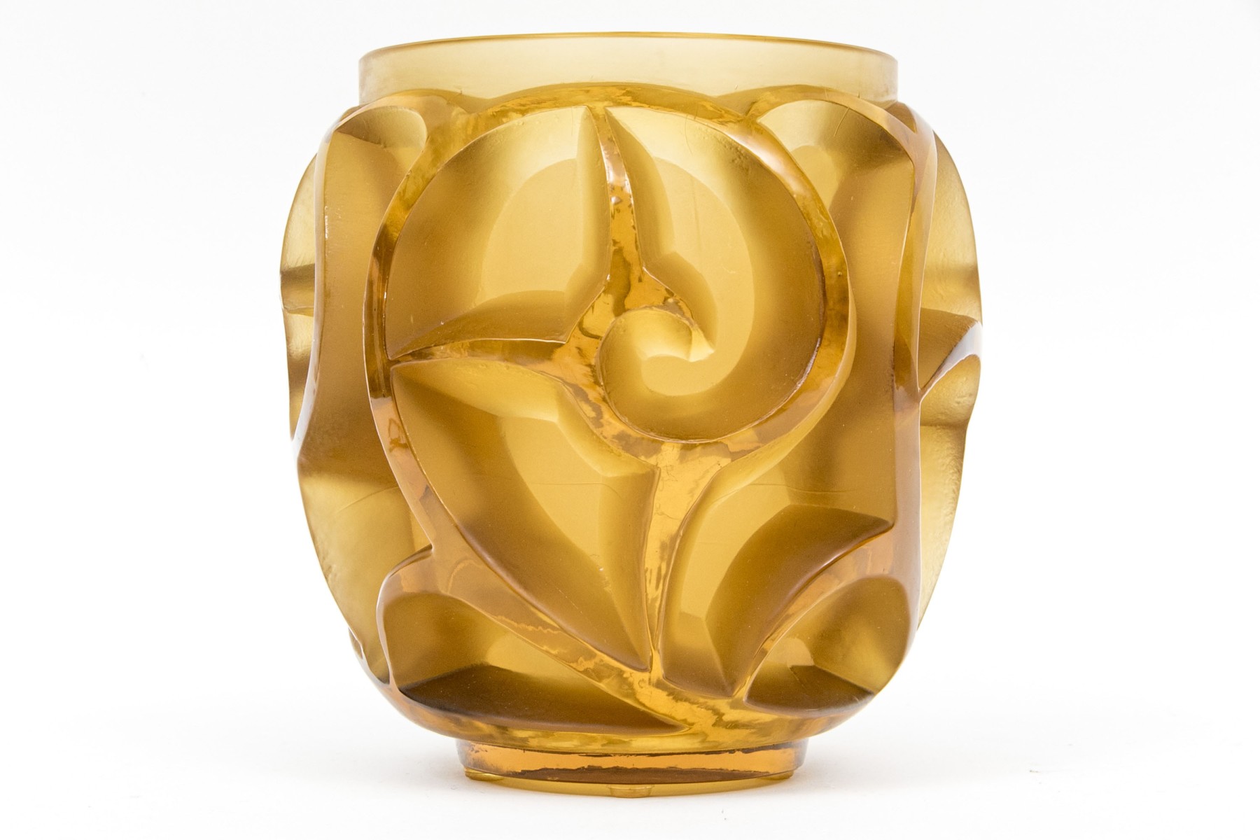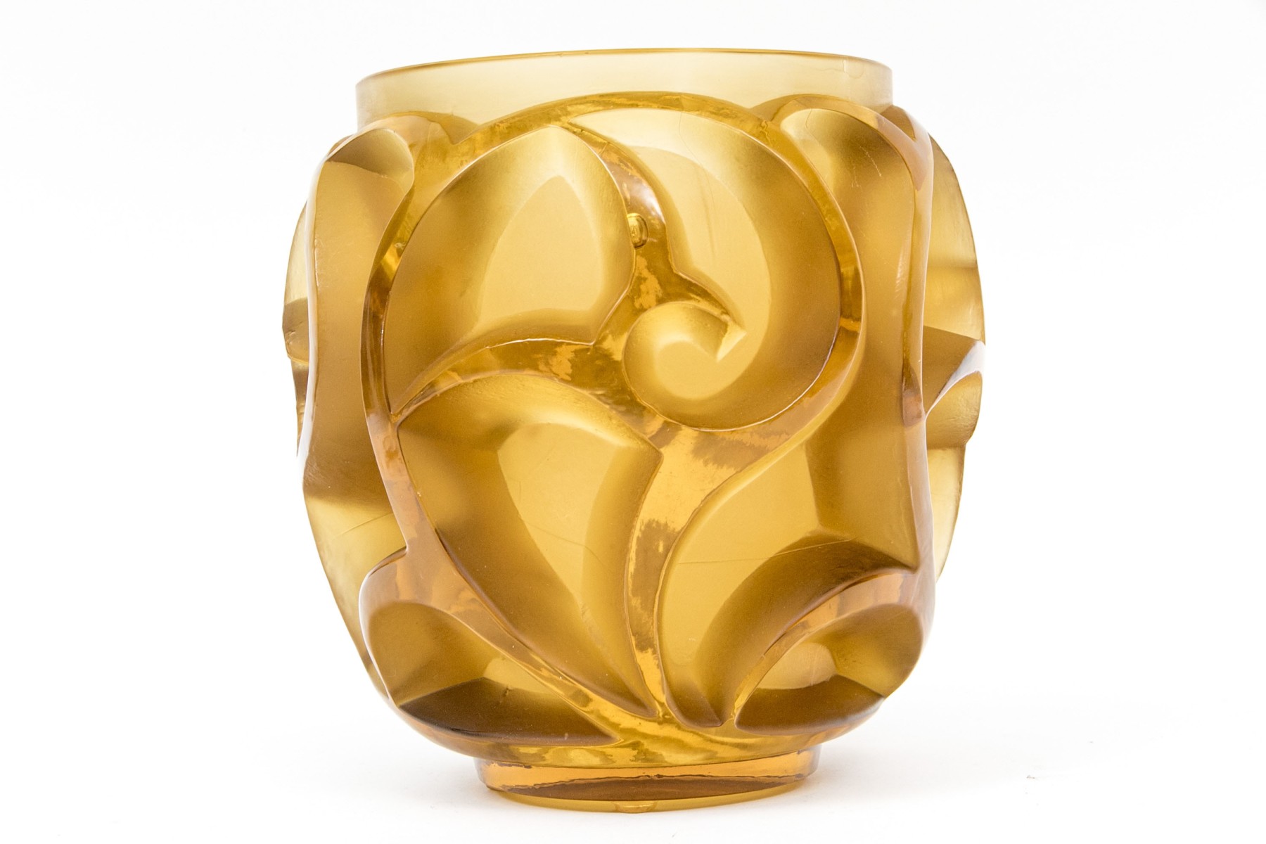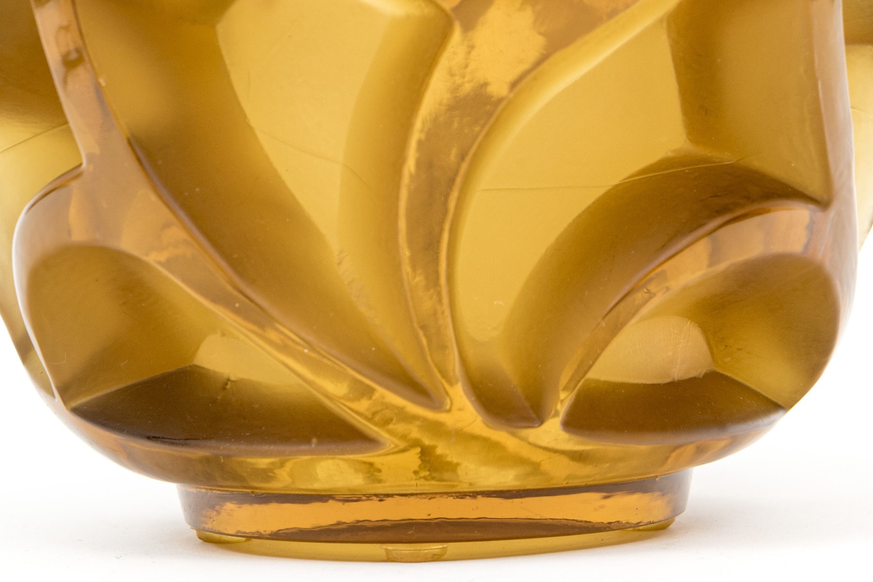 Marked R. Lalique France on the base. A heavy bulbous amber tone glass vase with a deeply cut swirled shell motif. On a ring base.