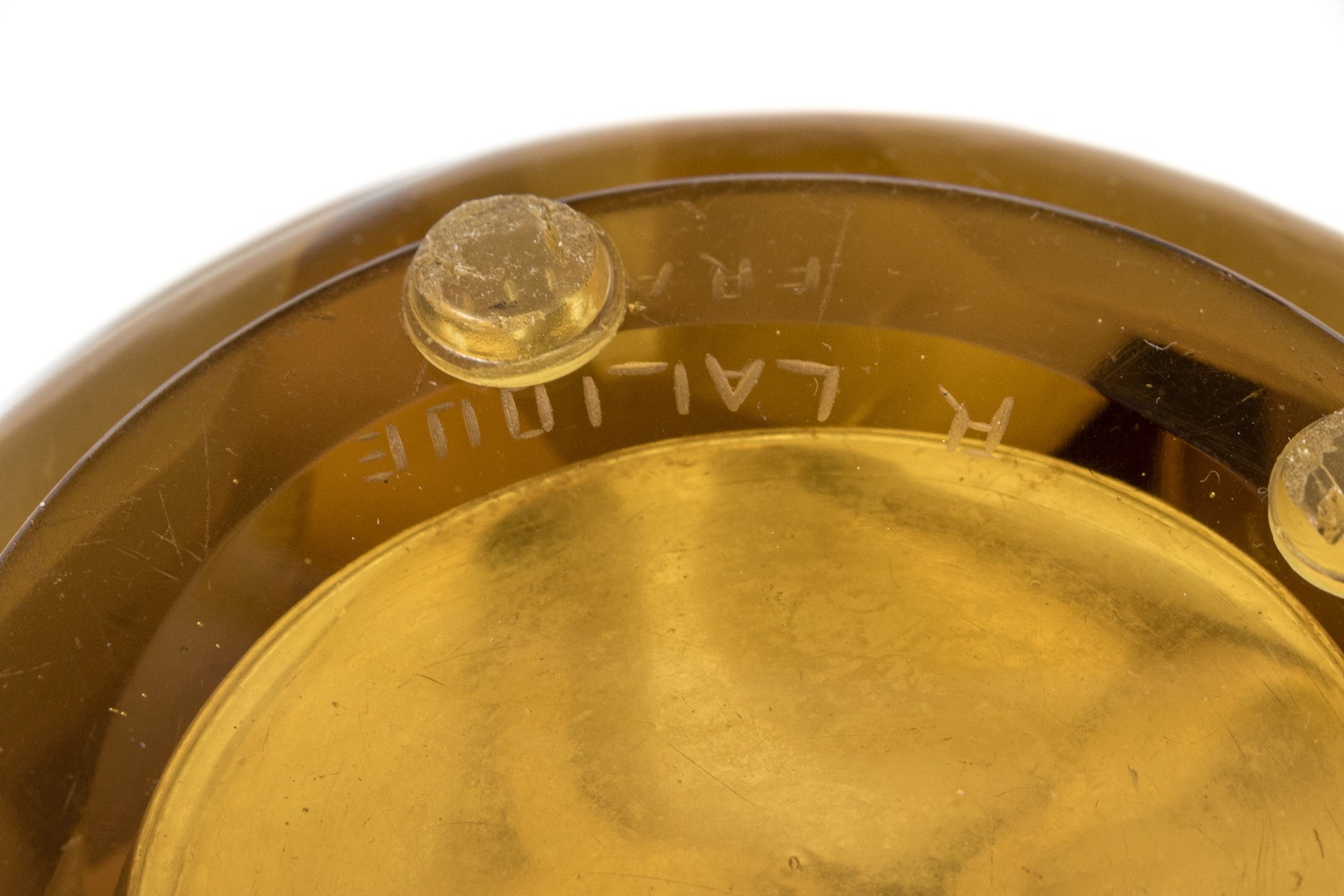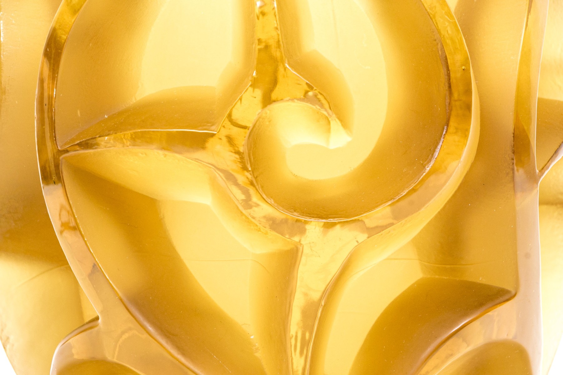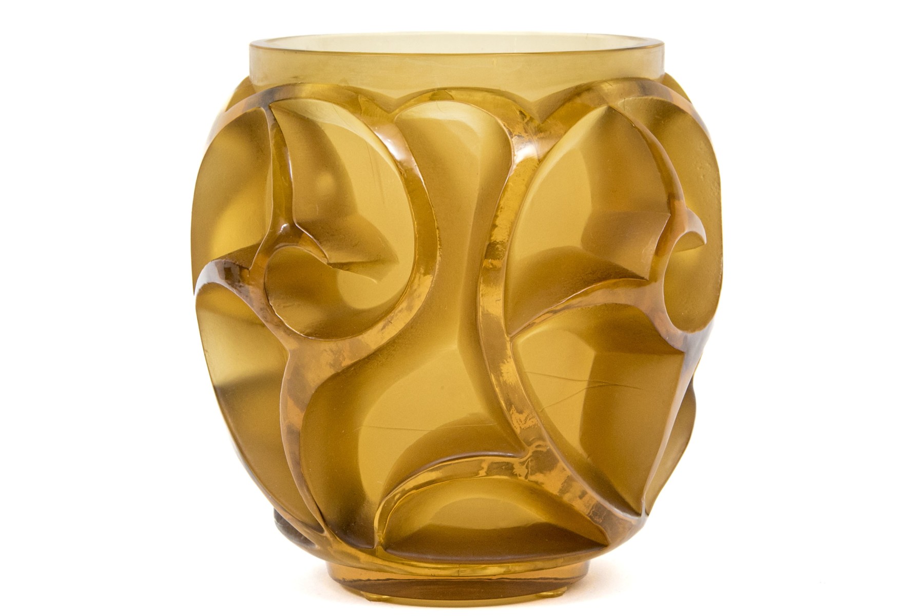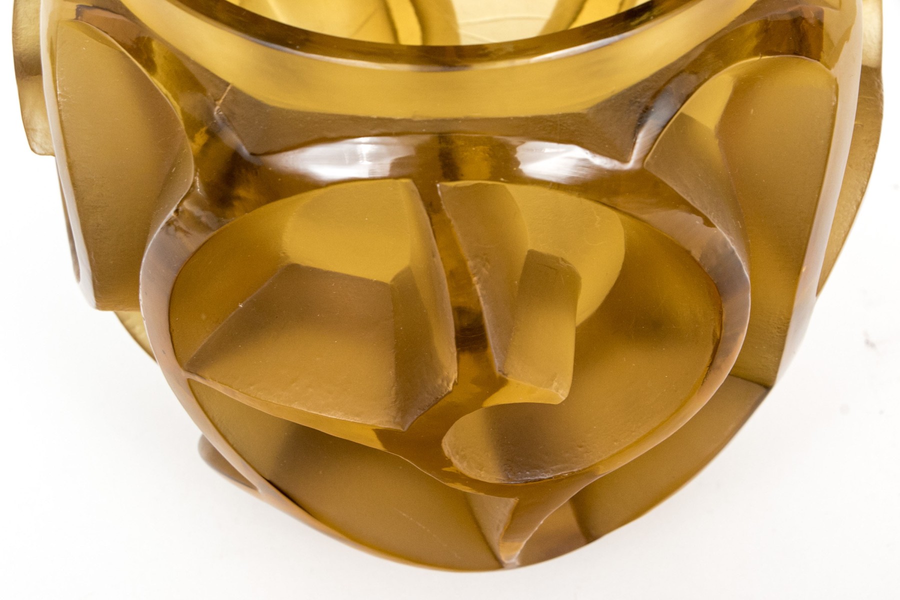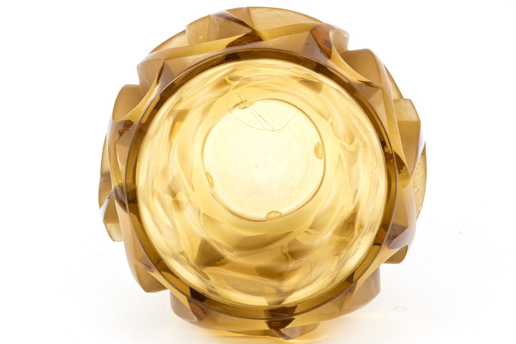Marked R. Lalique France on the base. A heavy bulbous amber tone glass vase with a deeply cut swirled shell motif. On a ring base.