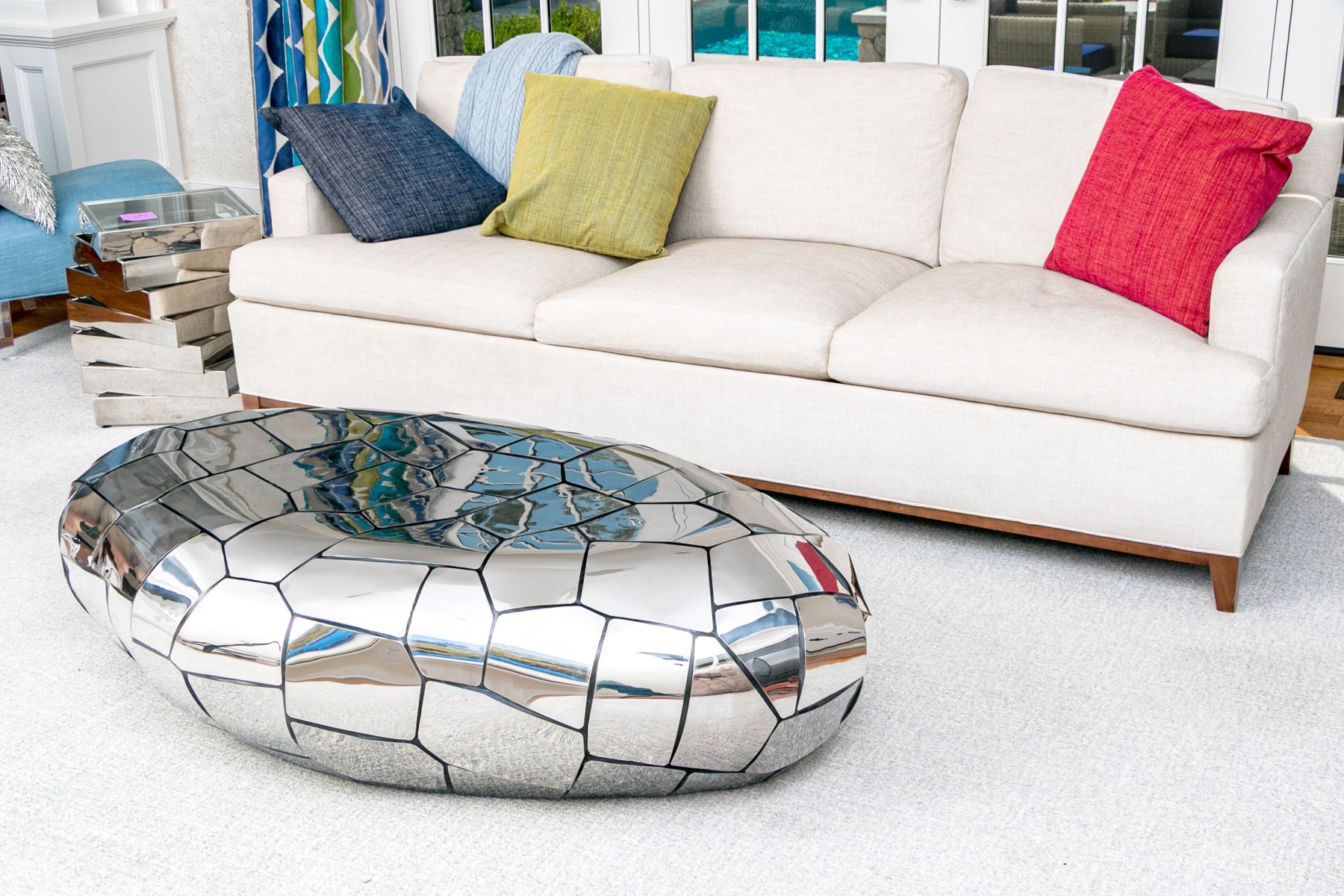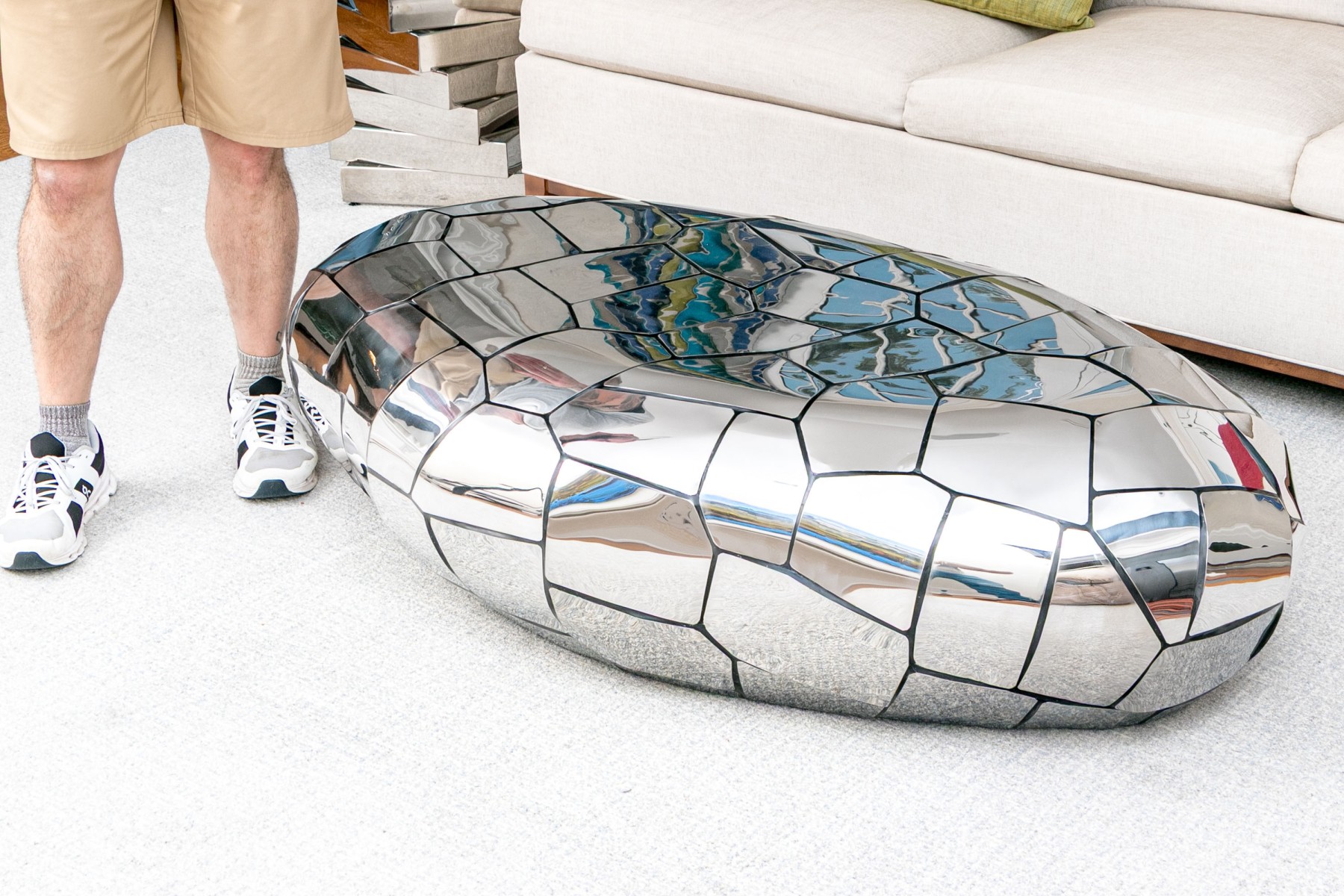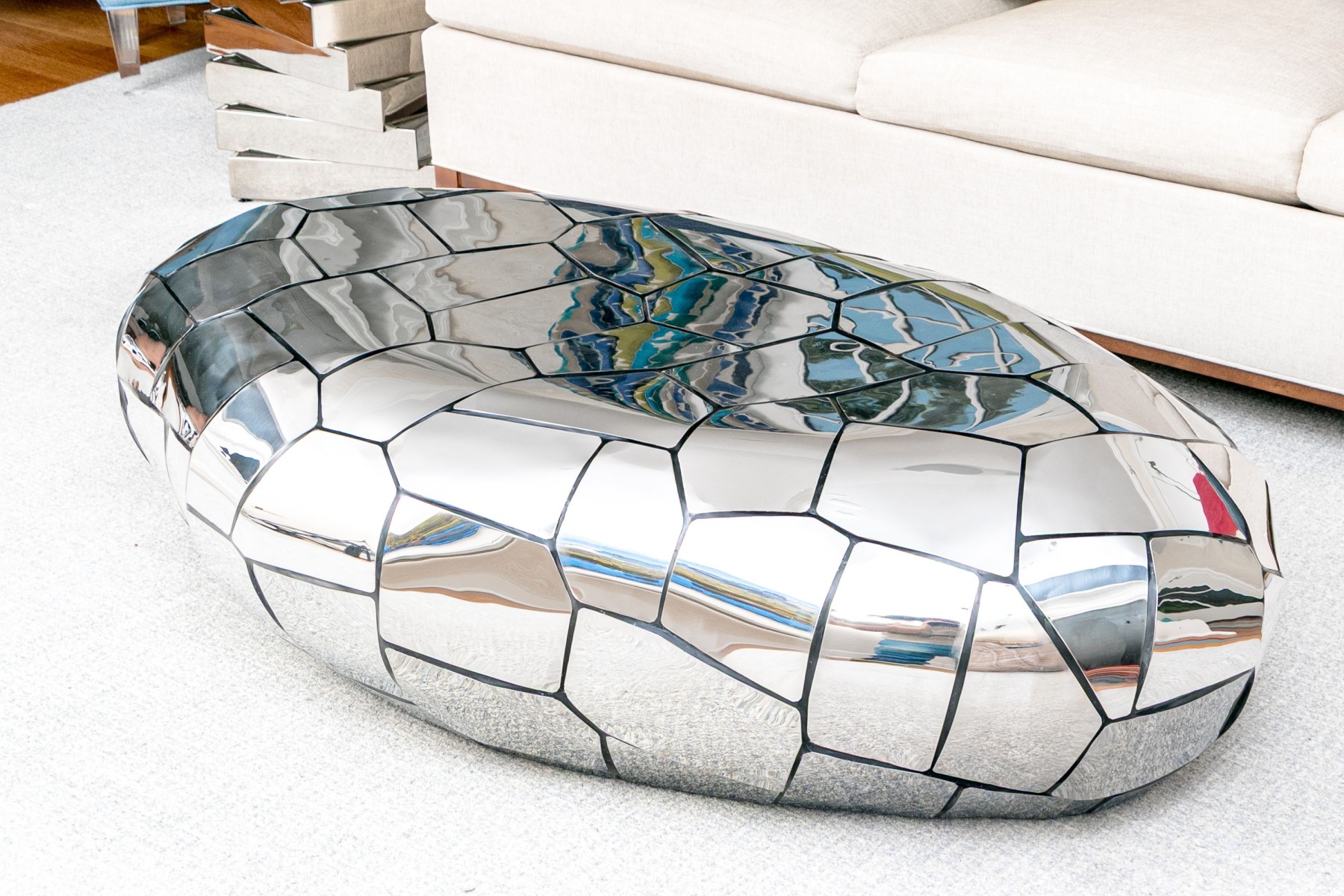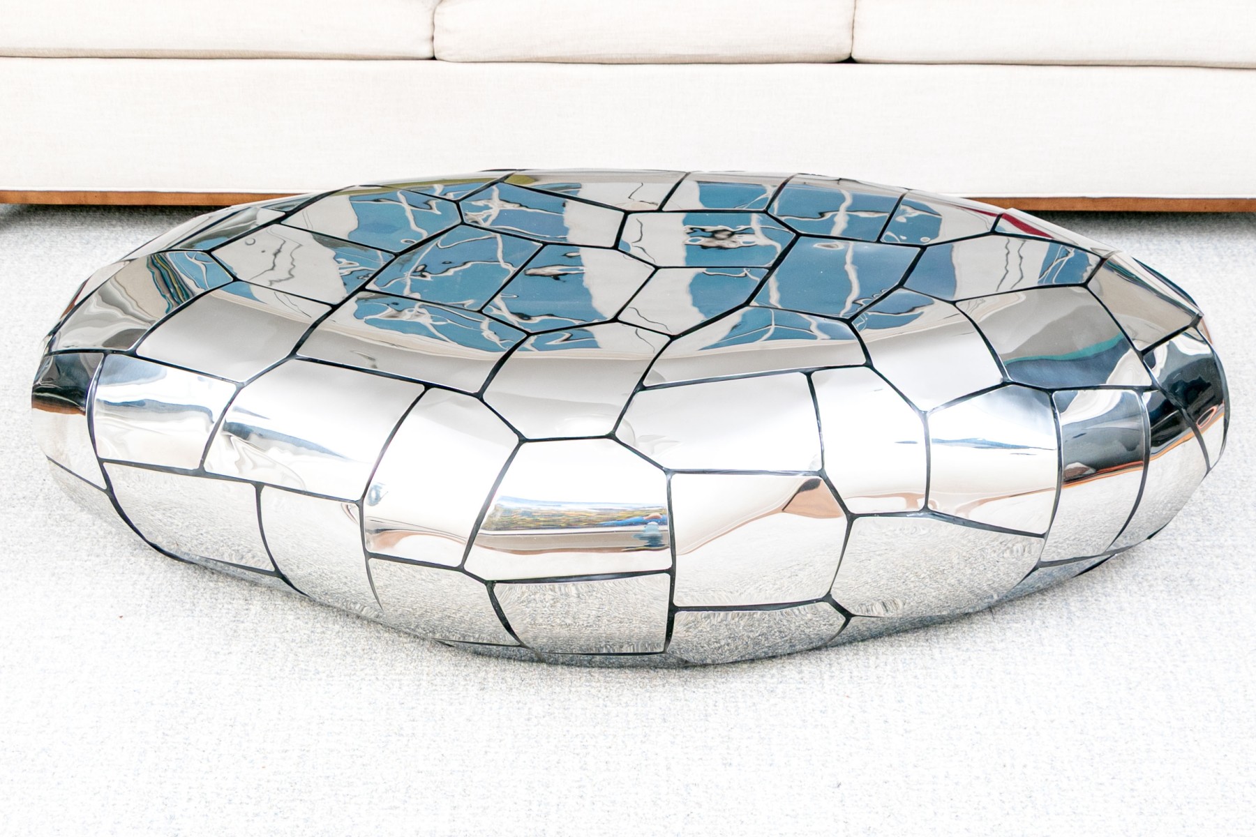 The classic river stone or pebble coffee table design gets a glamorous and contemporary refresh with this eye-catching statement piece. The resin coffee table sports a mosaic of steel panels polished to a mirror finish wrapping around the organic, oblong form, creating a design reminiscent of snake skin or turtle scutes.