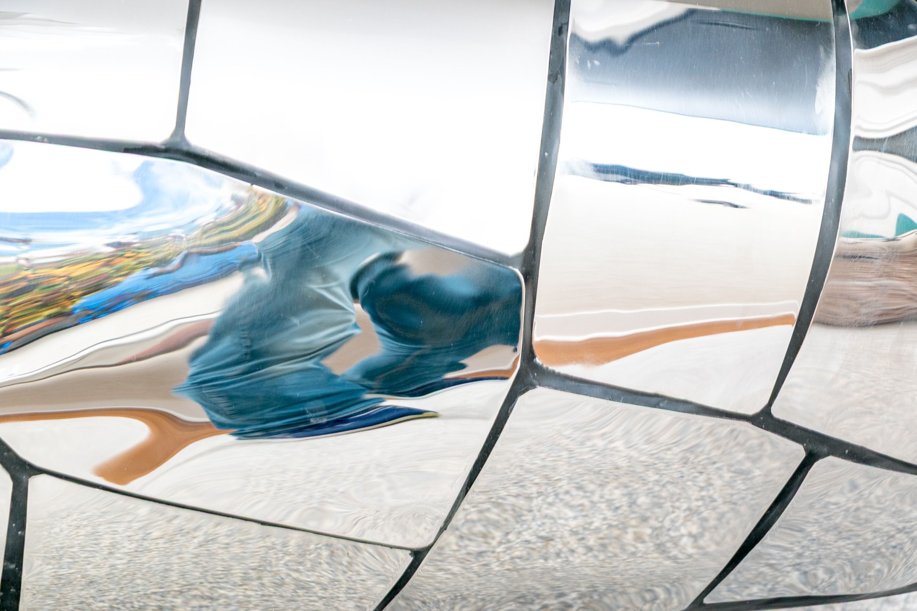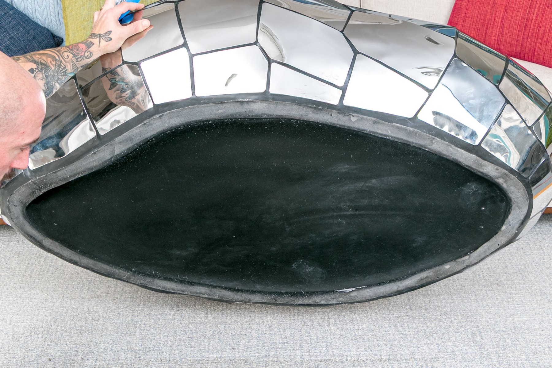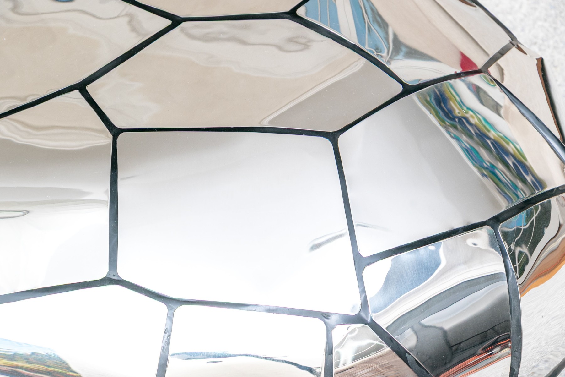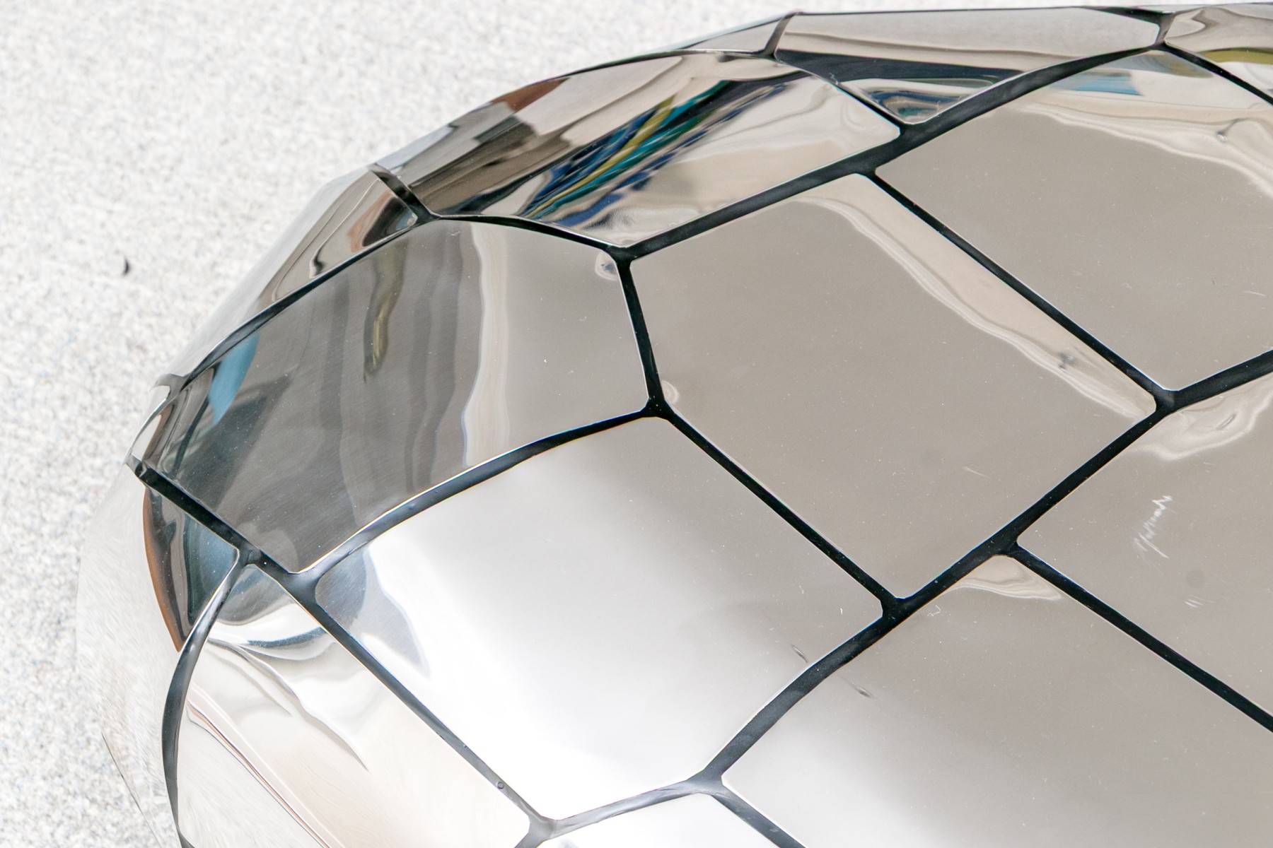The classic river stone or pebble coffee table design gets a glamorous and contemporary refresh with this eye-catching statement piece. The resin coffee table sports a mosaic of steel panels polished to a mirror finish wrapping around the organic, oblong form, creating a design reminiscent of snake skin or turtle scutes.