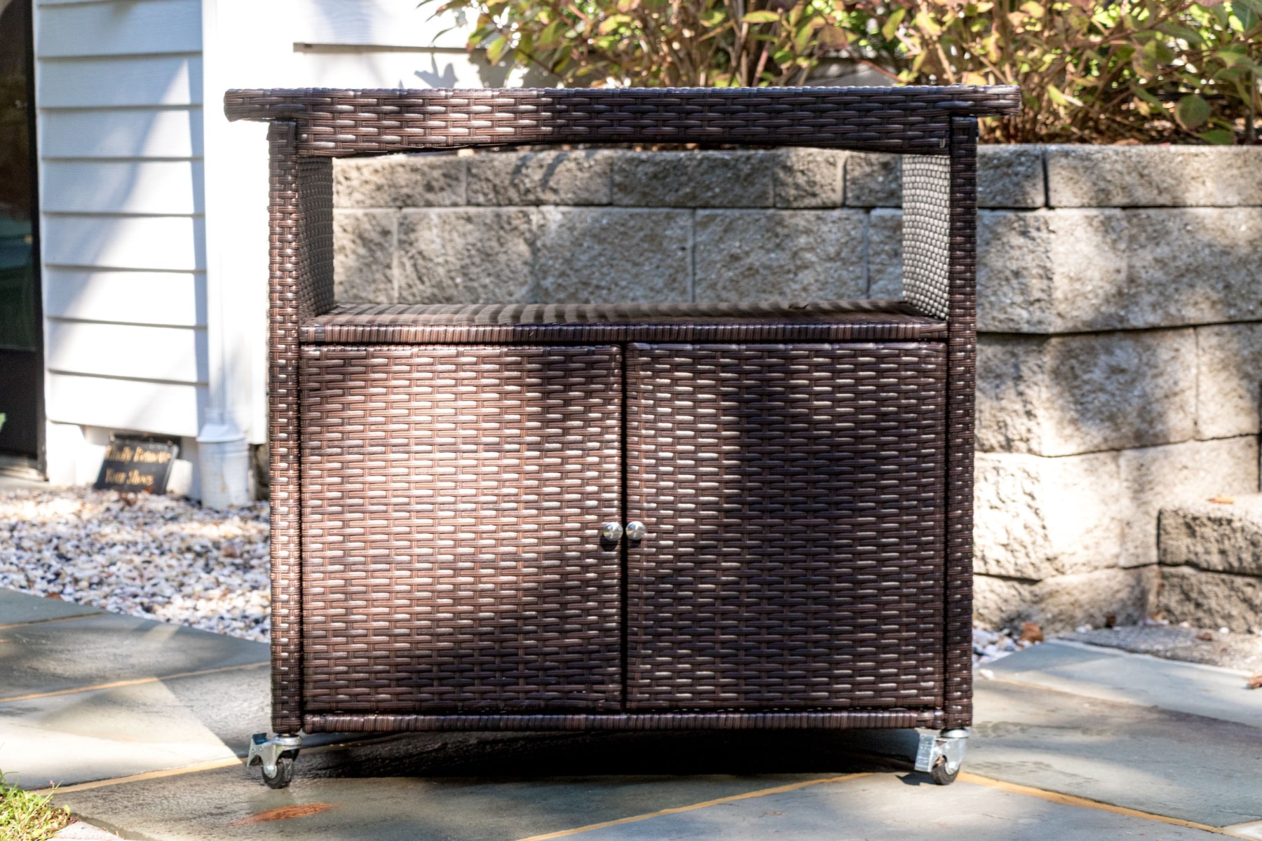 A delightful outdoor bar cart in brown resin wicker, designed with a rectangular planked faux wood top flanked by bowed handles on the sides. Below, the cart sports an open shelf and a double door cabinet raised over casters for easy mobility.