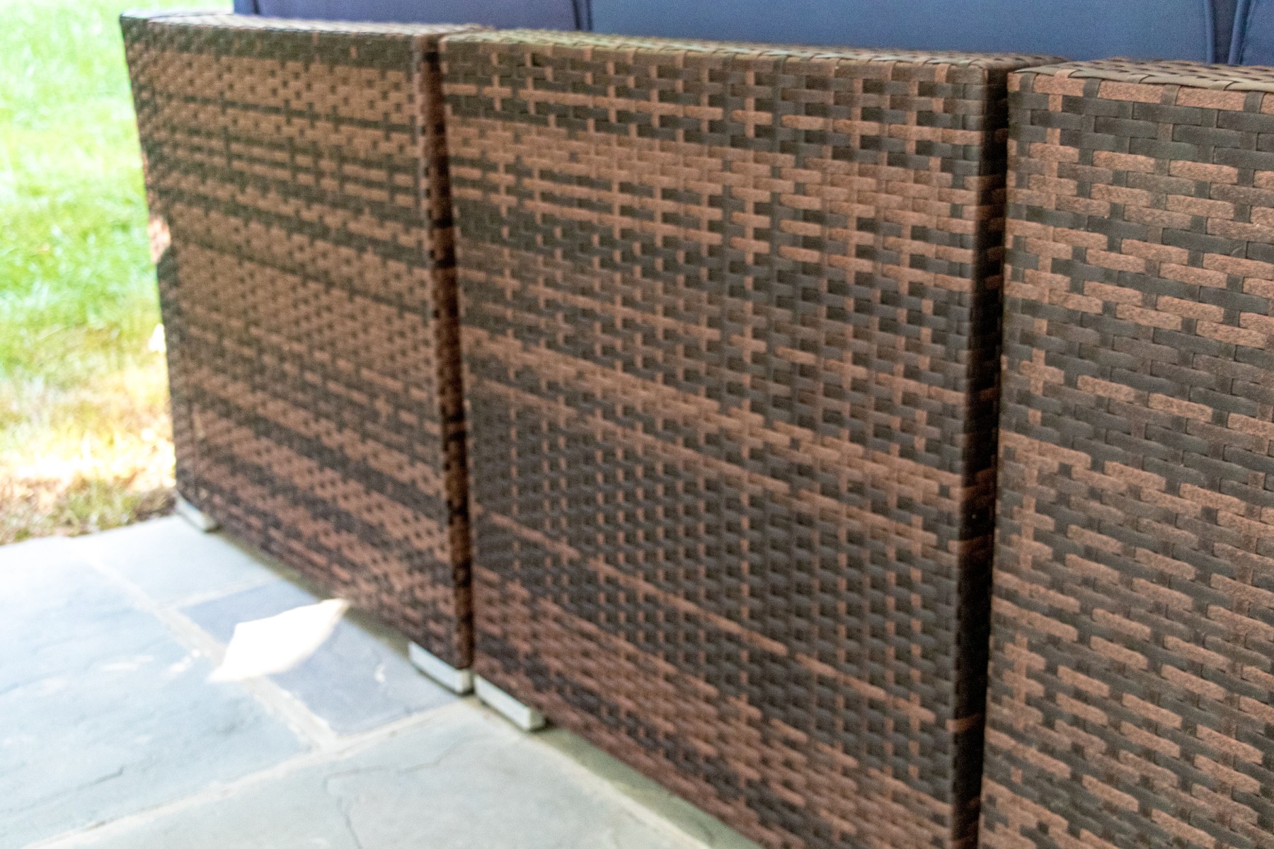 An excellent modular or sectional outdoor sofa in brown resin wicker with blue back and seat cushions. The sofa is composed of a right arm section and four armless sections, providing versatile display options. Accompanied by a matching glass topped cocktail table, completing the suite.