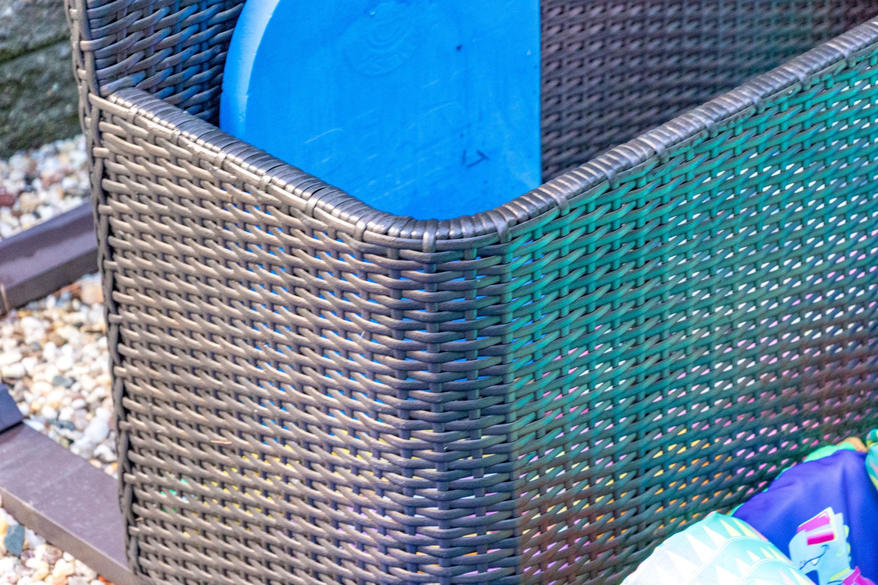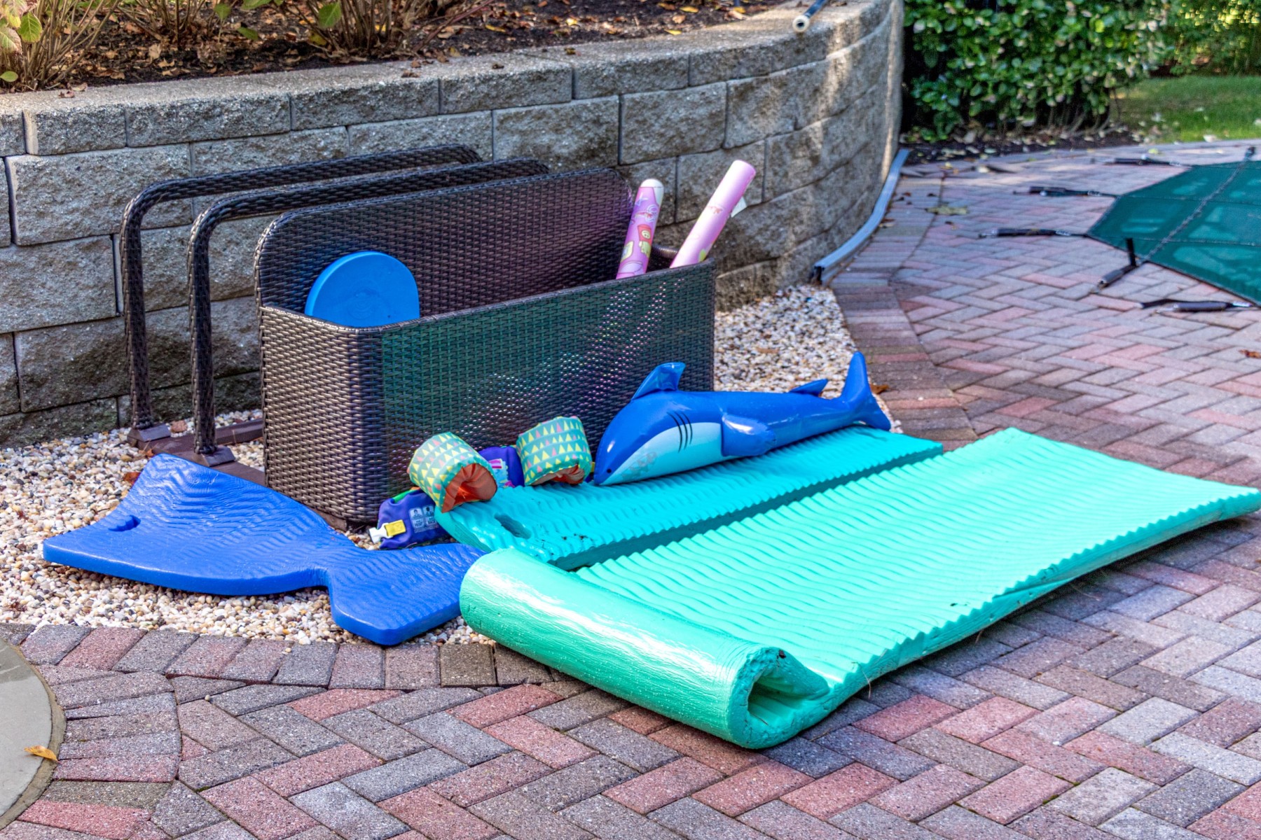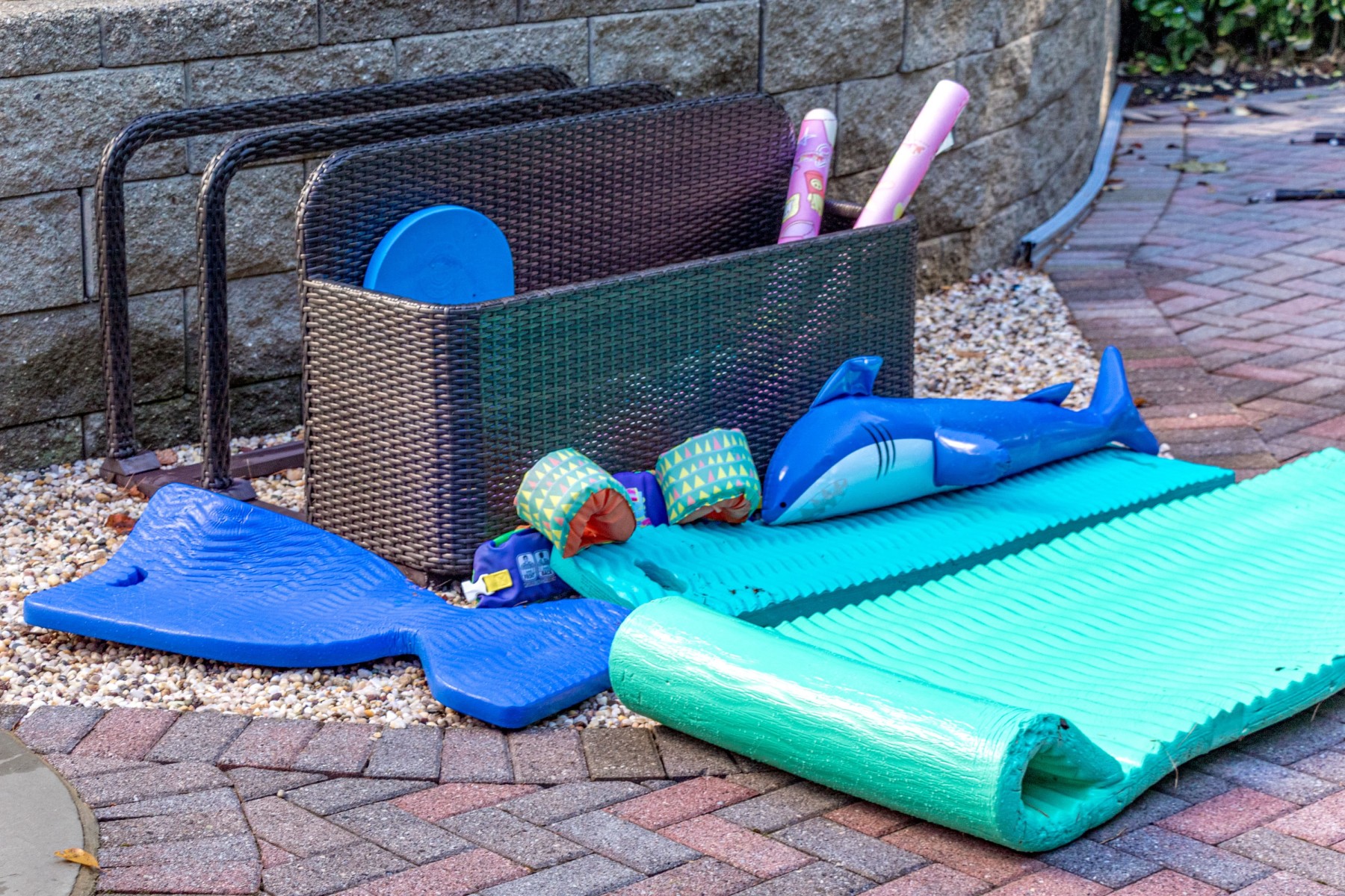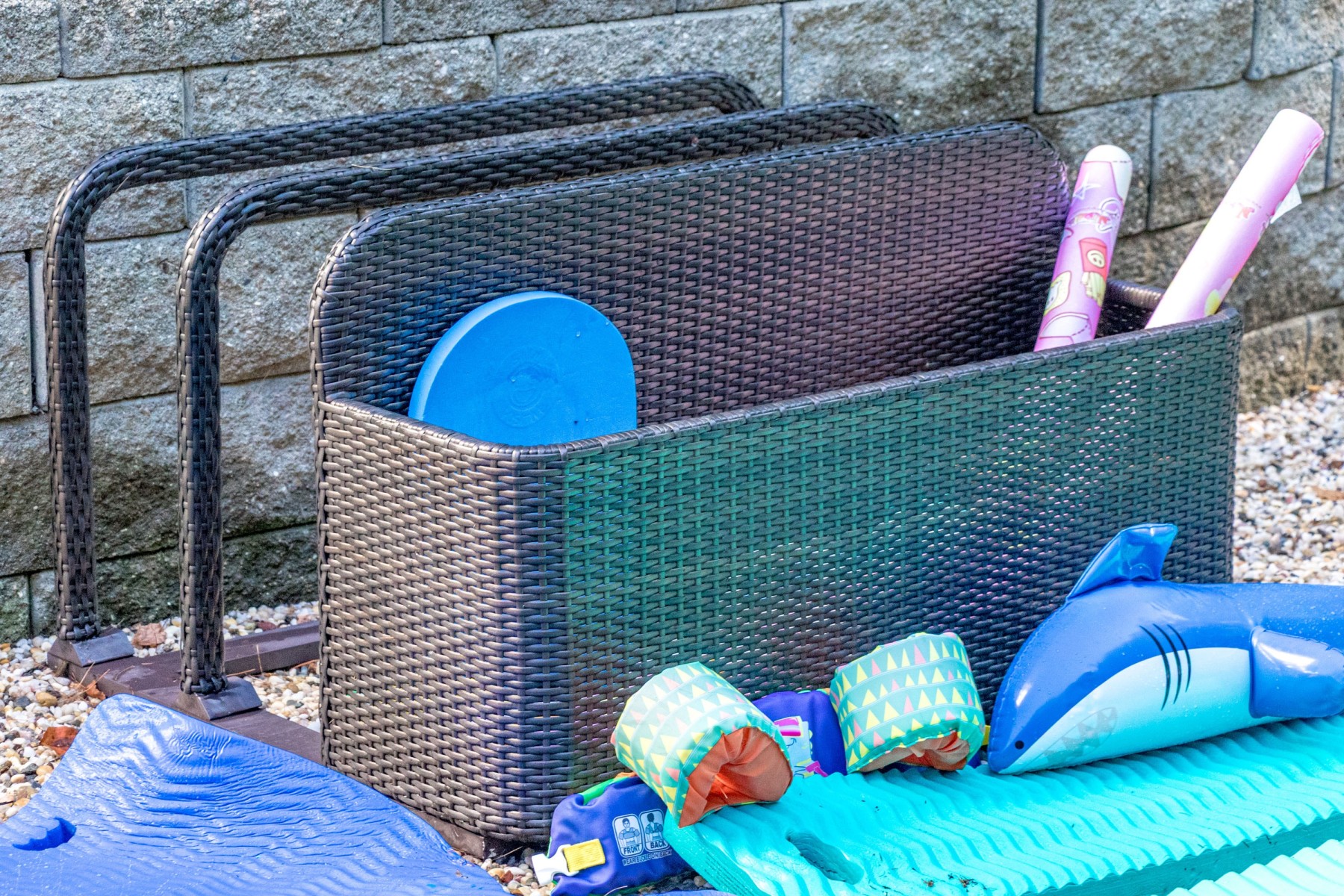 With divided sections for pool related wares with front basket. Together with pool toys and floats, some sold from Frontgate.
