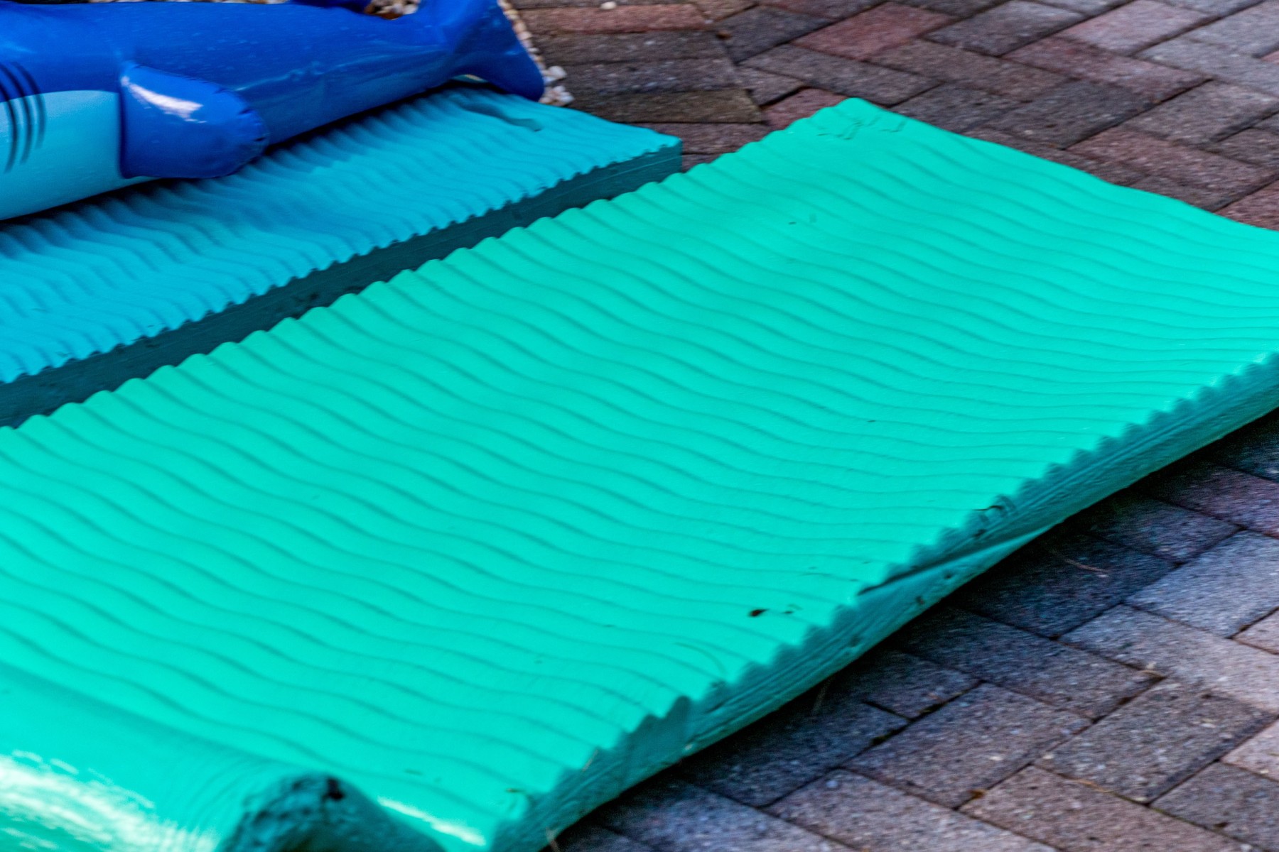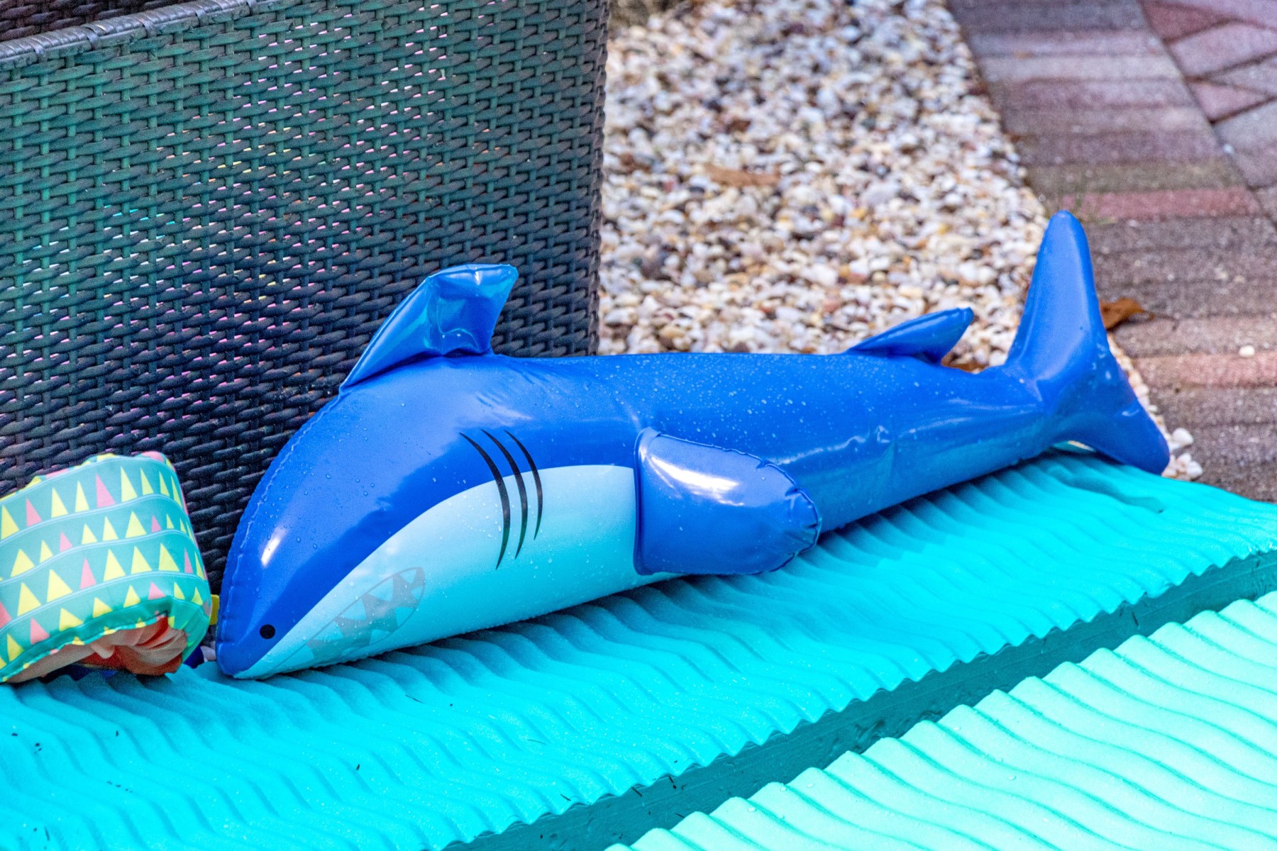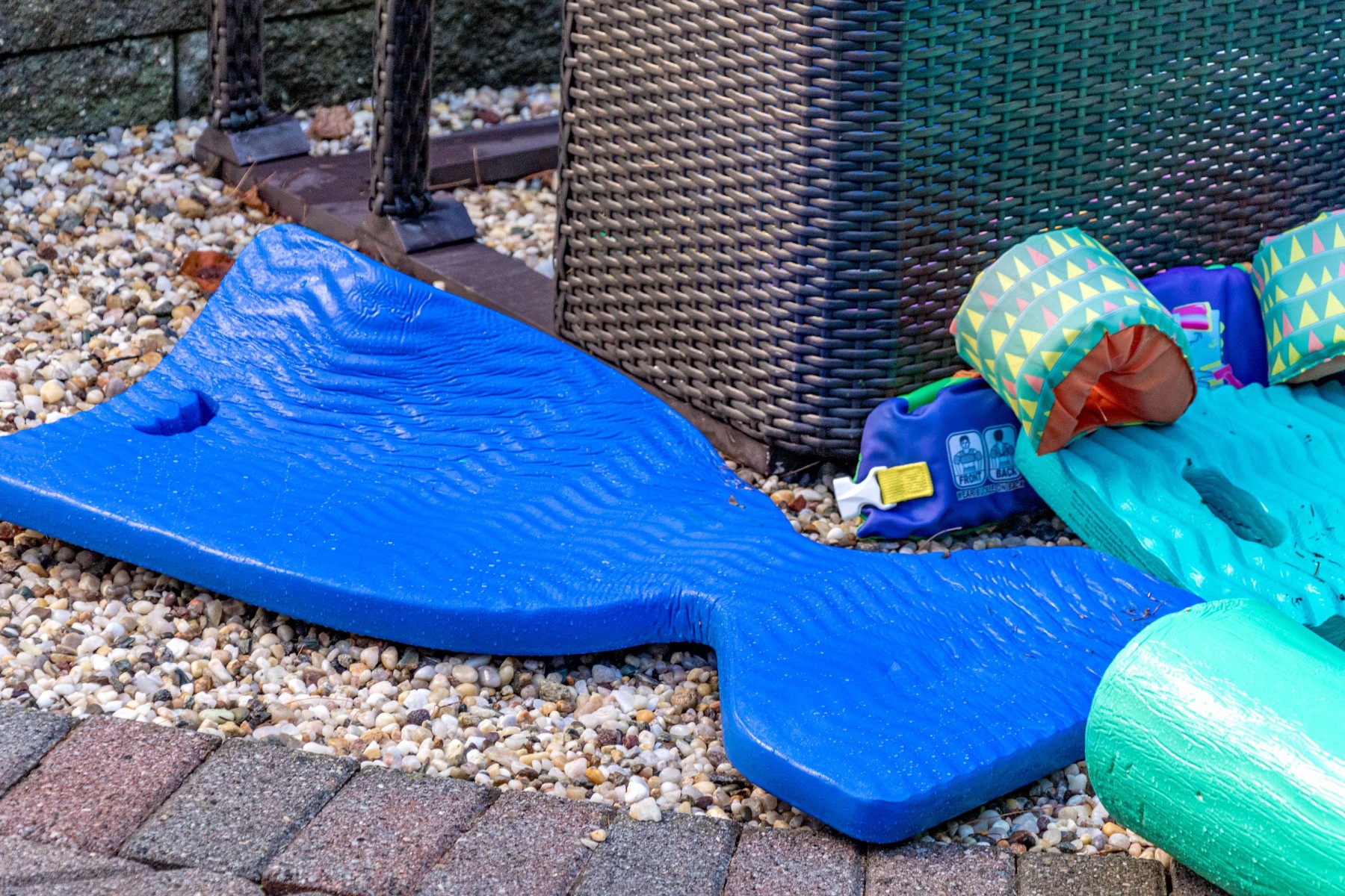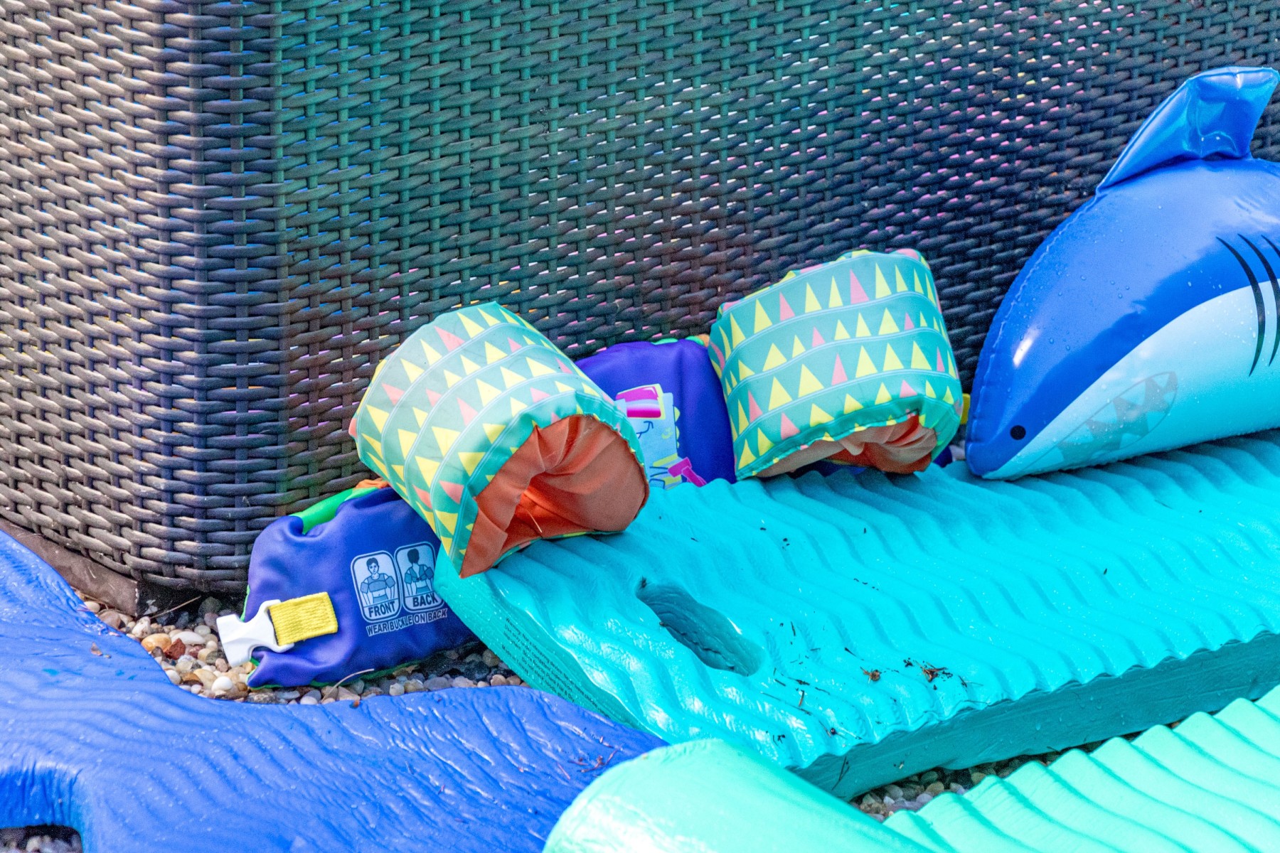 With divided sections for pool related wares with front basket. Together with pool toys and floats, some sold from Frontgate.