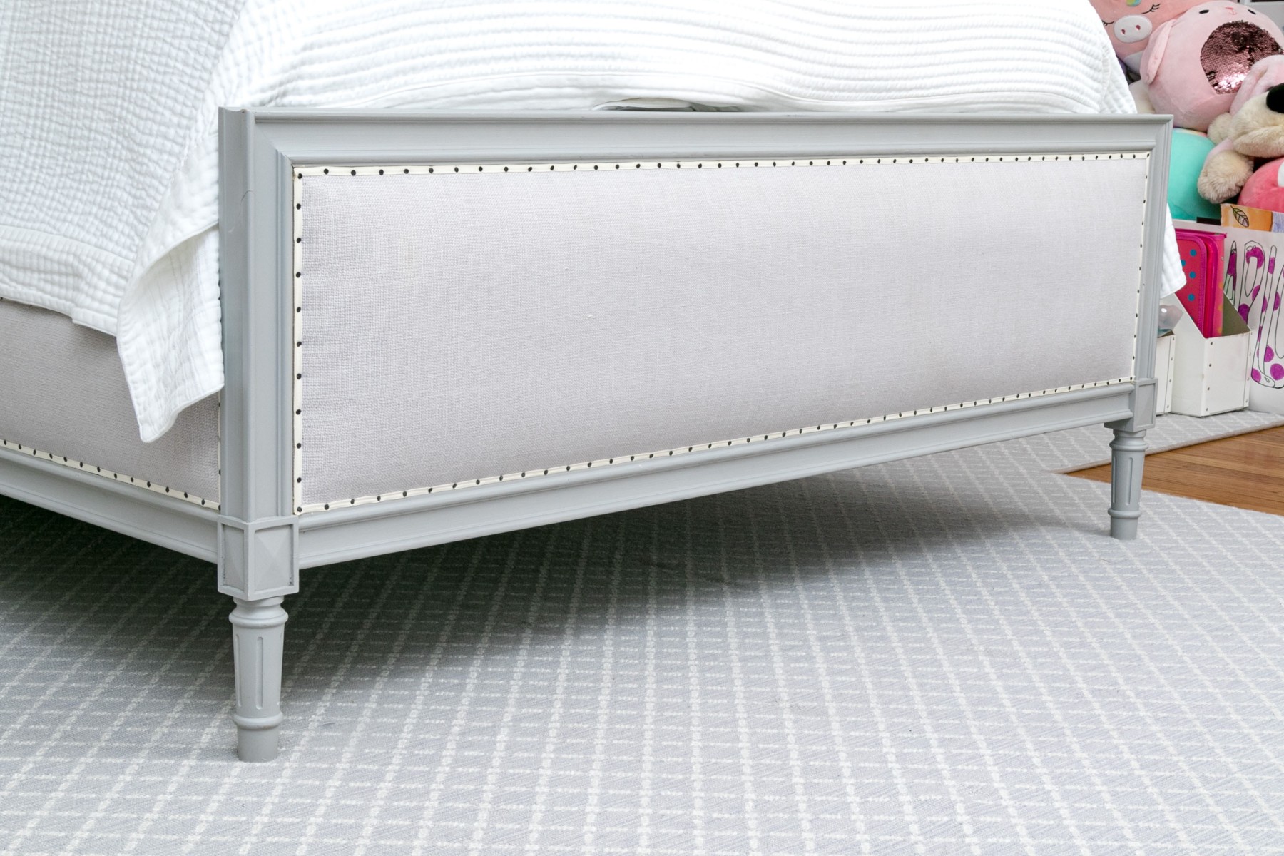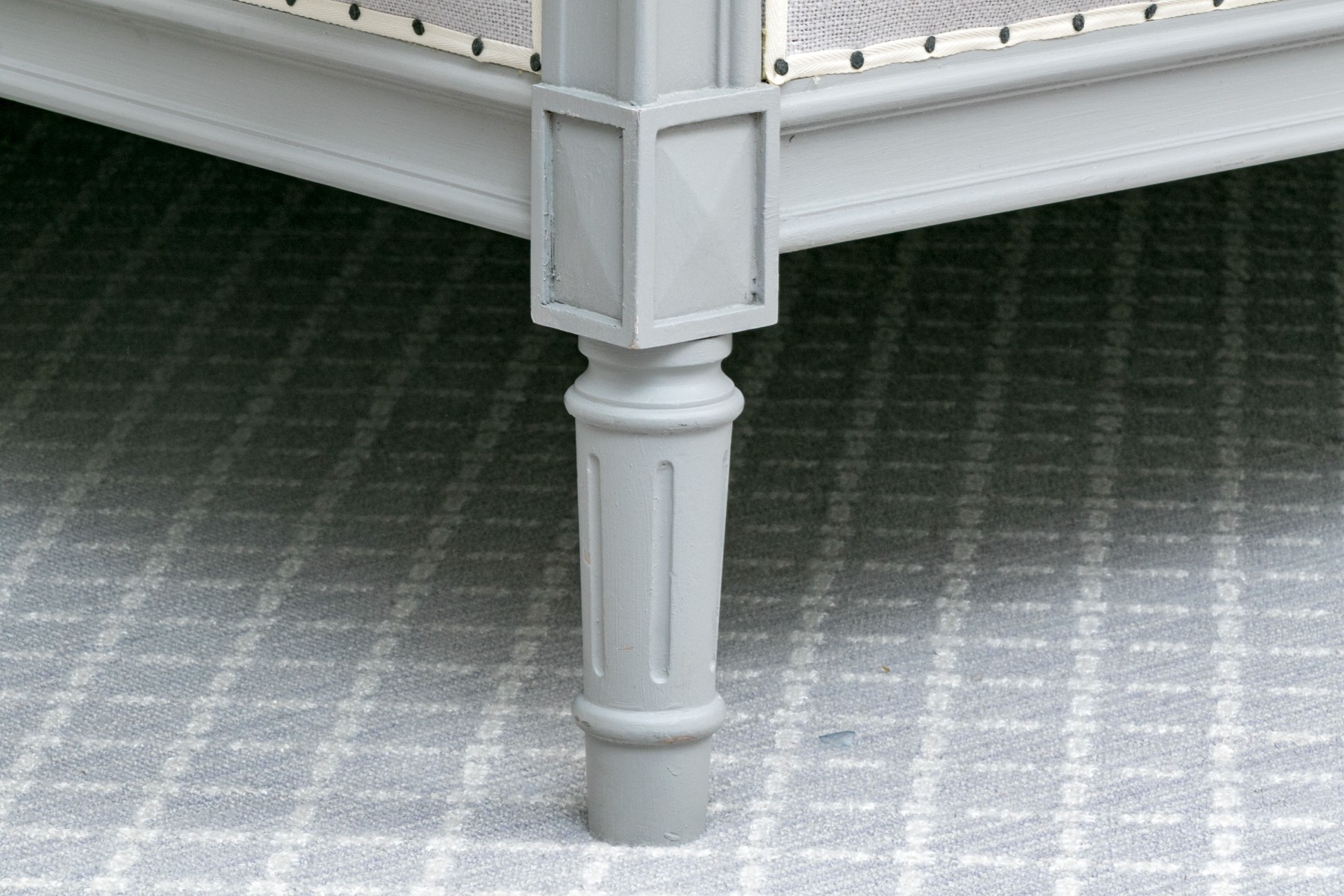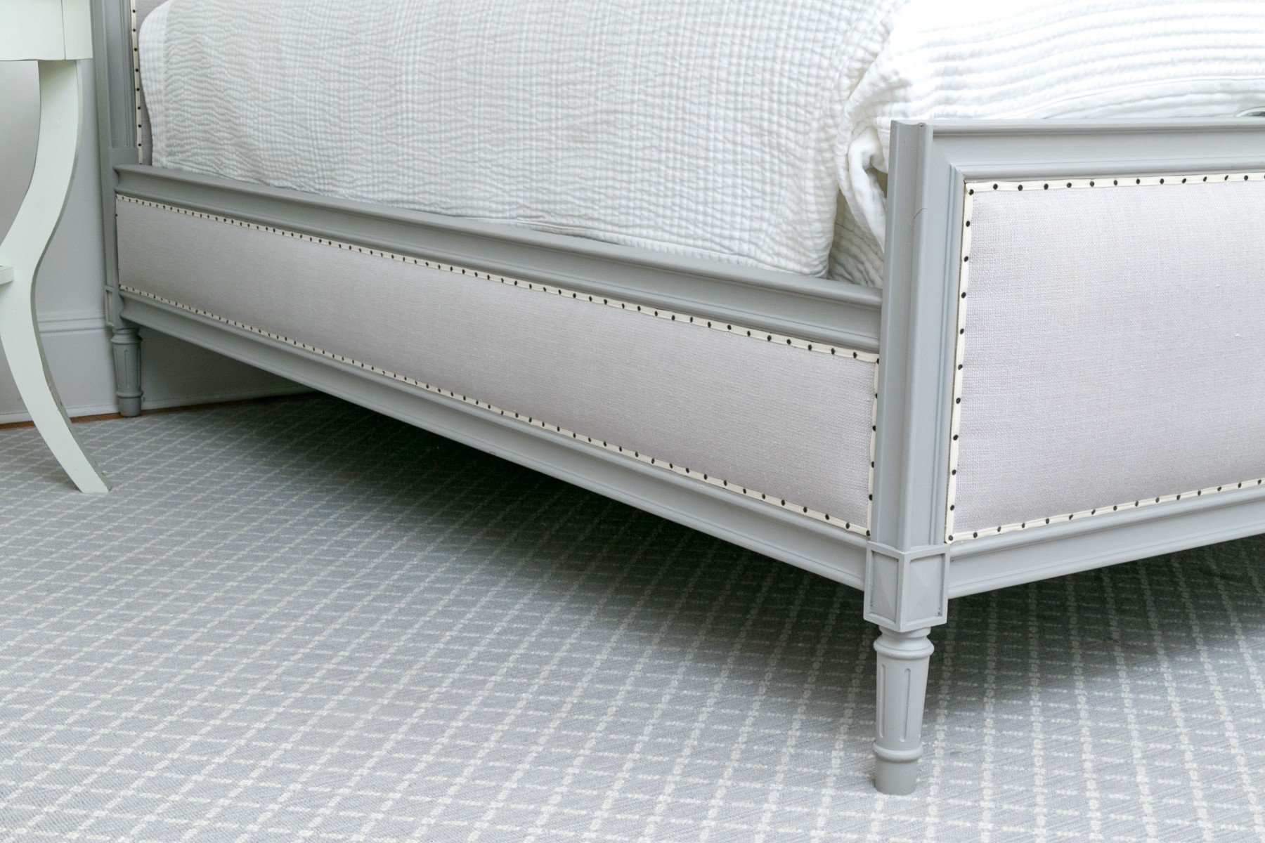 A full sized bed frame with a large grey upholstered headboard having a nailhead trim along with a footboard raised on reeded and grey painted legs. Mattress not included.