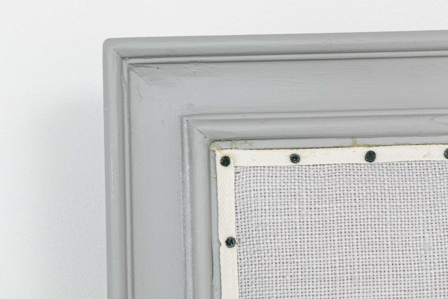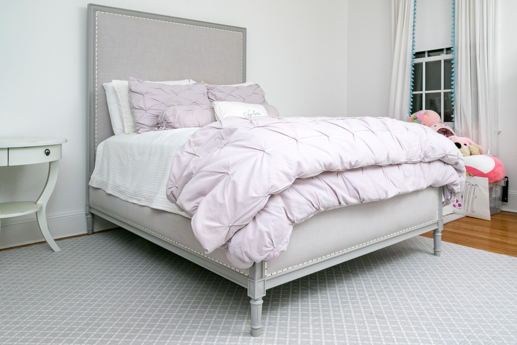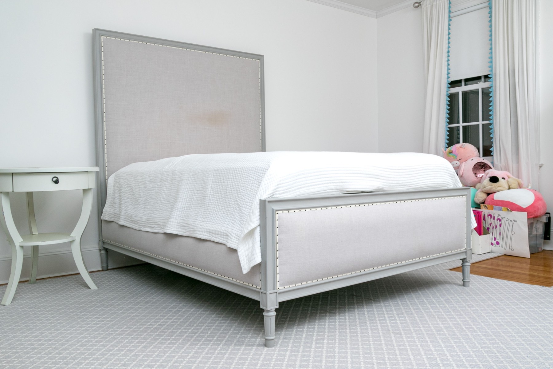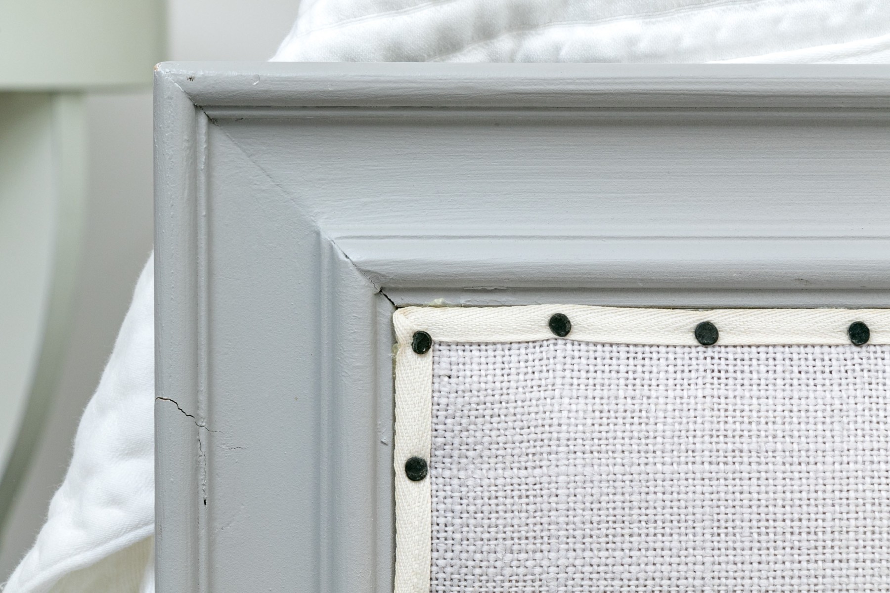 A full sized bed frame with a large grey upholstered headboard having a nailhead trim along with a footboard raised on reeded and grey painted legs. Mattress not included.