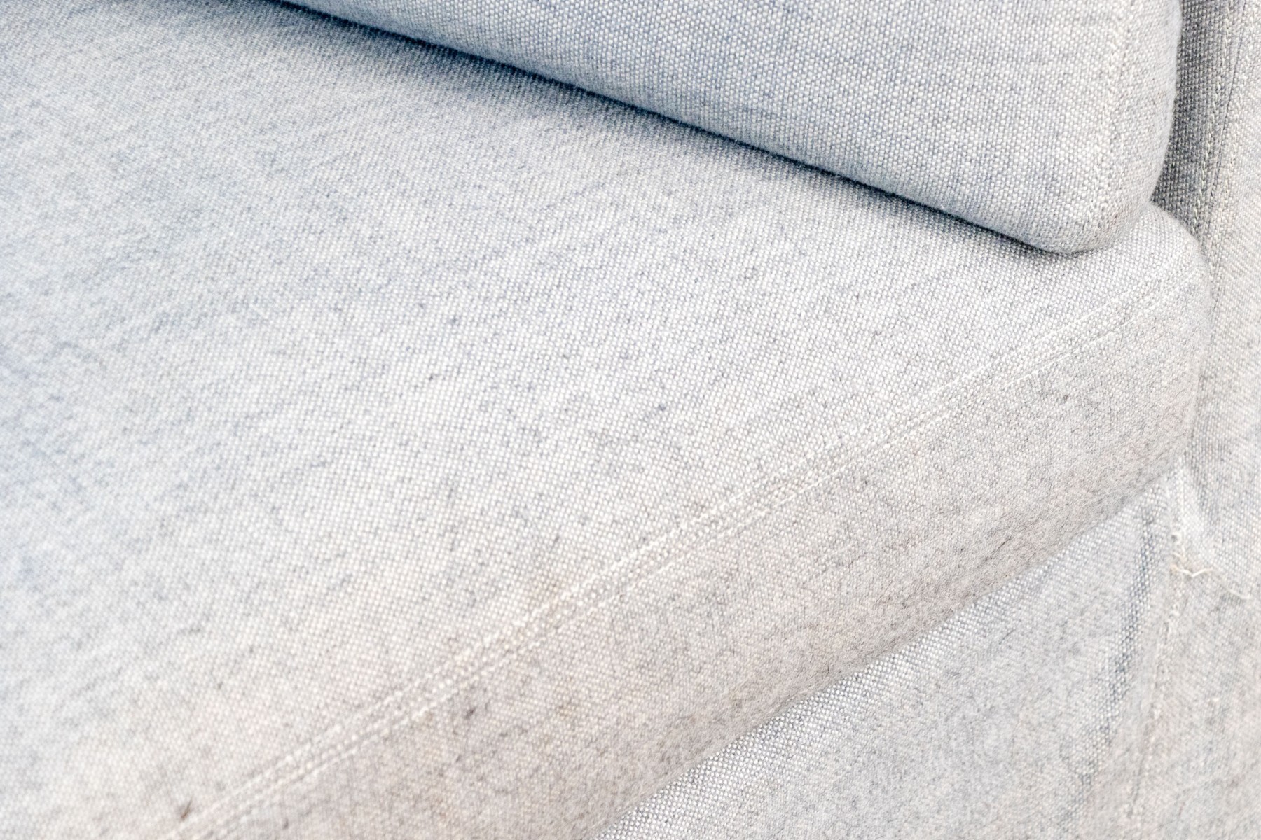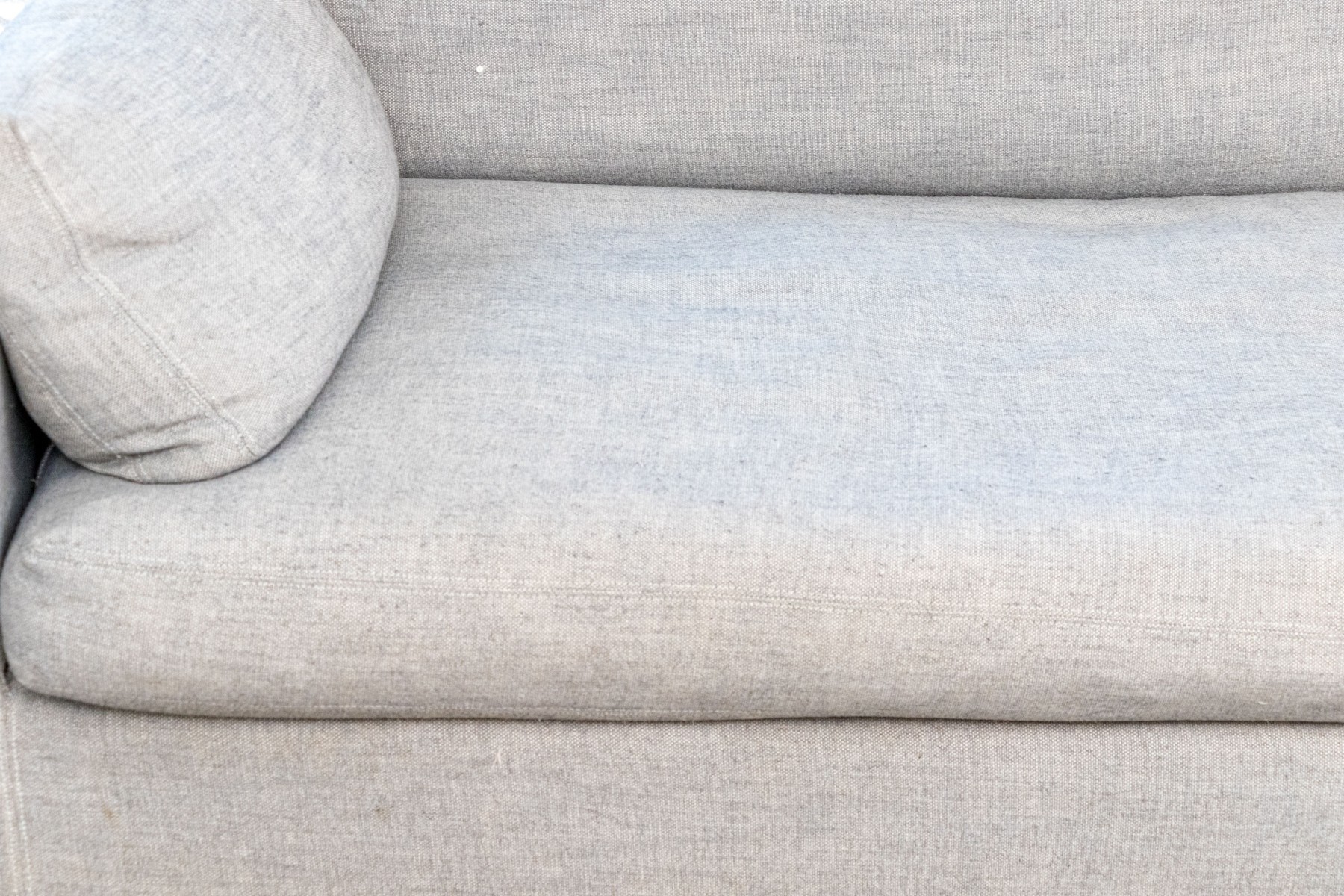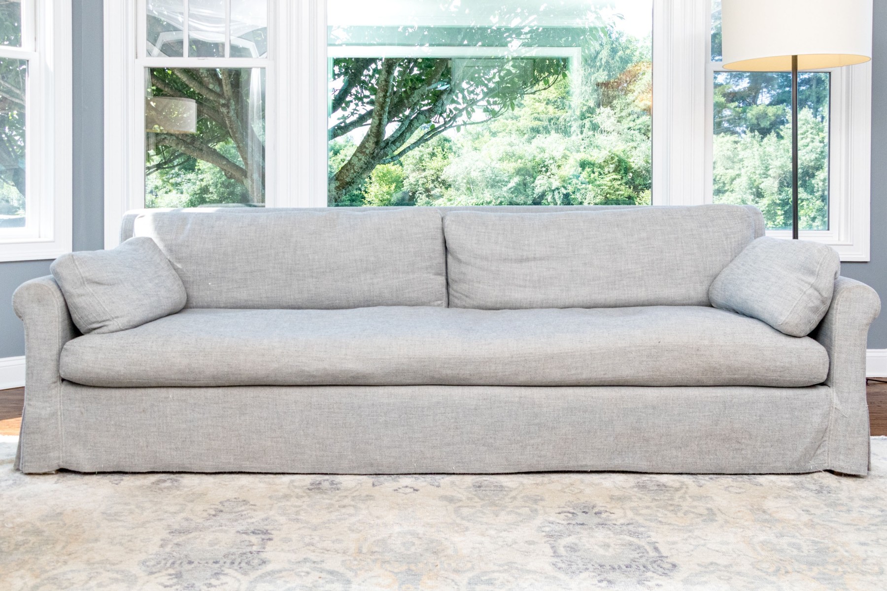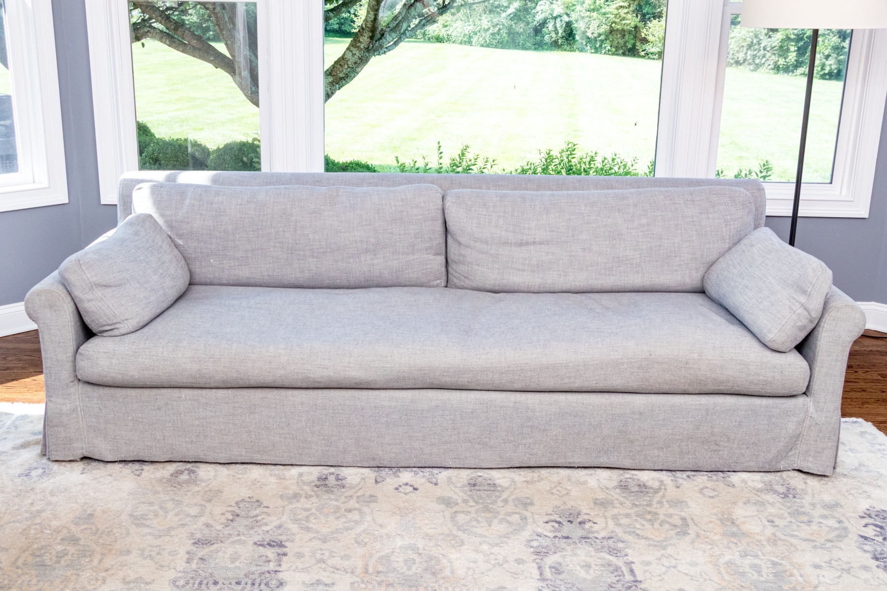 A high quality Restoration Hardware Belgian Classic sofa in great transitional style, covered in a neutral gray slipcover. Designed with a straight wedge back, rolled arms, two long loose back cushions and a long bench seat cushion along with two accent pillows. Finished with a skirt concealing the legs beneath.