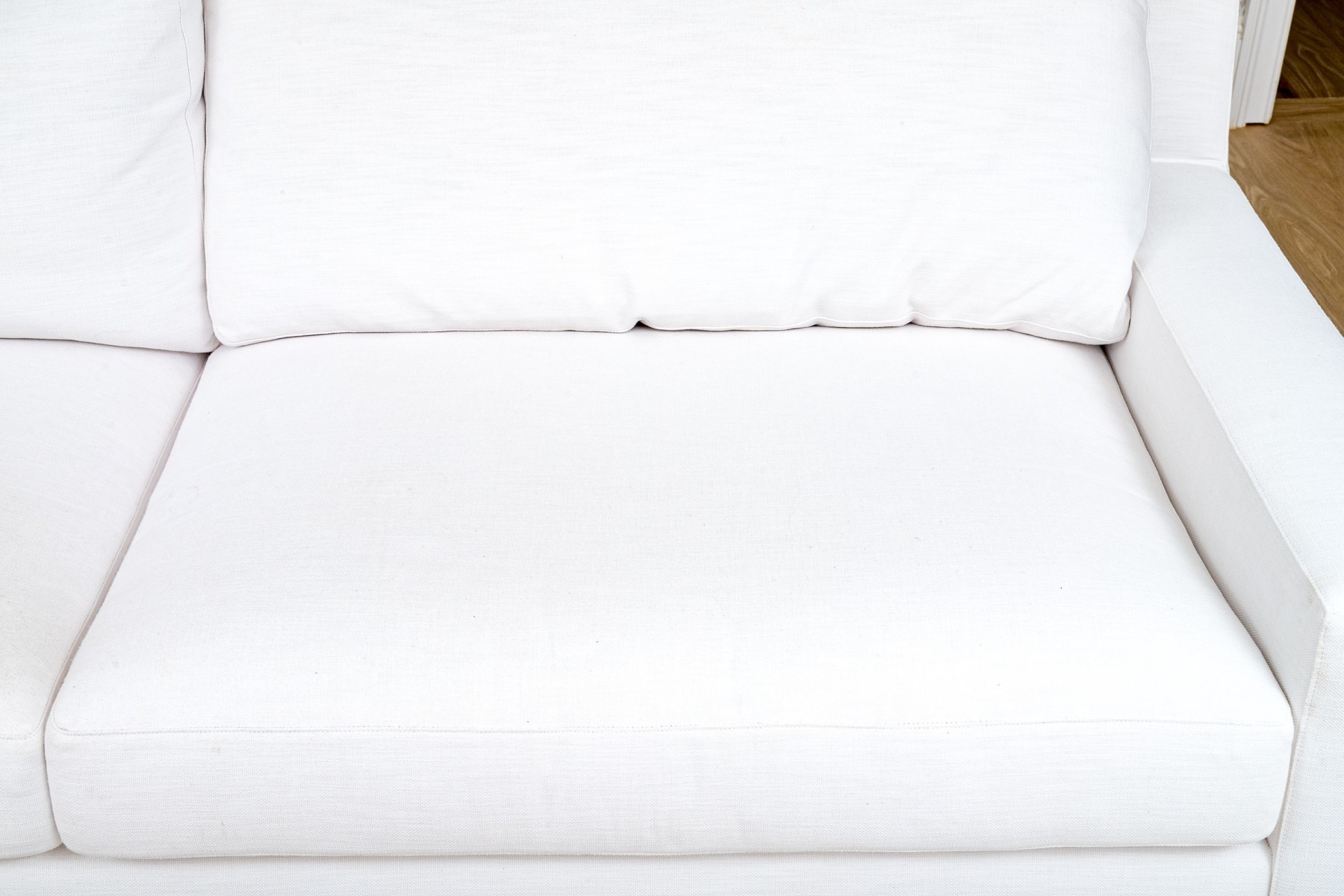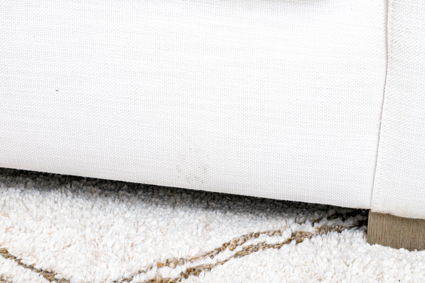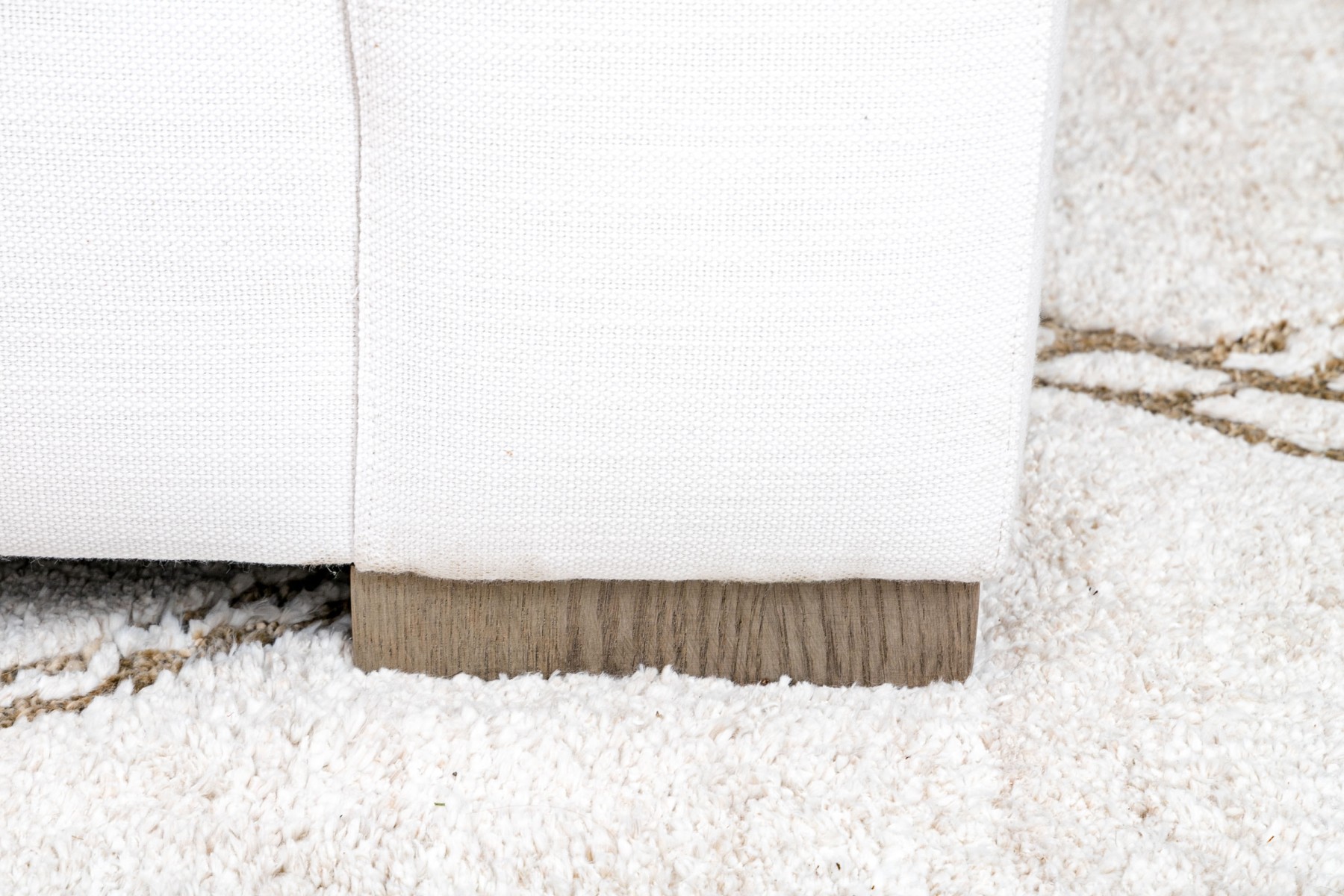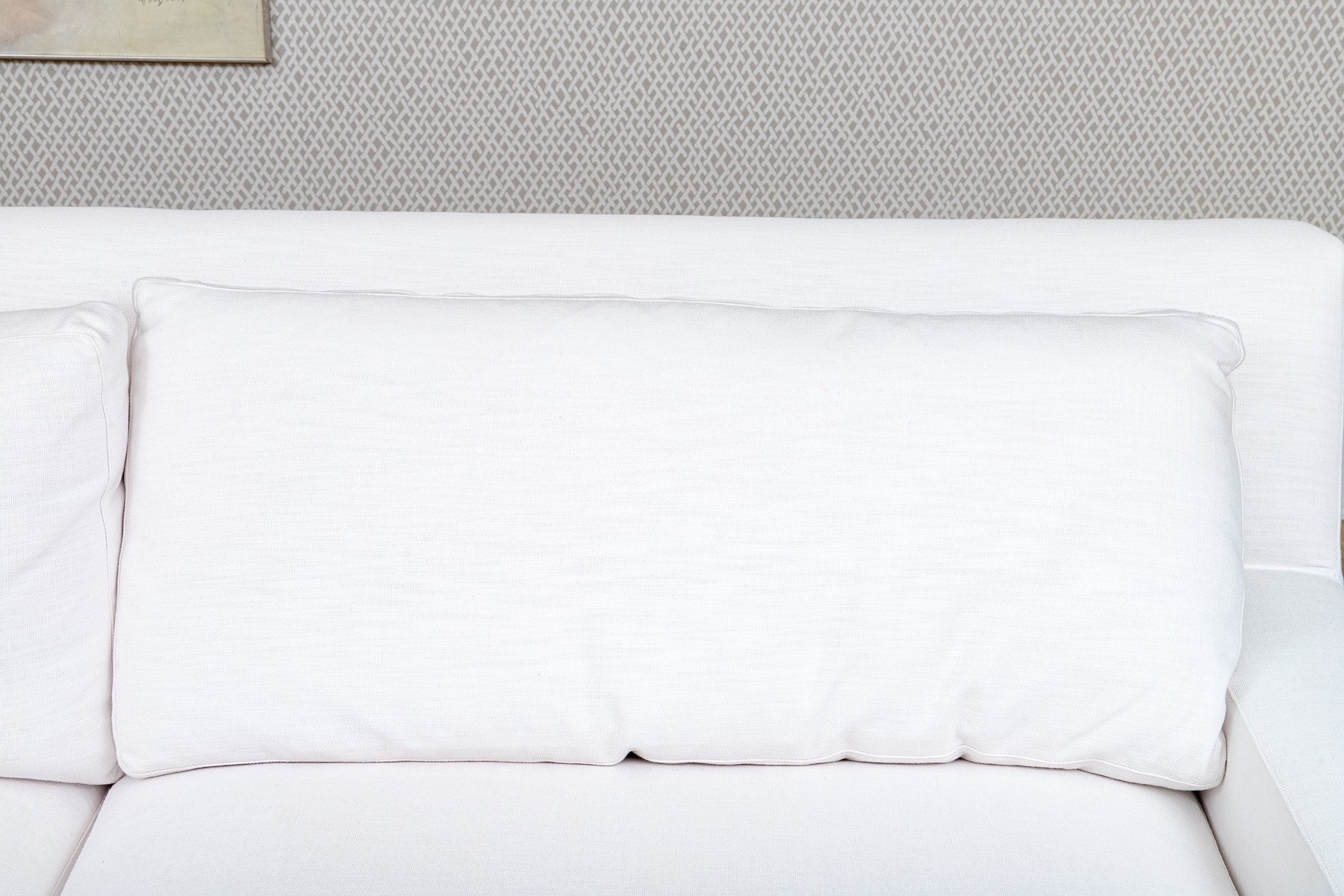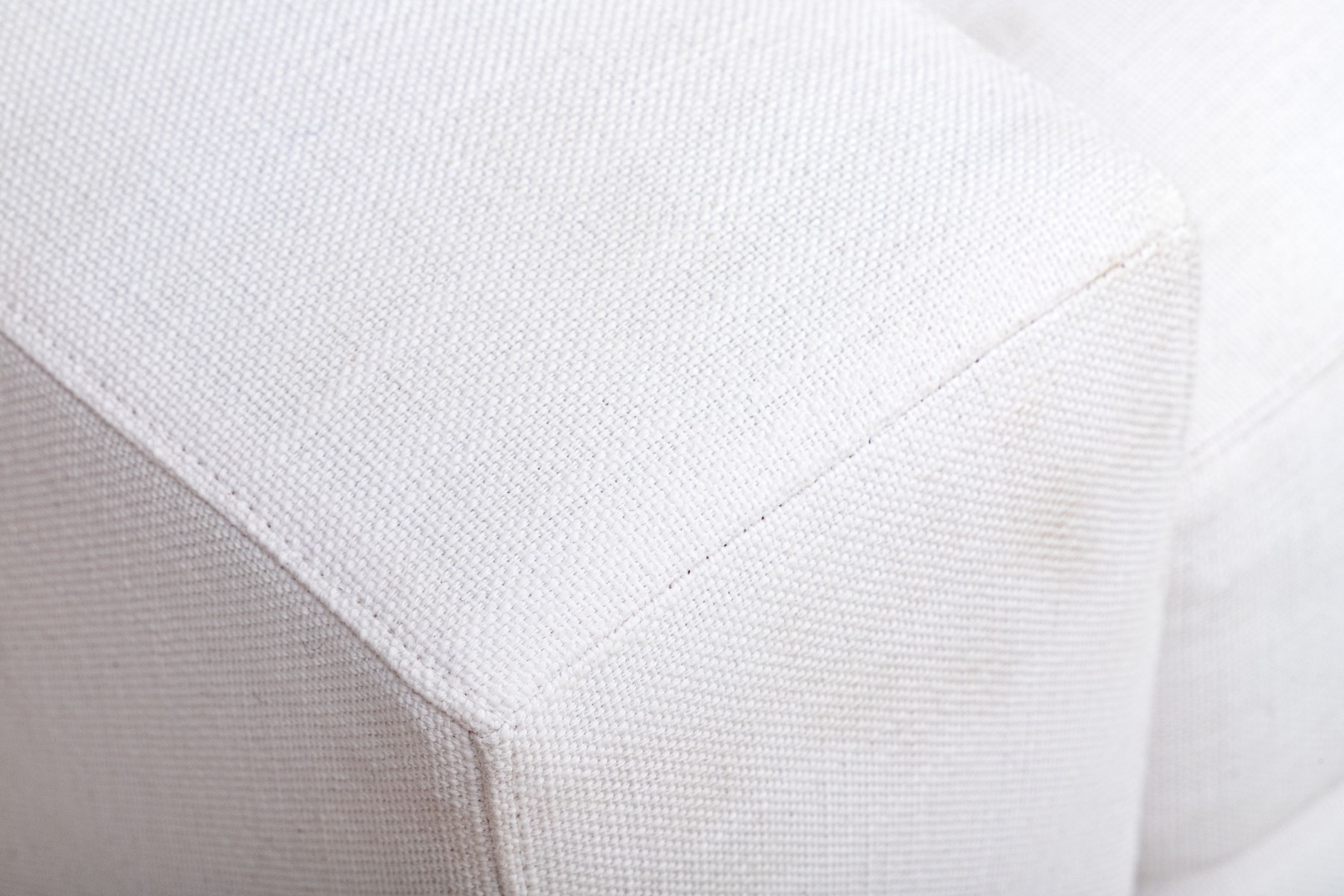 On four short square feet with two large upholstered pillows to the seat and two long upholstered pillows to the seat back.