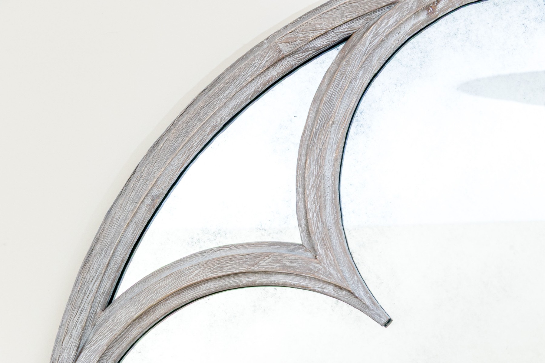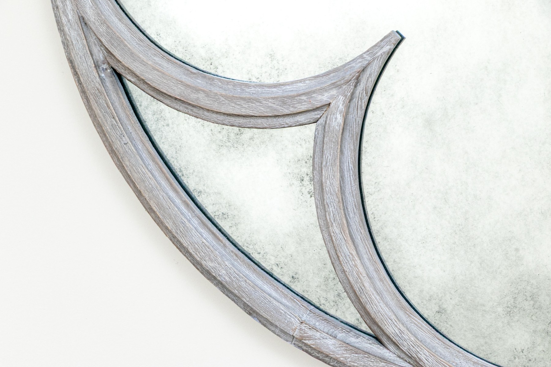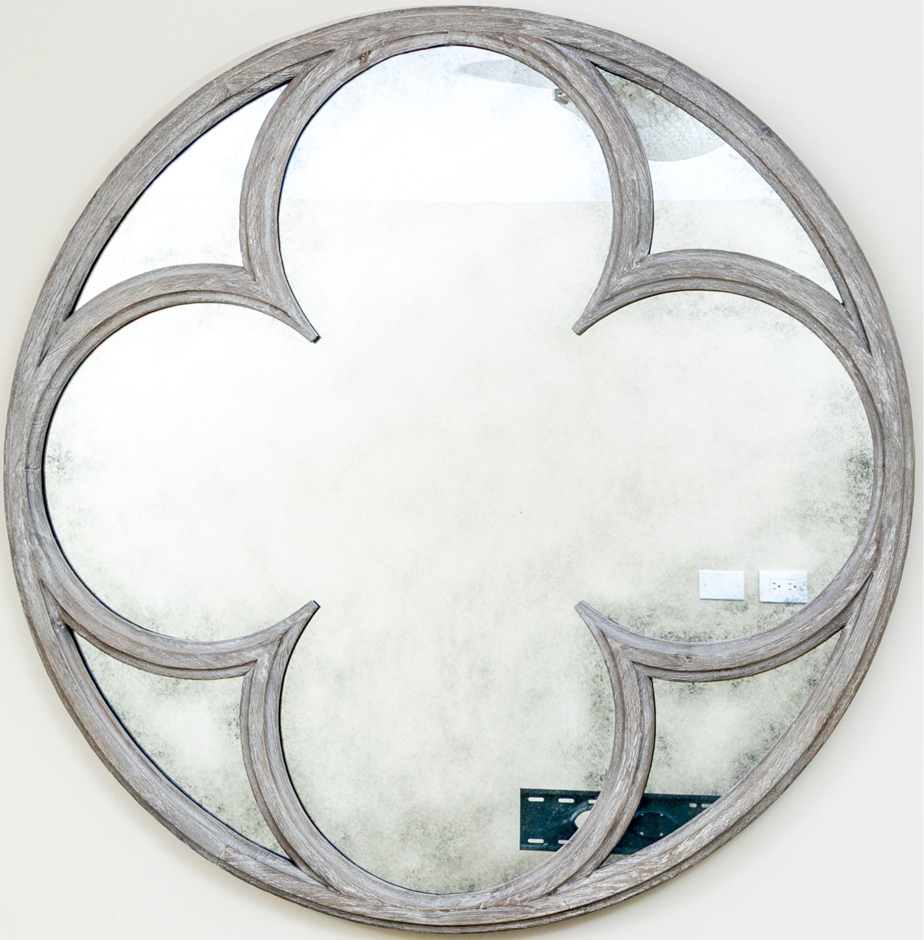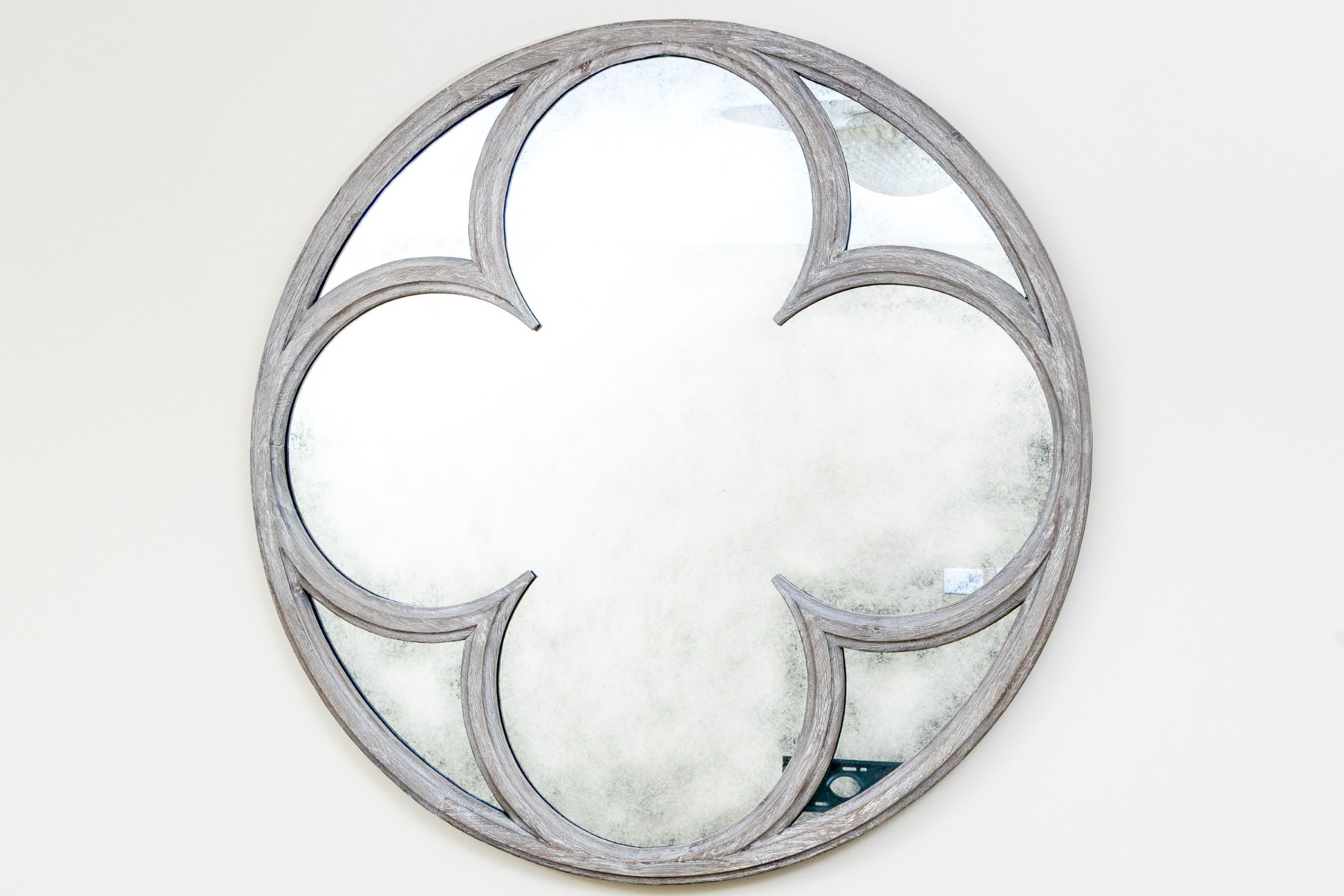 A delightful circular mirror with a quatrefoil bordered center in a rustic gray-washed wood frame.