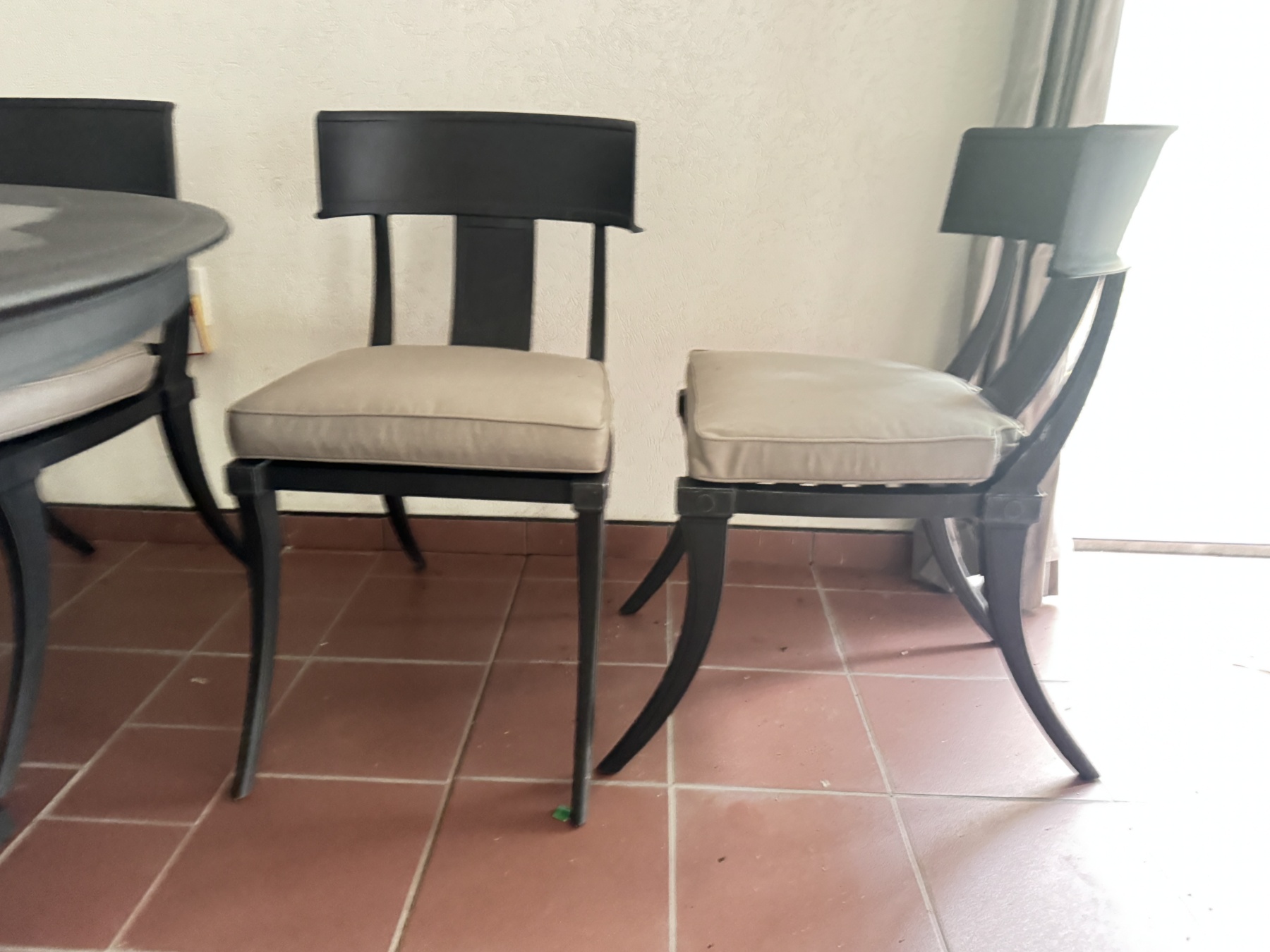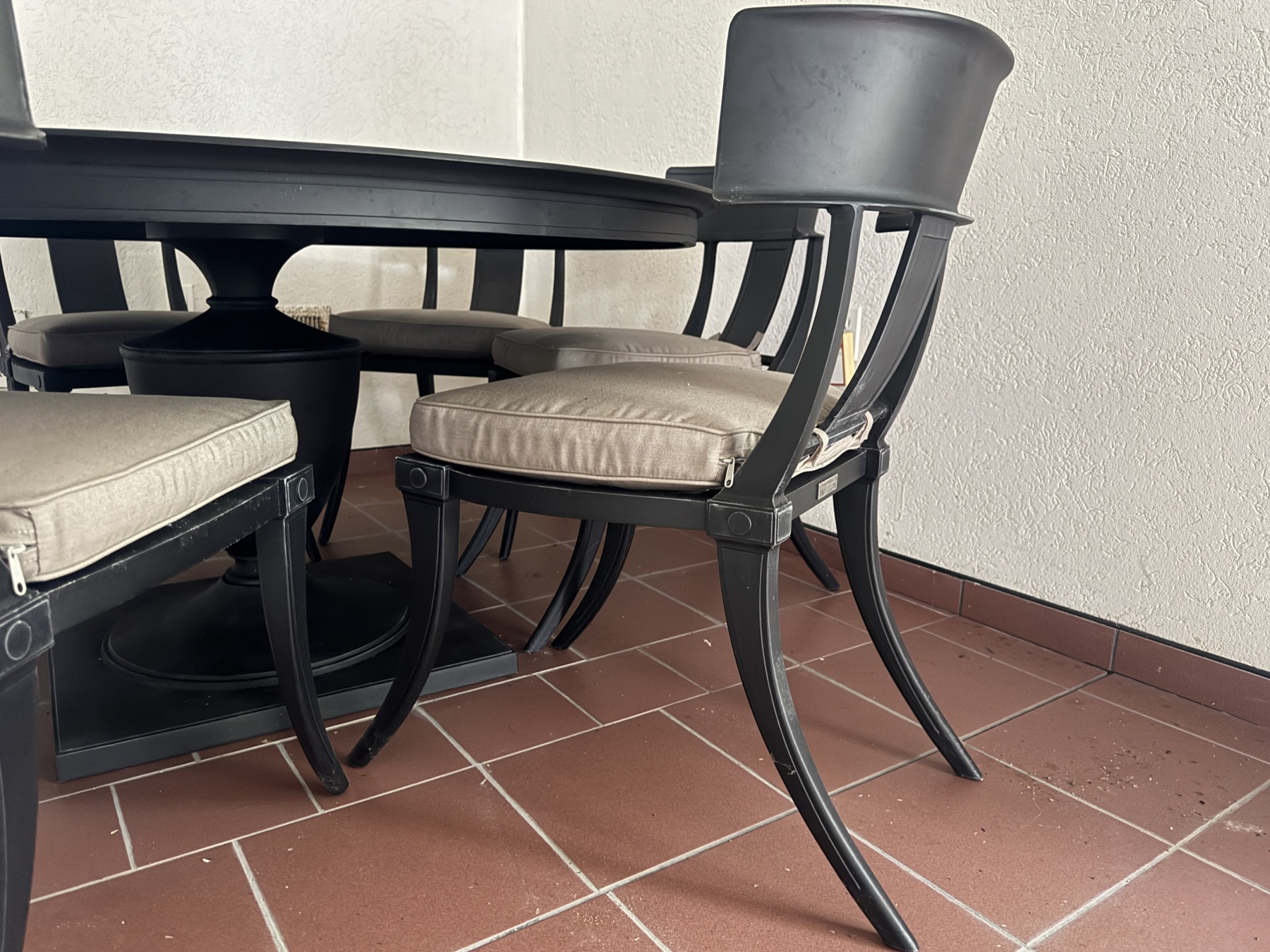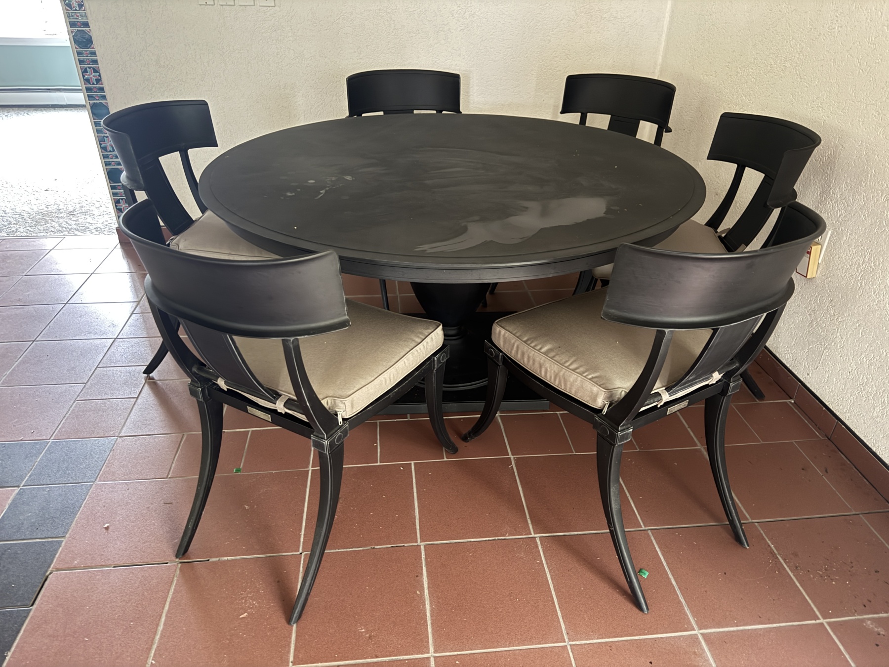 An excellent Restoration Hardware "Klismos" collection dining suite in cast aluminum suitable for both indoor and outdoor use. The table features a generous 5' diameter across the circular top, supported by an elegant urn form pedestal with a circular foot over a square base. Accompanied by six chairs in classic Greek design, showcasing rectangular tablet backs with gently curved rectangular splats and side rails. Chairs are topped with taupe cushions and raised over saber legs.