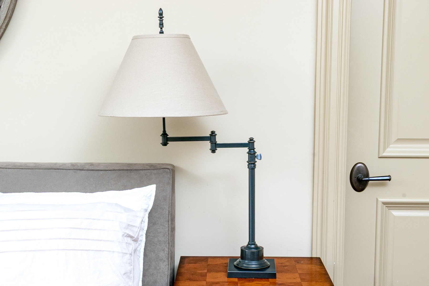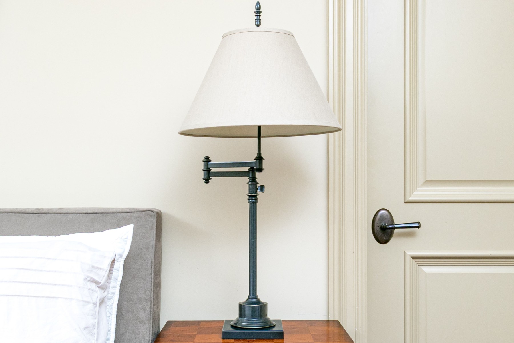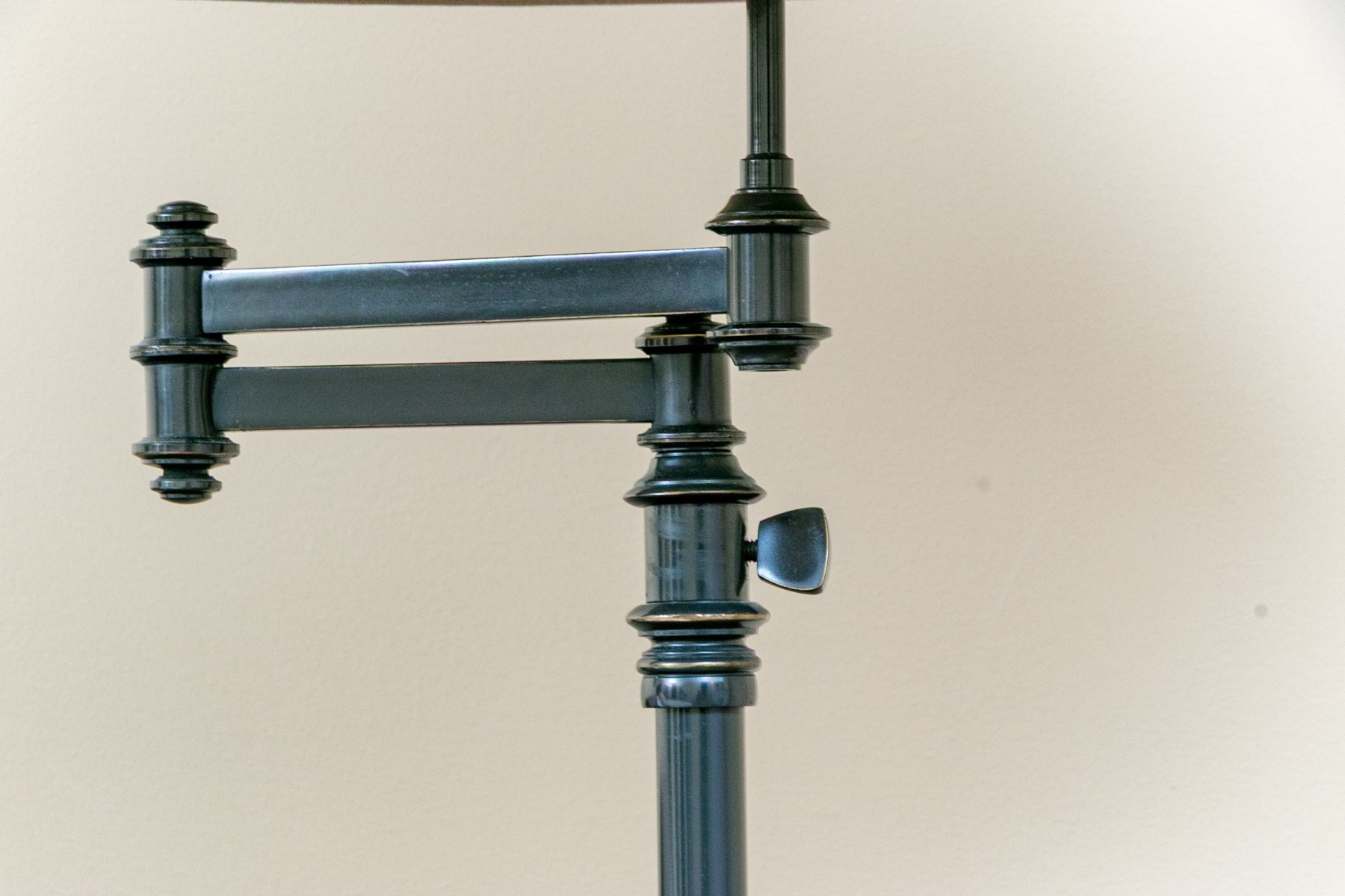 A stylish Restoration Hardware "Library Swing-Arm" table lamp with great vintage and industrial charm. Well designed with a tall turned finial and pale taupe fabric empire shade surmounting an adjustable swing arm over a sleek cylindrical column reaching a circular foot with a square base.