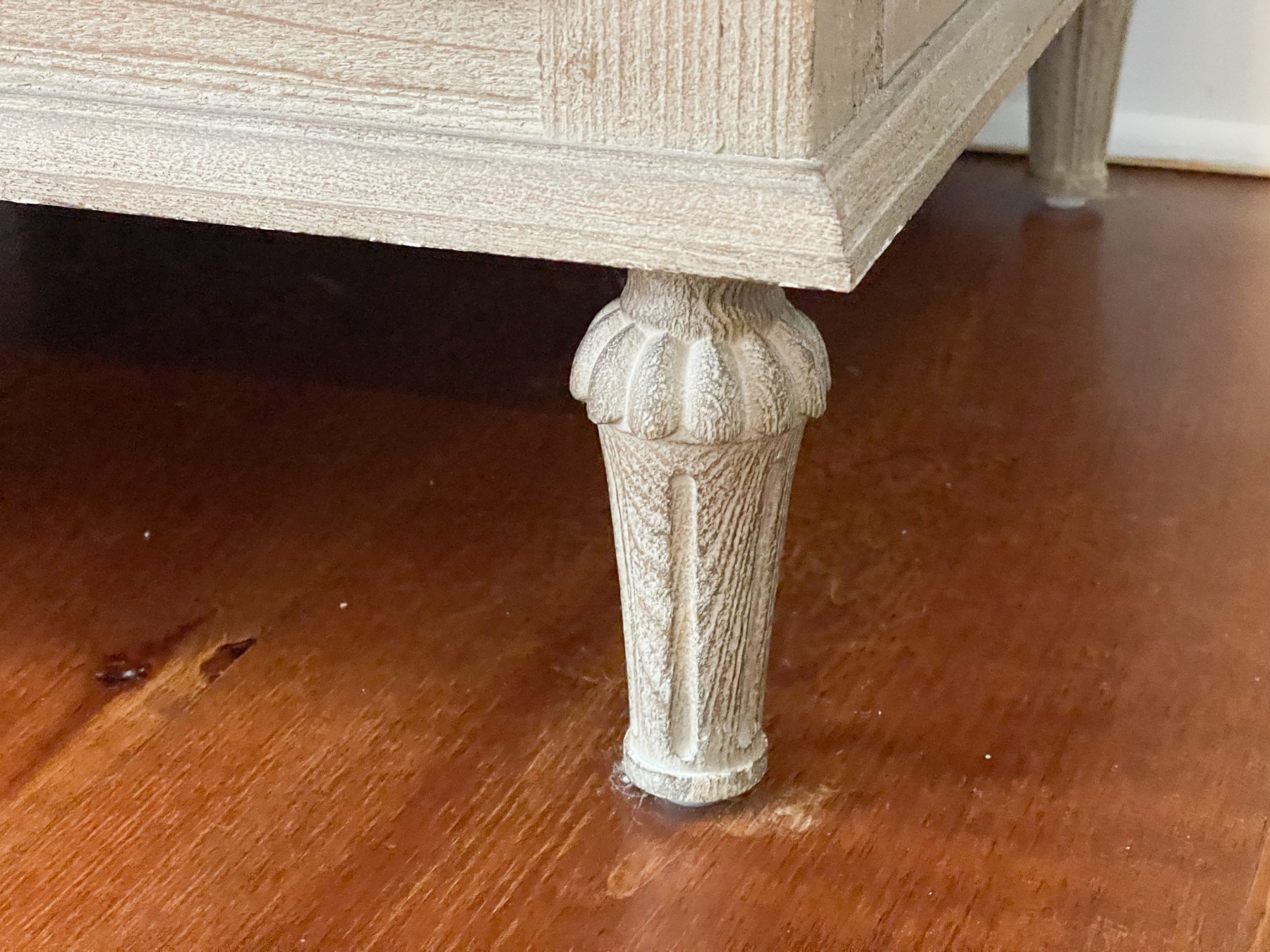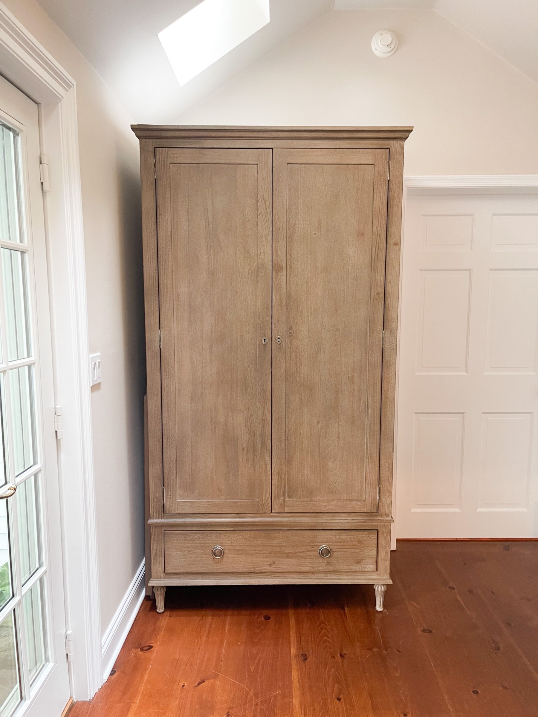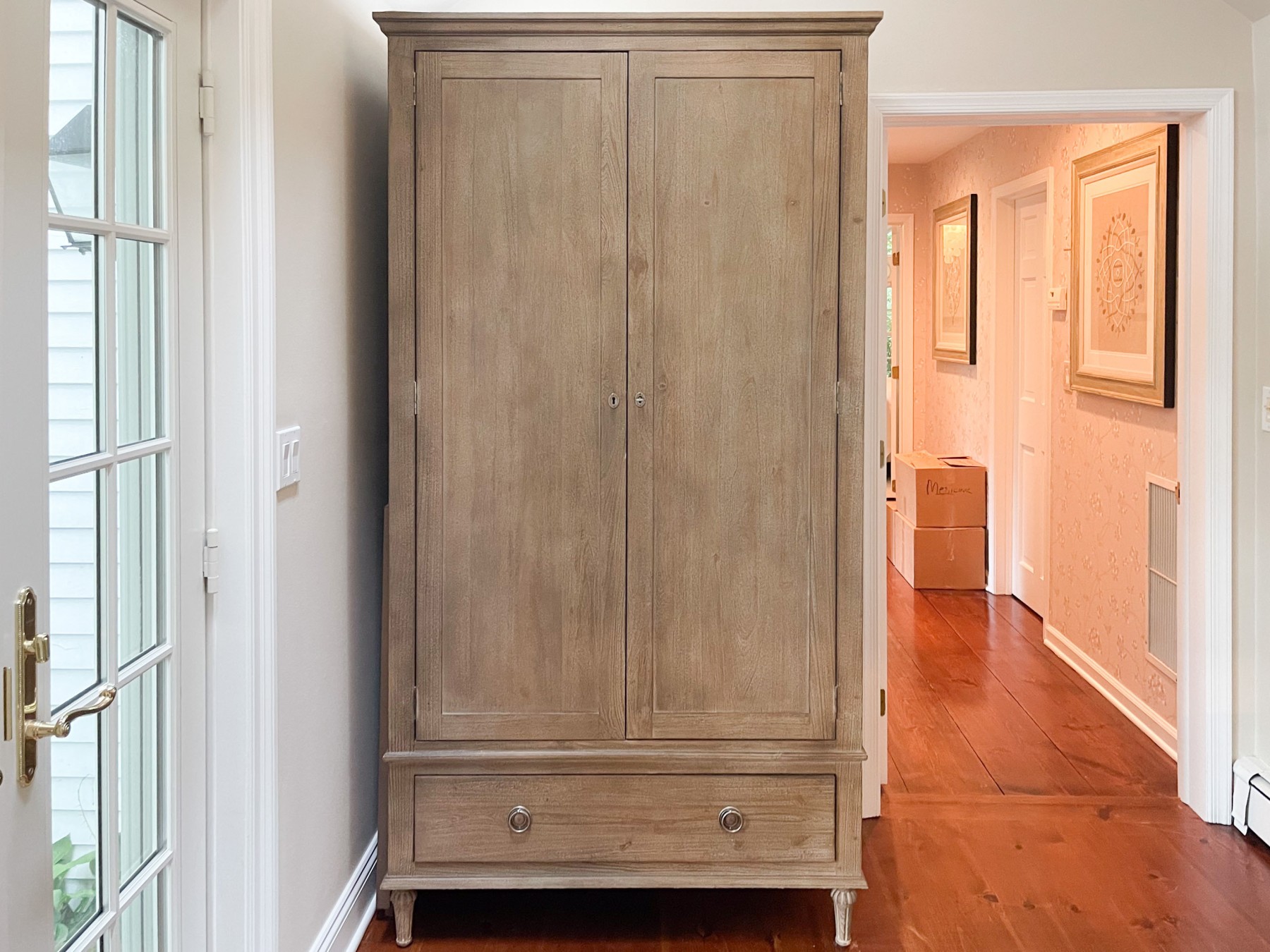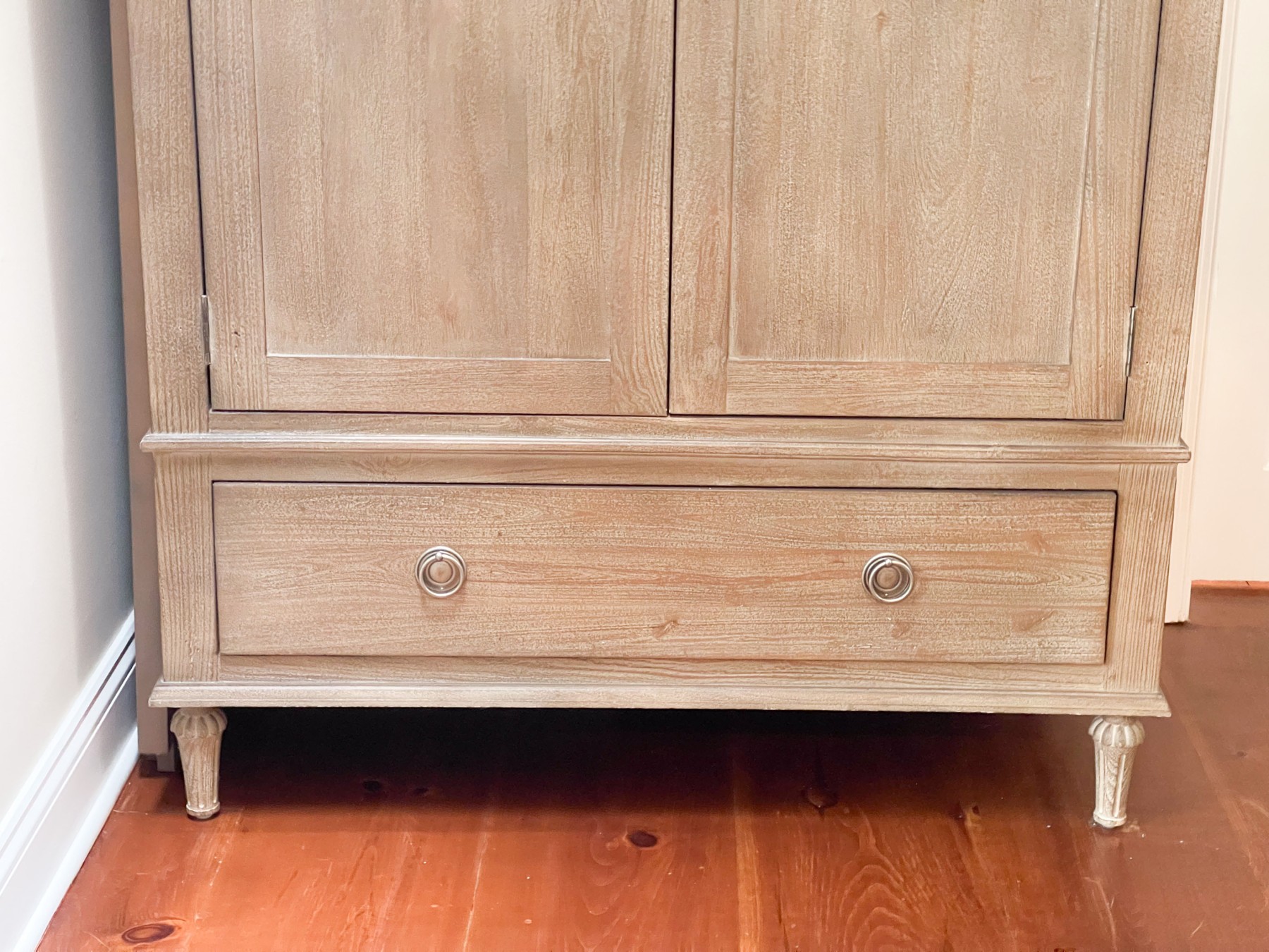 Drawing inspiration from 18th C. French furniture, the armoire has wonderful aesthetics mirroring its inspiration. Crafted from solid hardwood with a handsome finish. The case is raised on four carved short turned legs.