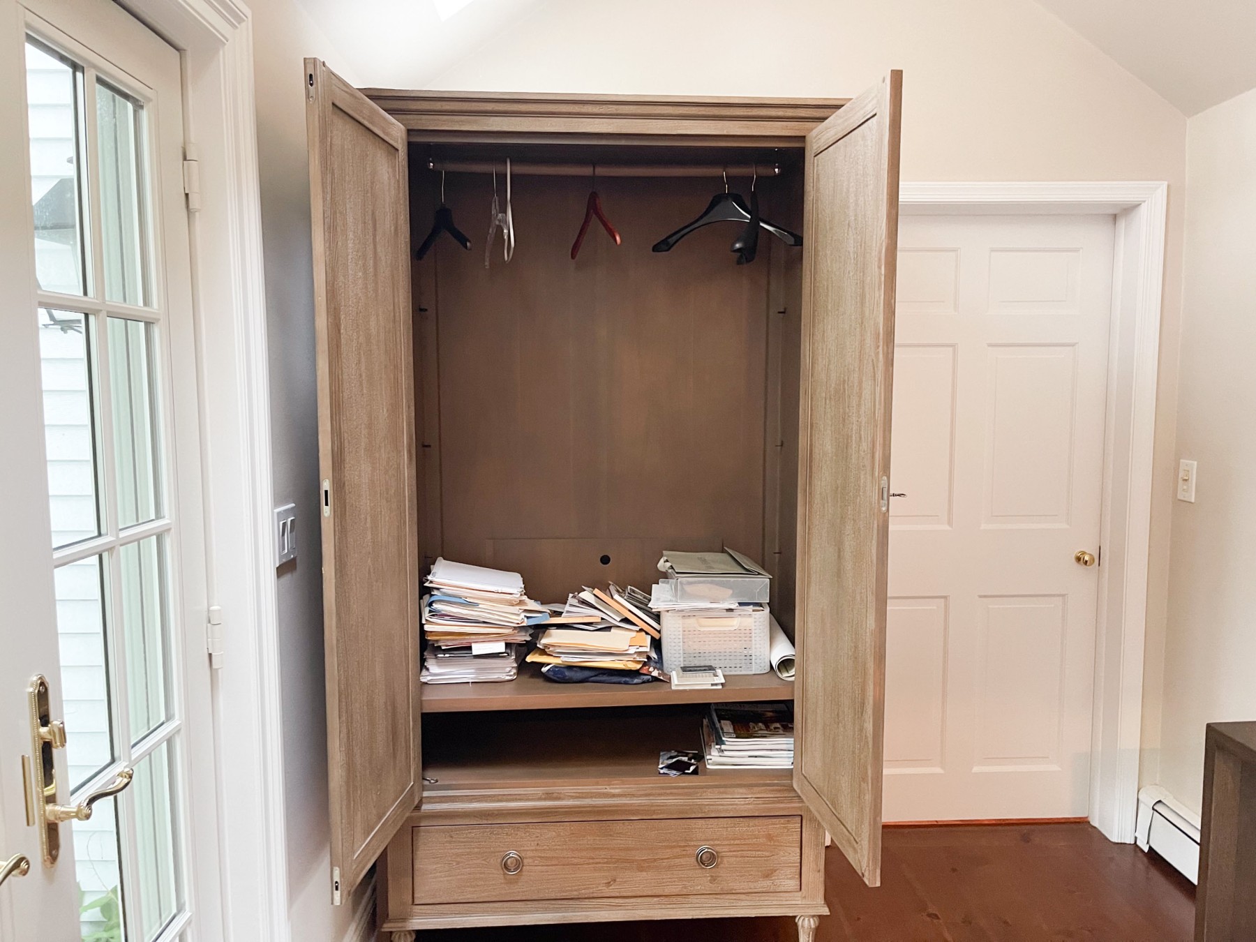 The armoire can be used as an entertainment armoire with four adjustable shelves and wire space for wires to be strung through.