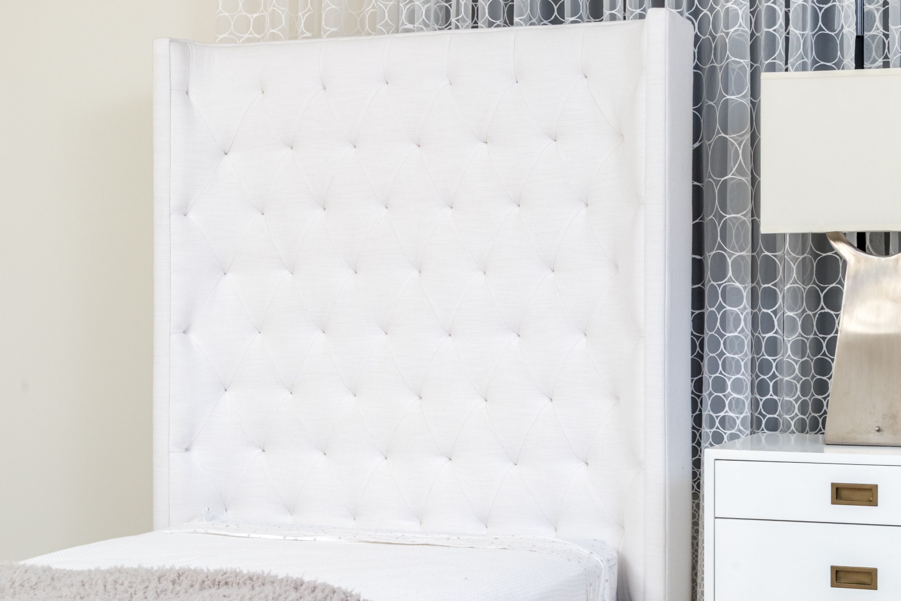 A wonderful Restoration Hardware Teen "Zadie" twin size bed frame designed with a chic, extra tall upholstered headboard in white button tufted fabric with bracketed sides leading down to low side rails and a flush height footboard raised on dark brown feet.