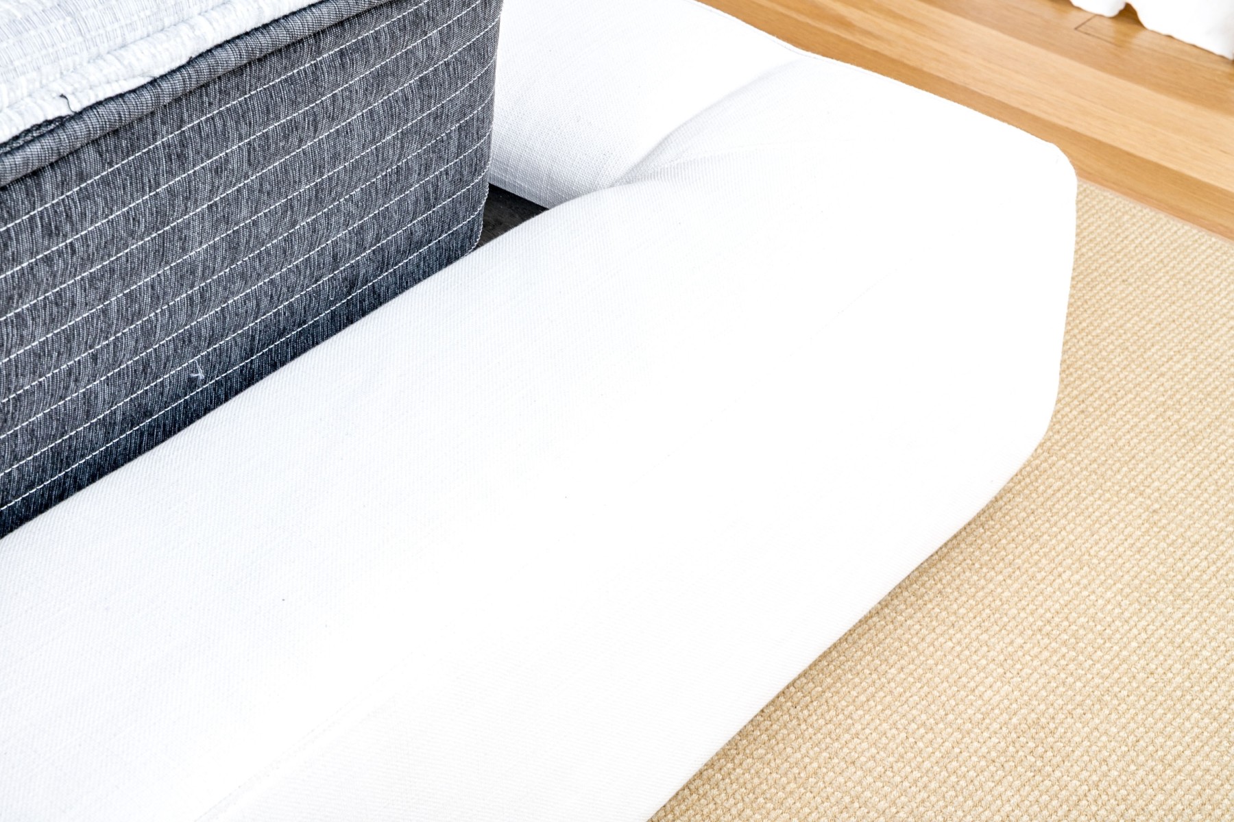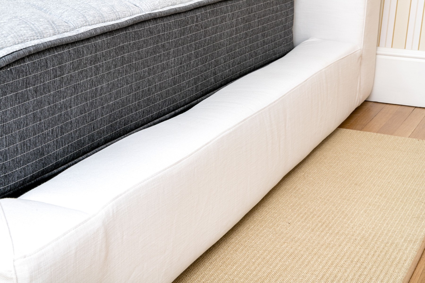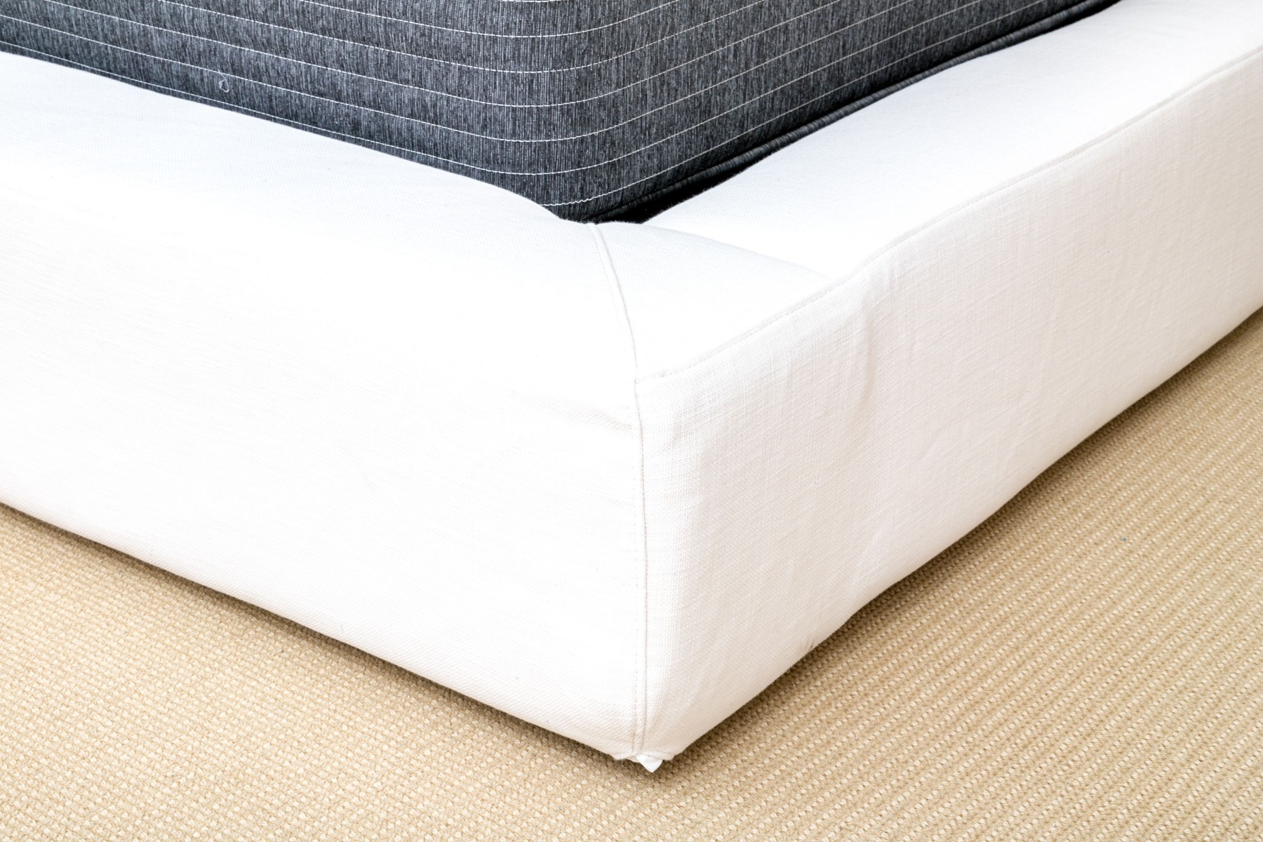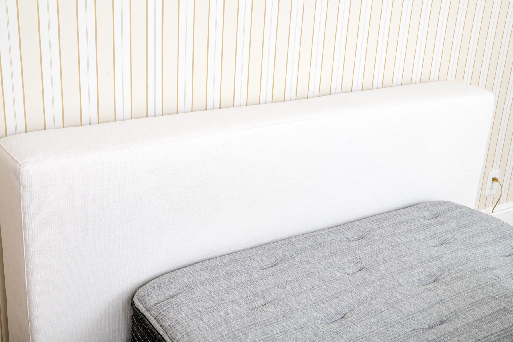 Handsomely upholstered in a white-cream hued upholstery with a straight headboard and minimalistic base.